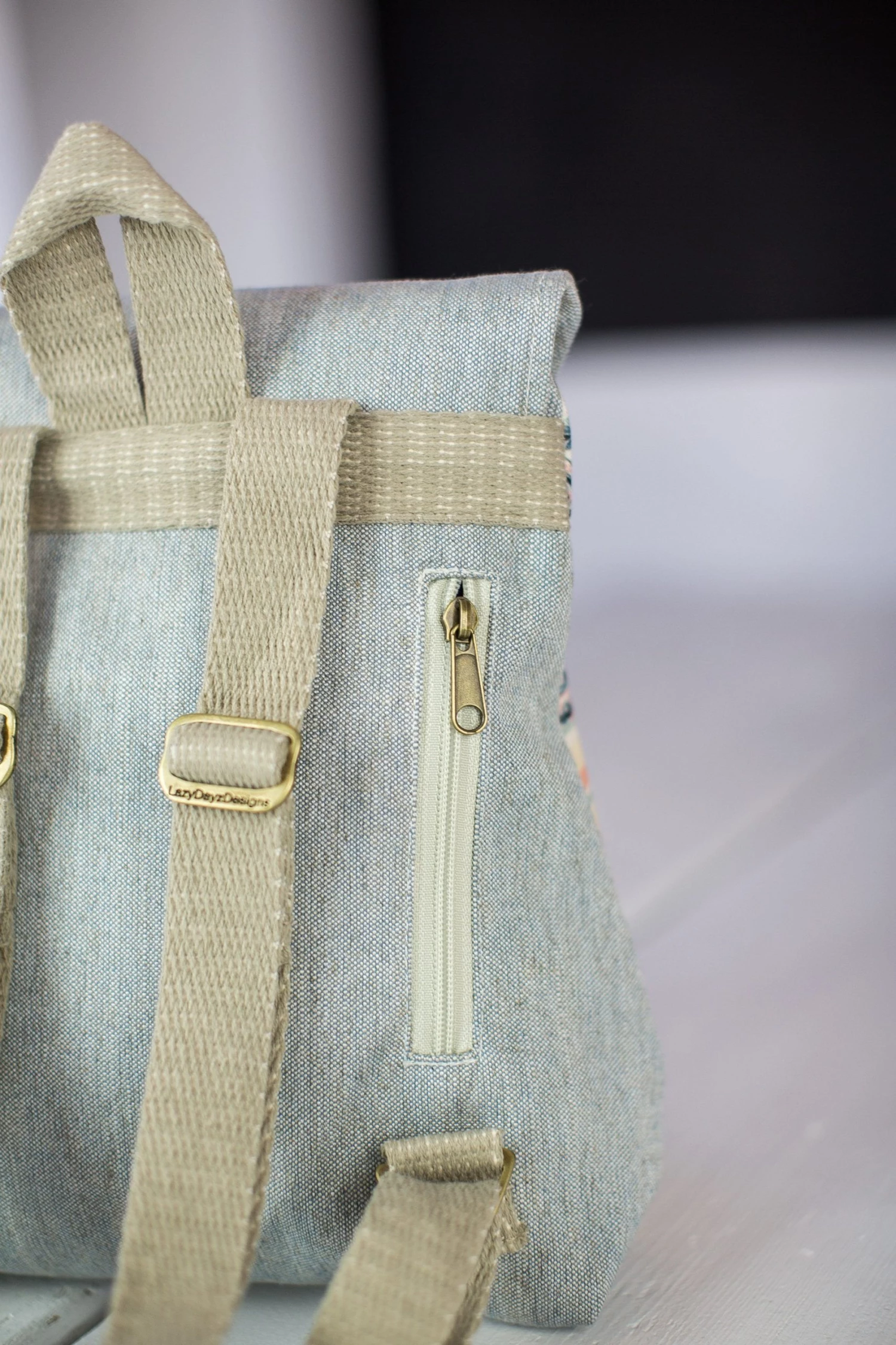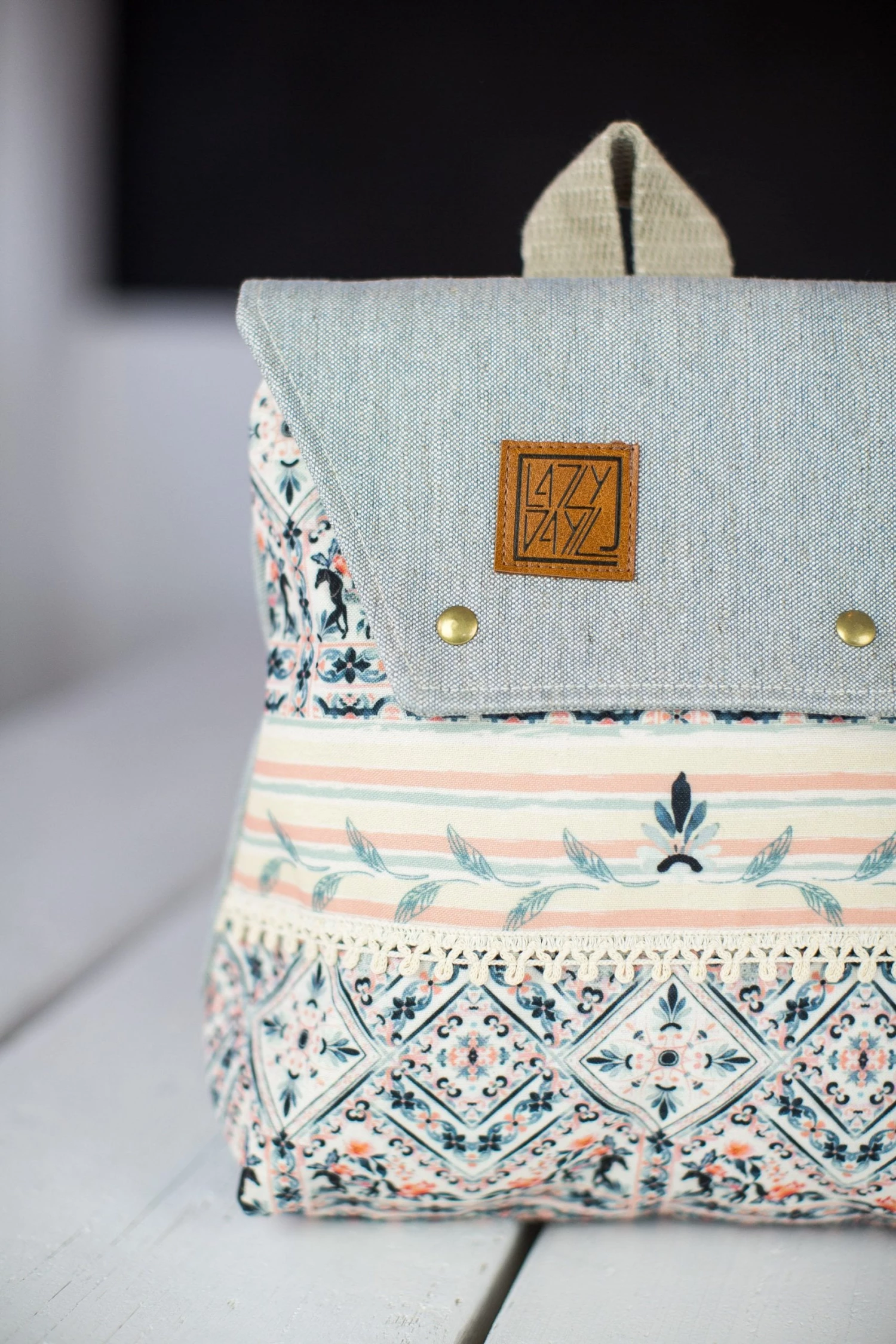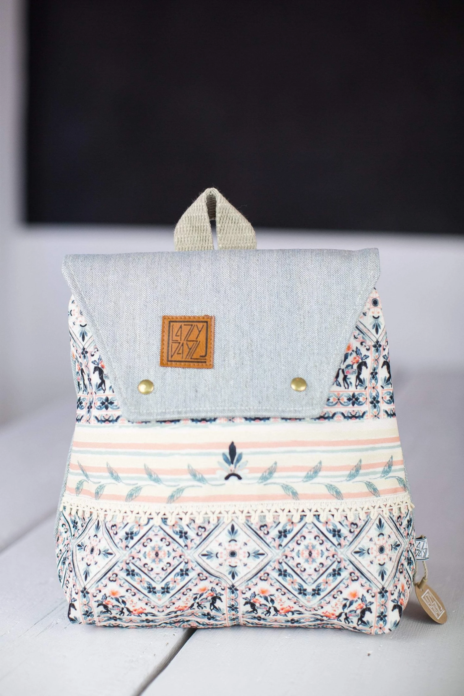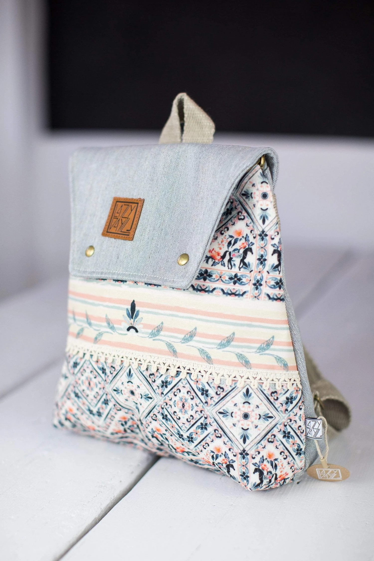 Mini backpack Karpathian in lovely pastel tones of beige, pink and baby blue patterned prints. This backpack has a suede light blue cup and beautiful patterned designs on the front in a multitude of colors and prints such as leaves and various geometrical designs. You’ll absolutely adore this well-designed small backpack, it’s hidden back pocket and its inner pockets. All these combined in a waterproof material! It gives an elegant touch to any casual look and it certainly makes everybody wonder where you got it from!