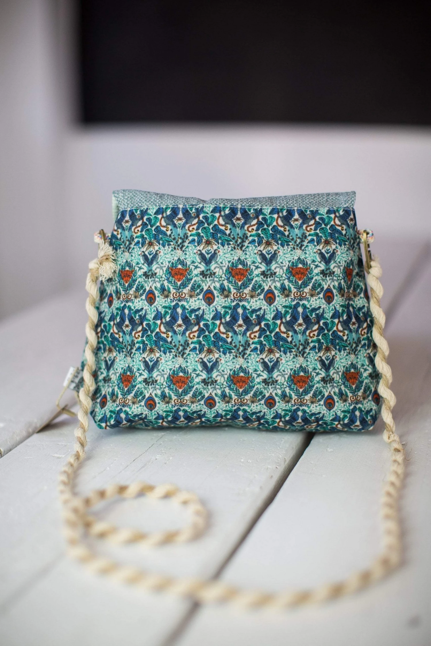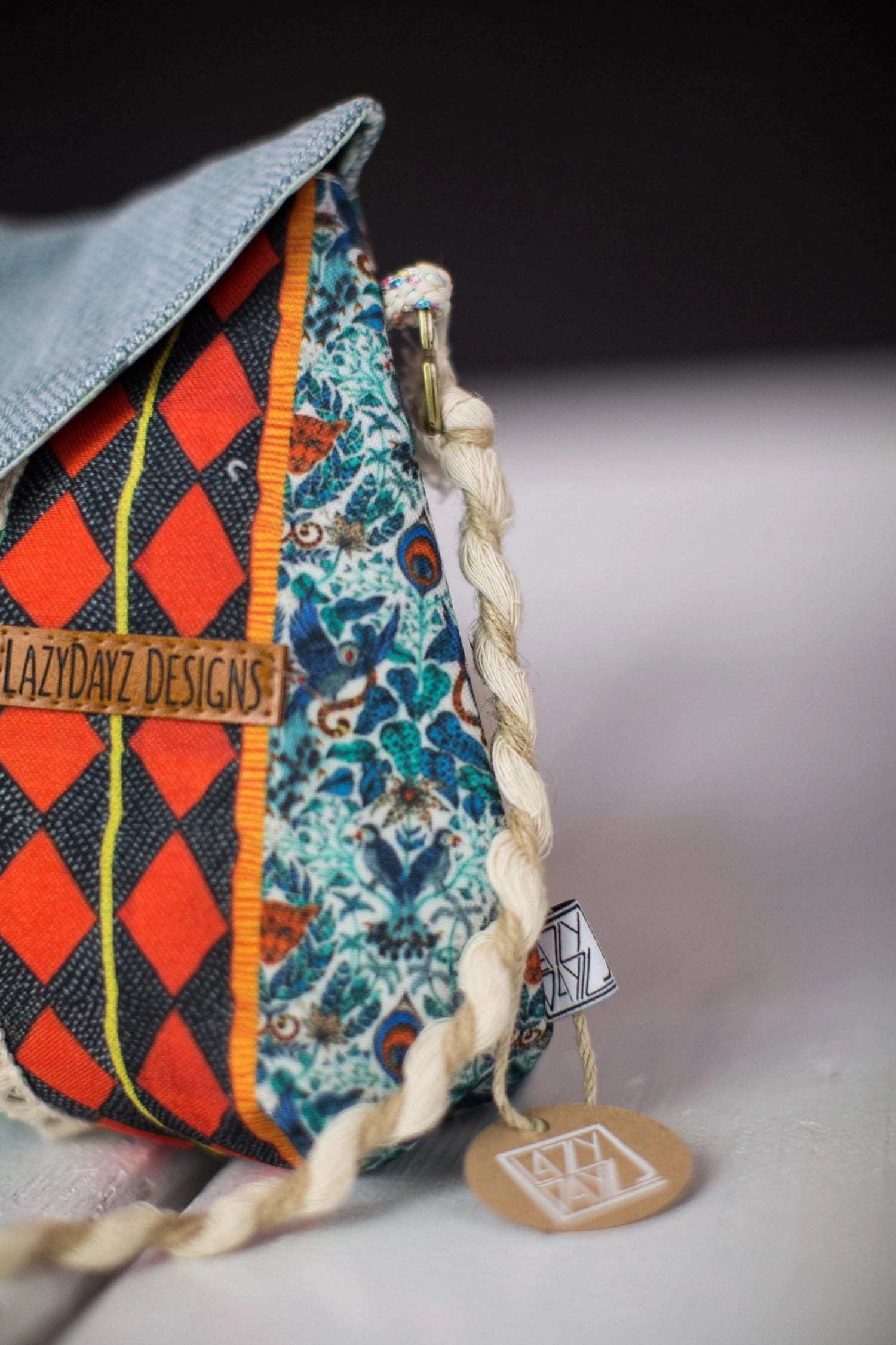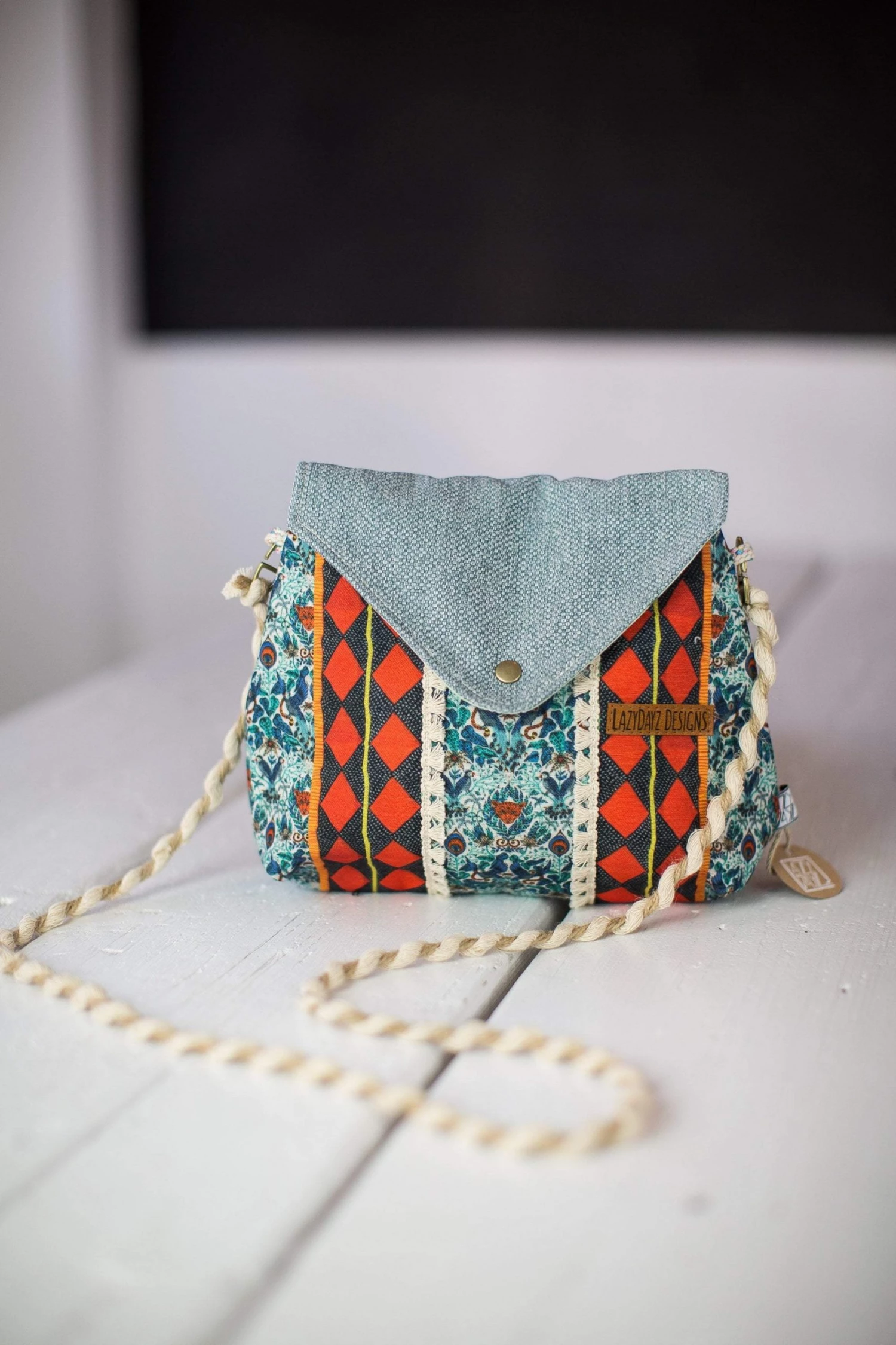 Andalousia, our brand new cross body bag in a gorgeous multi-colored print with geometrical patterns in shades of blue and red. This bag has a suede light blue cap and closes on the front where it also features two tasseled ribbons with a black and red rhombus design. The back is full on geo in blue and white! The straps are made from acrylic twisted two-tone yarn. We love this fresh design!Â