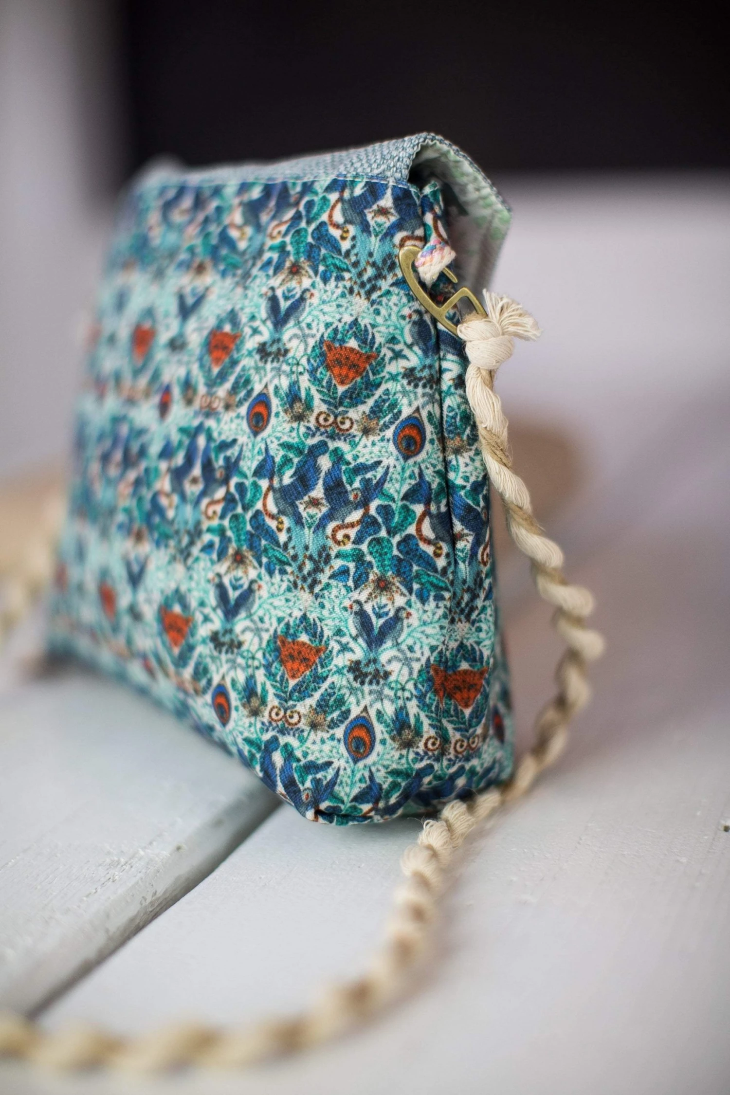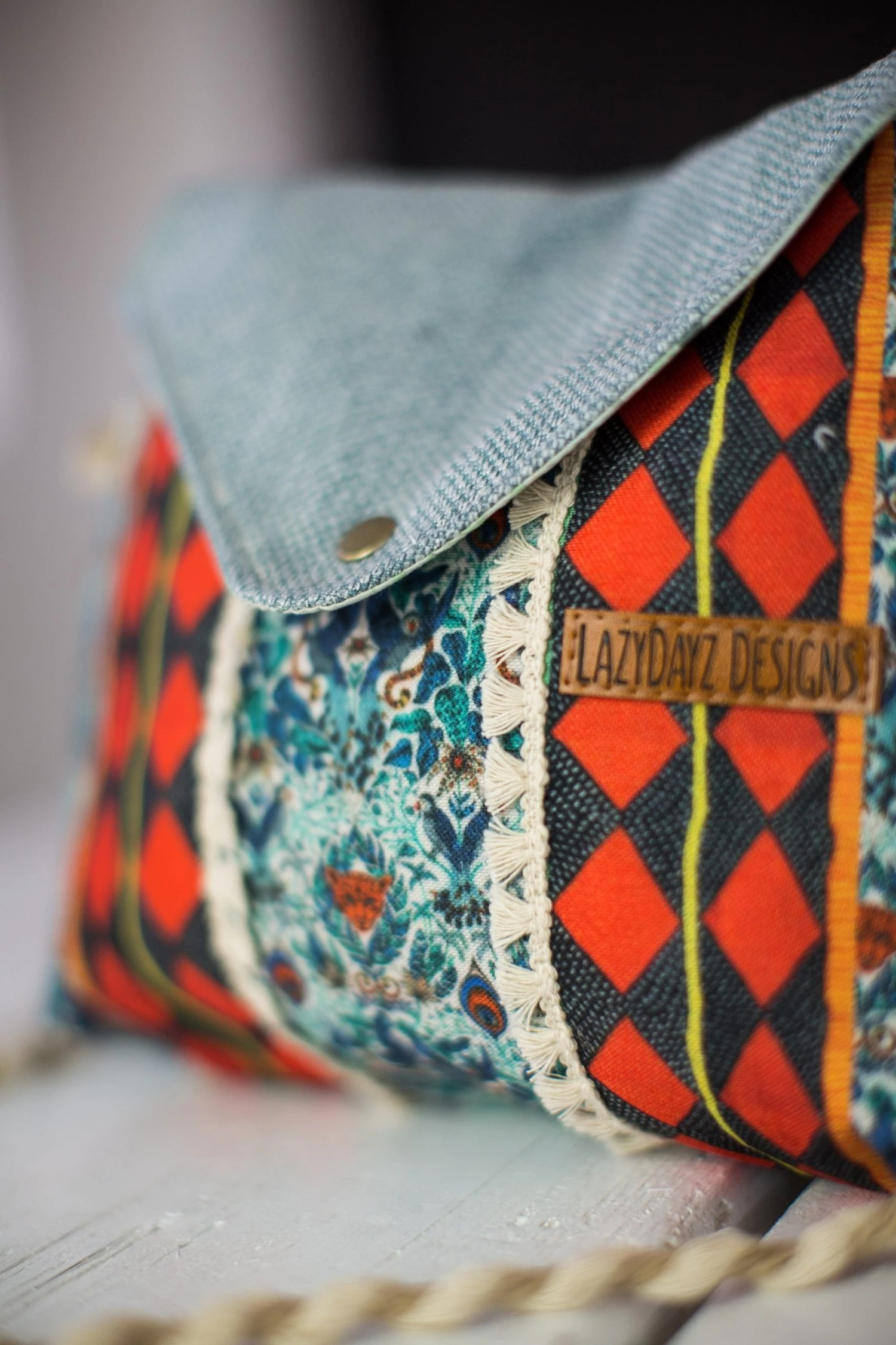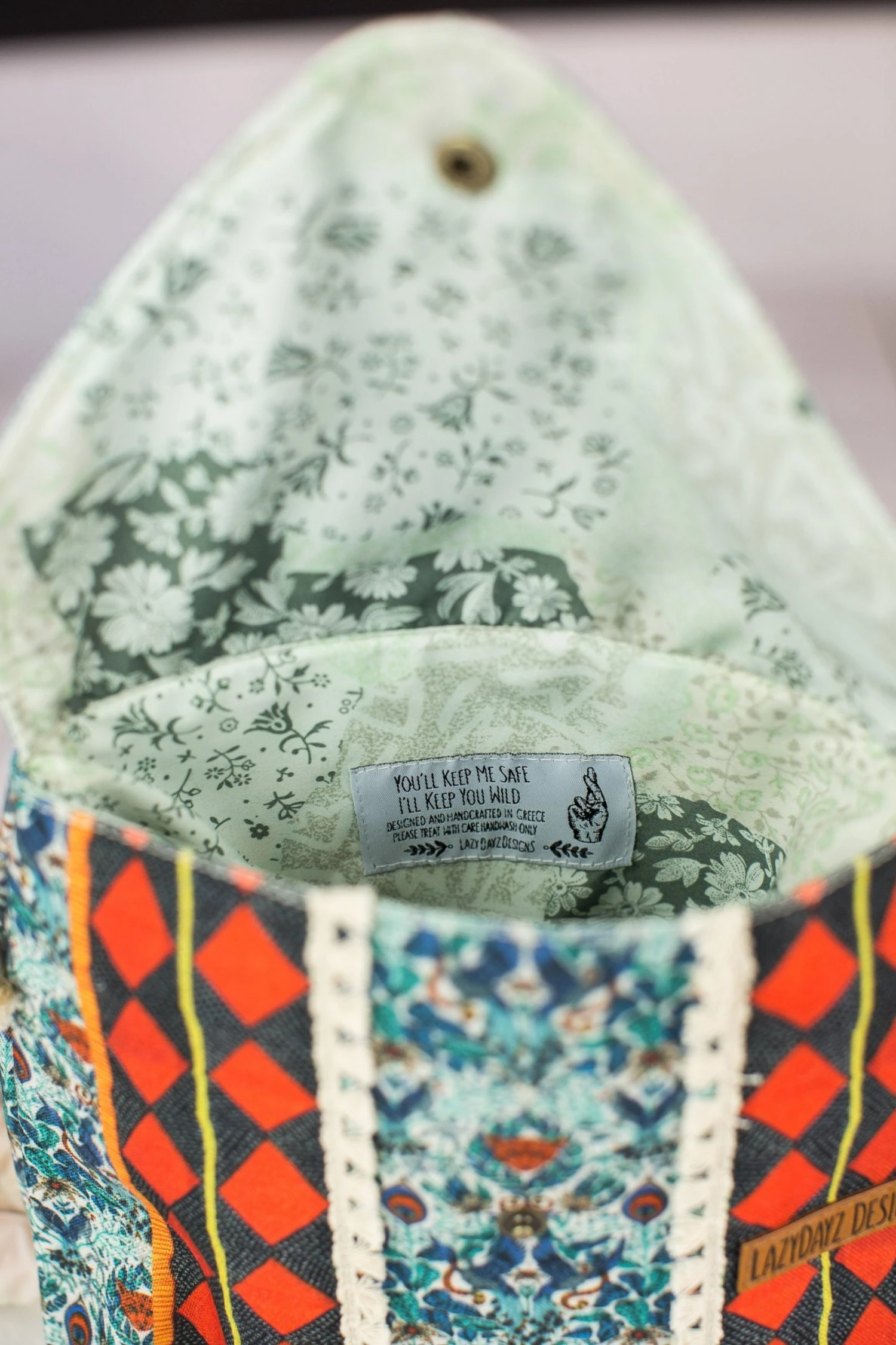 Andalousia, our brand new cross body bag in a gorgeous multi-colored print with geometrical patterns in shades of blue and red. This bag has a suede light blue cap and closes on the front where it also features two tasseled ribbons with a black and red rhombus design. The back is full on geo in blue and white! The straps are made from acrylic twisted two-tone yarn. We love this fresh design!Â
