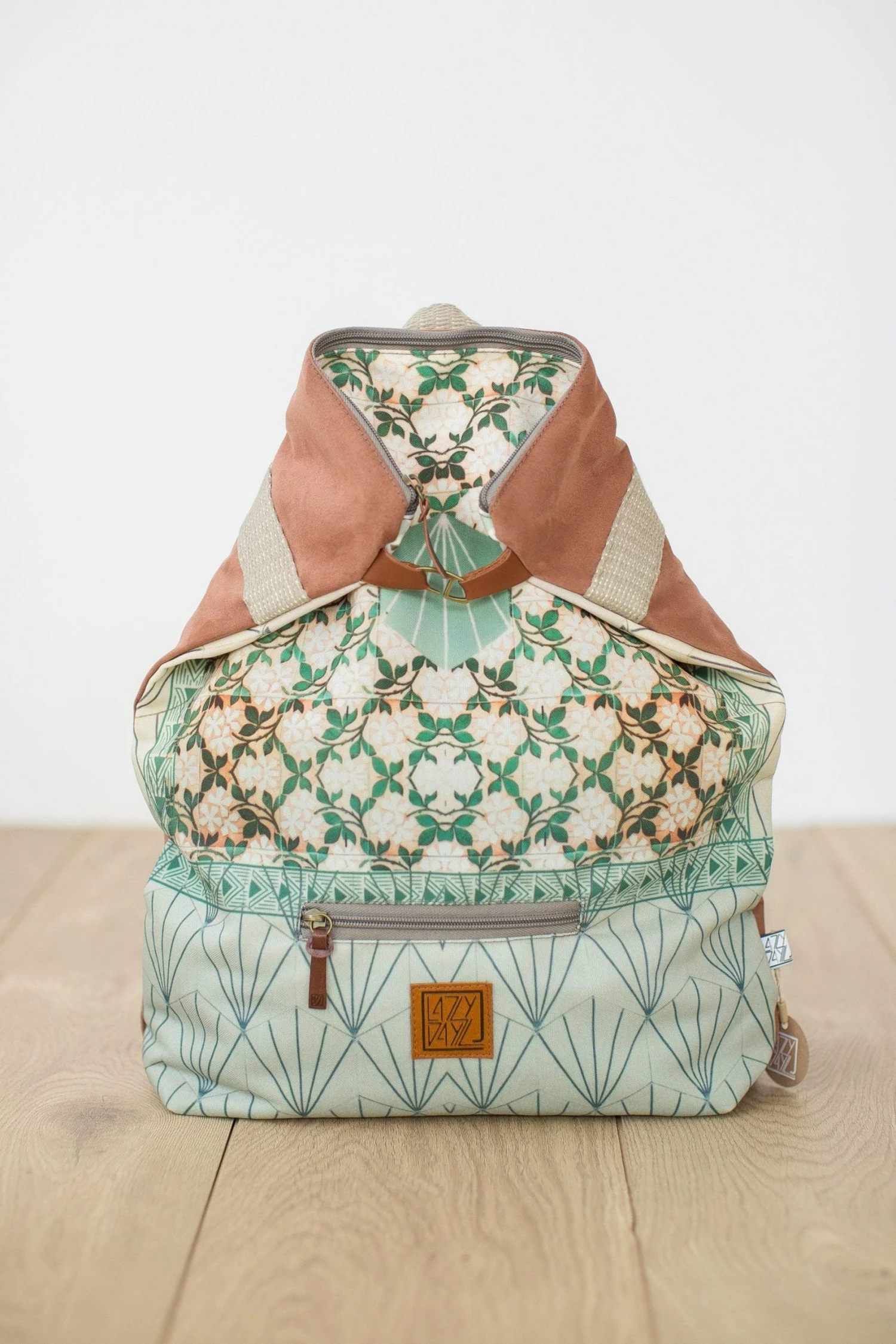 Beirut folded backpack in green-cream colours. This large city backpack has a triangle closure, one outside zipped pocket and two inside. It even fits your laptop! You’ll absolutely adore this well designed backpack with prints in a variety of colours! It gives an elegant touch to a casual look and it certainly makes everybody wonder where you’ve got it from!
