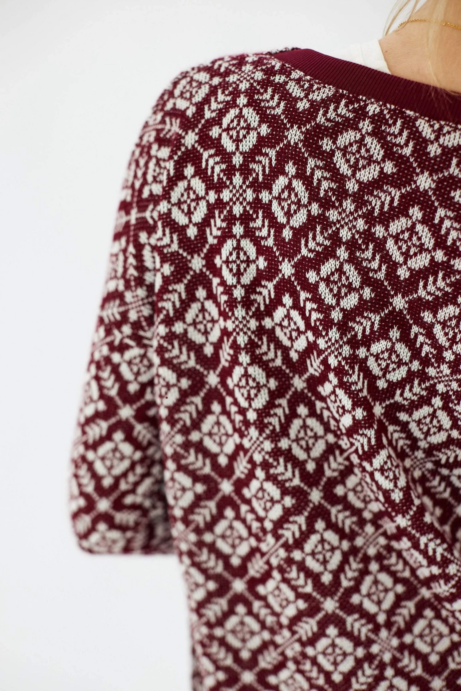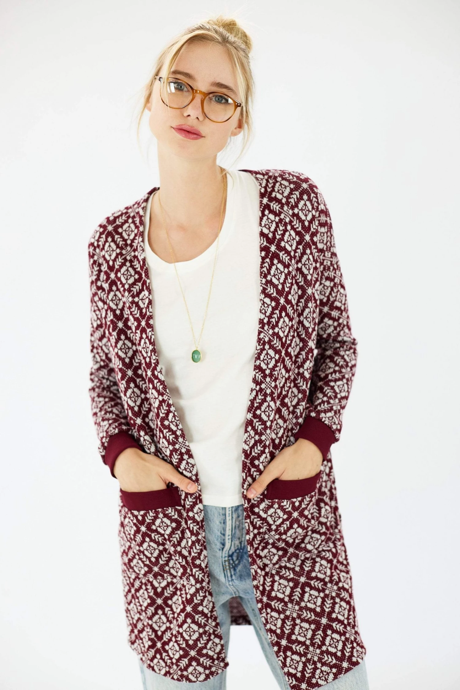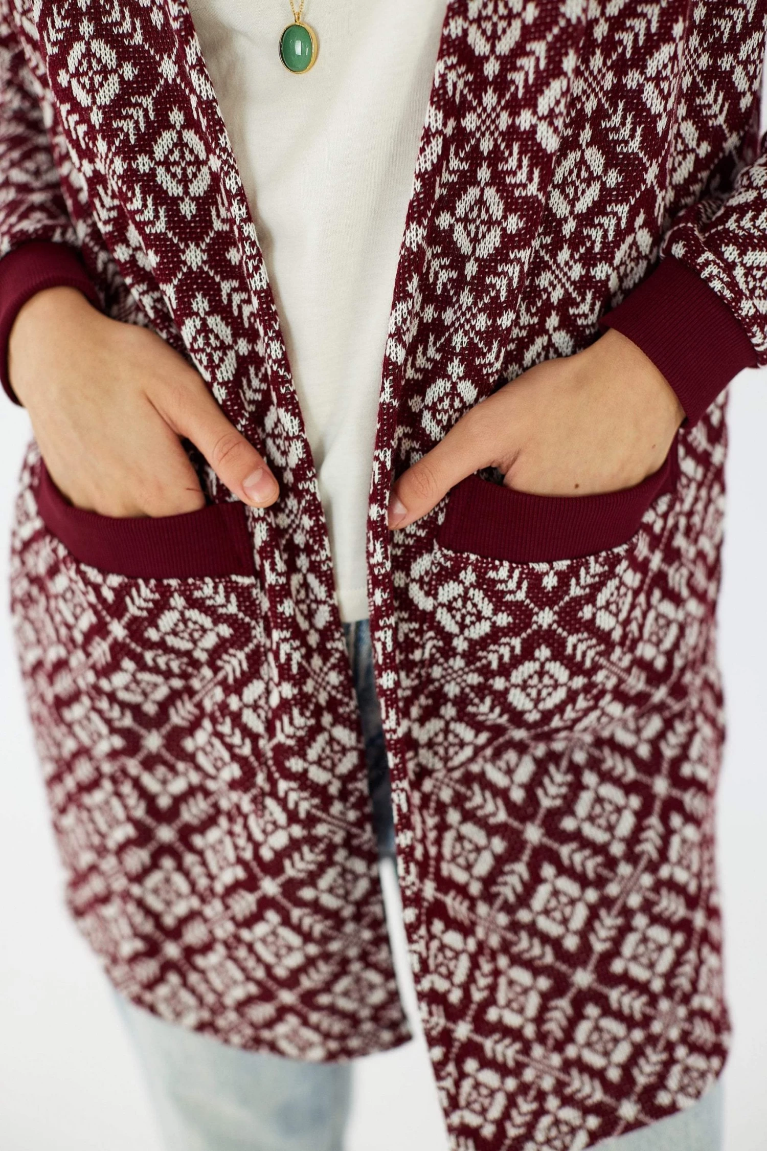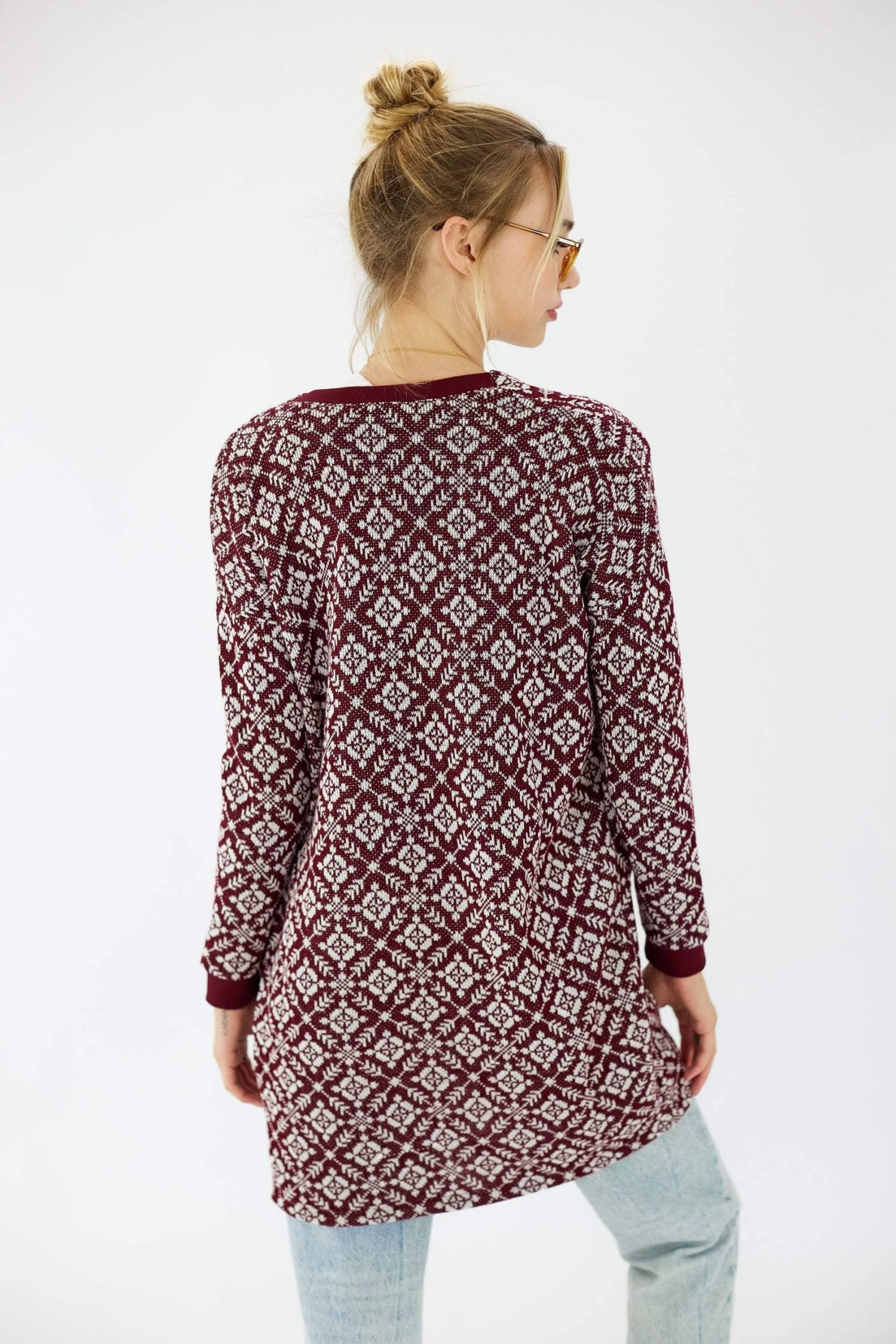 Cardigan ‘Grandiose’ in burgundy. Long knitwear pattern to have you looking cool and cozy! Burgundy details, open front, long sleeves, front pockets, regular fit, true to size. Cosy never looked so good 😉