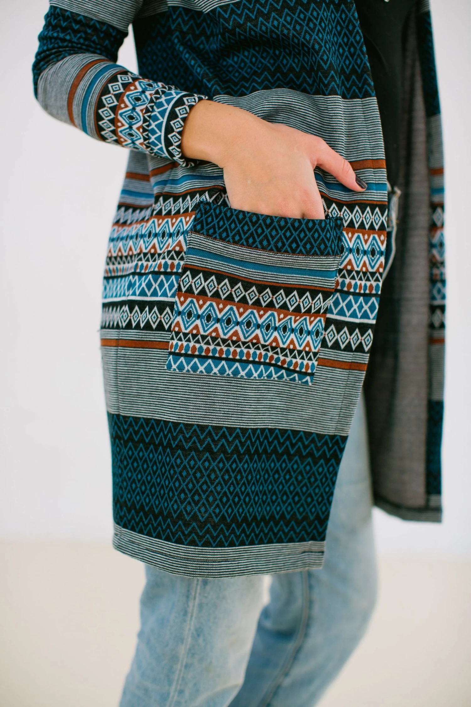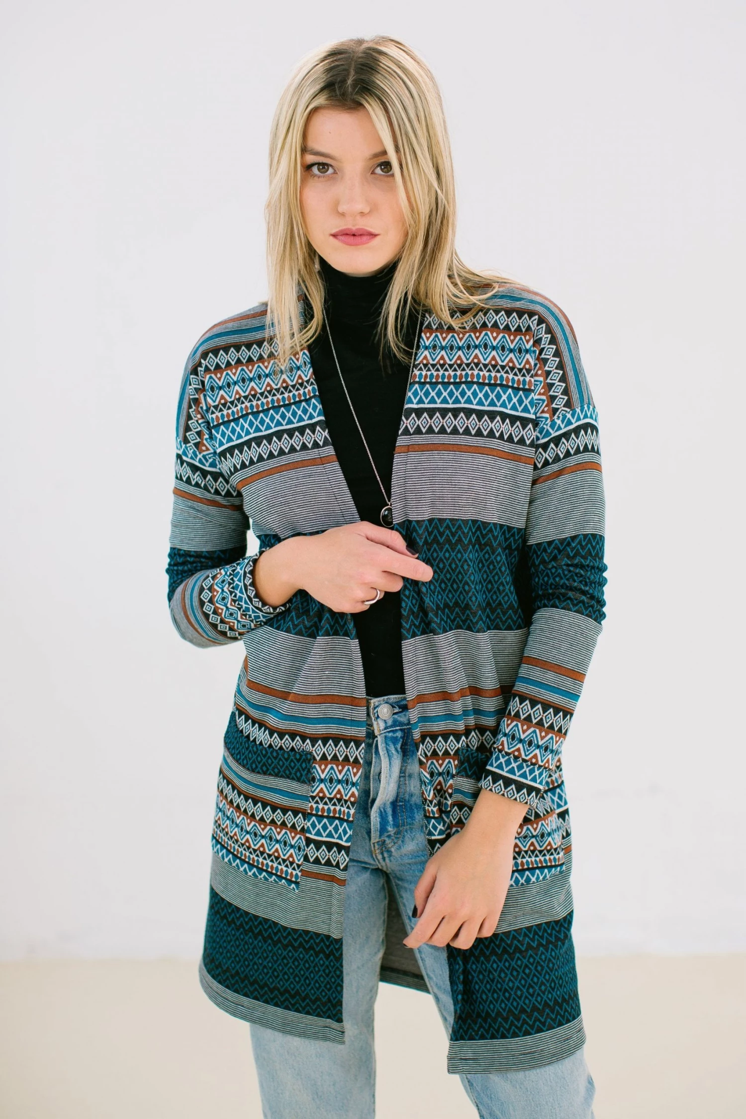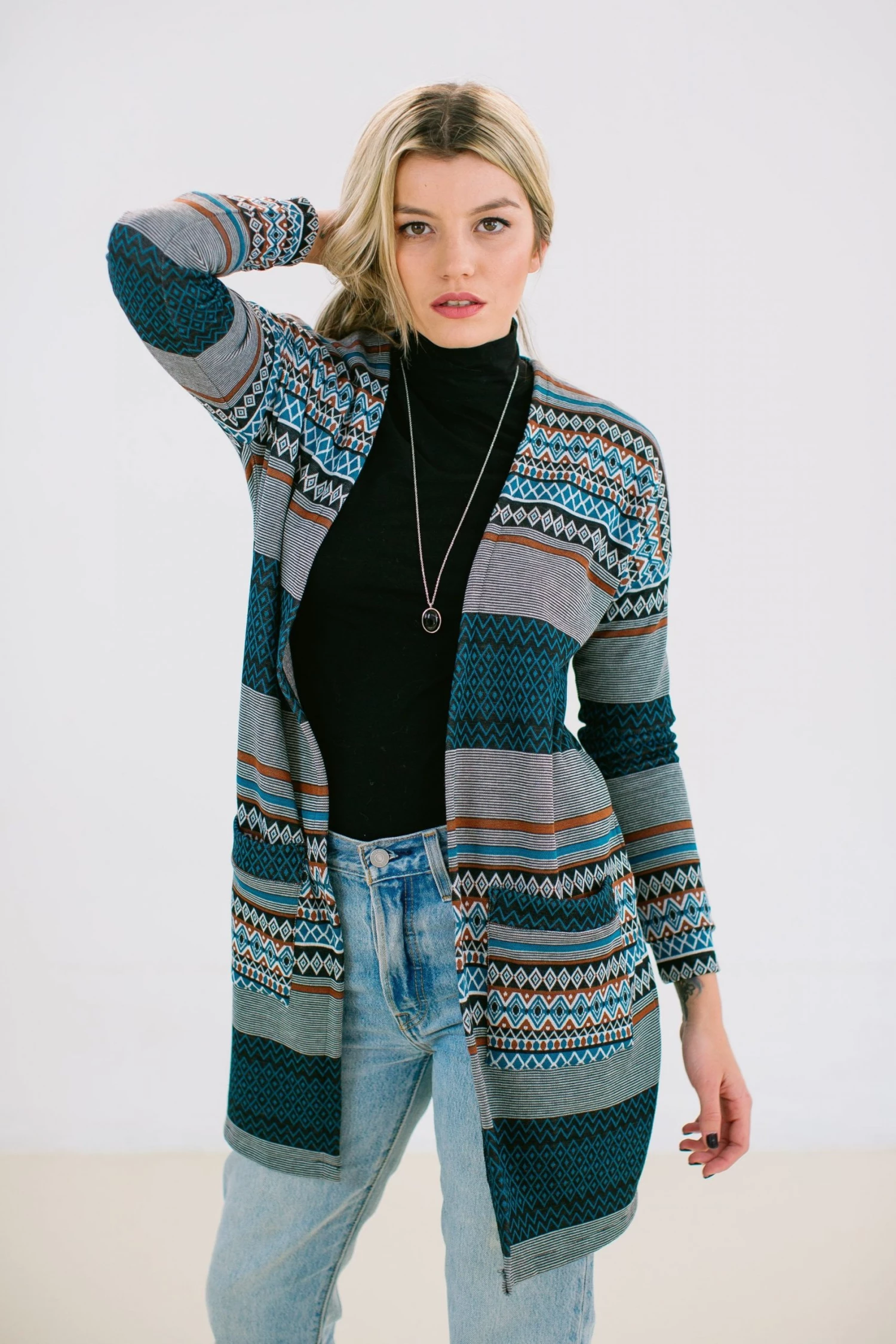 Cardigan Mona. A winter staple that you will love! Wear with a monochrome black outfit and we promise you that it will keep you both warm and stylish with its funky aztec vibes. Loving the colourful aztec print in various tones and stripes of blue, orange, white and black and its side pockets. Long fit to keep you looking cool and feeling cozy!