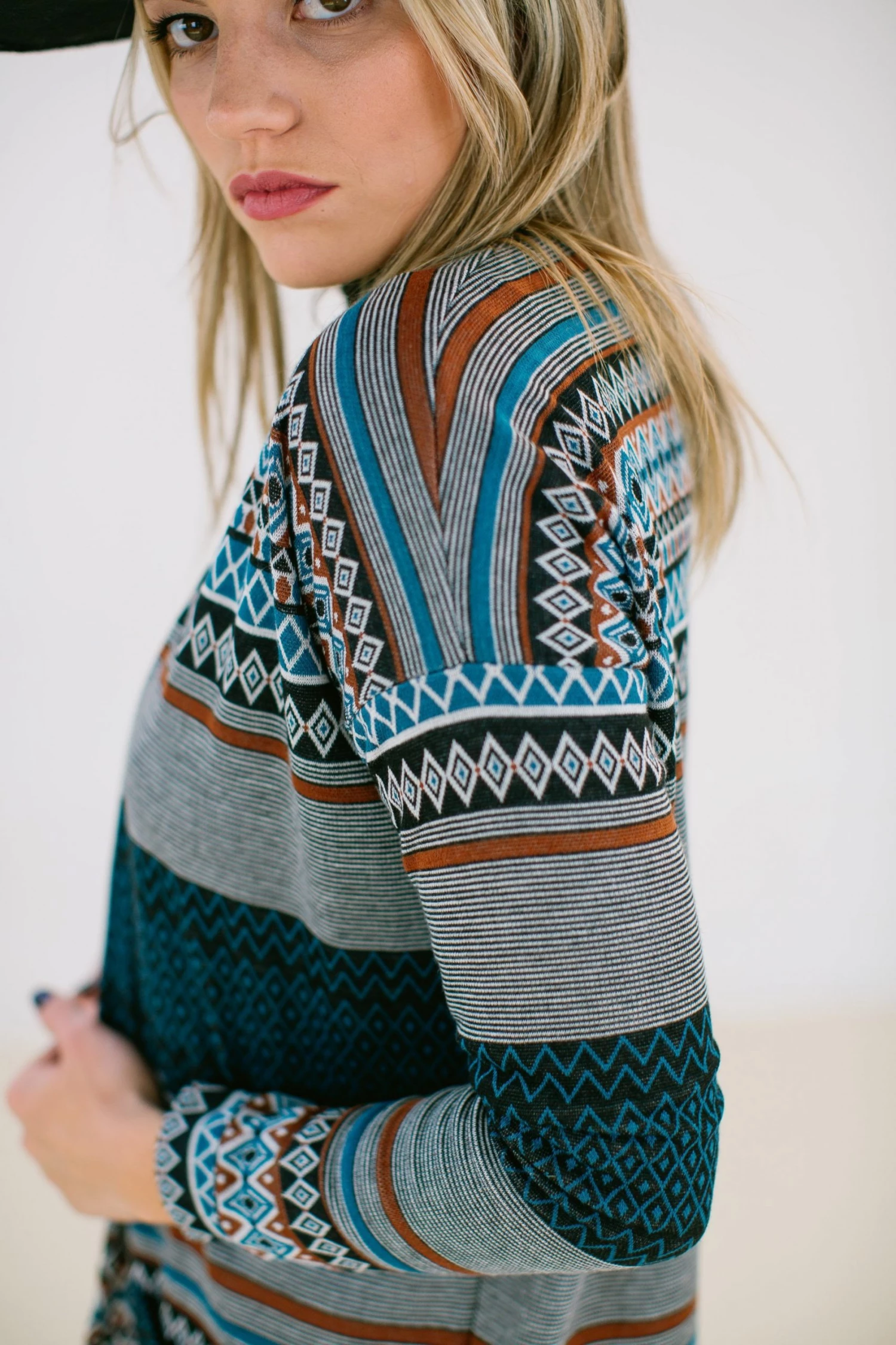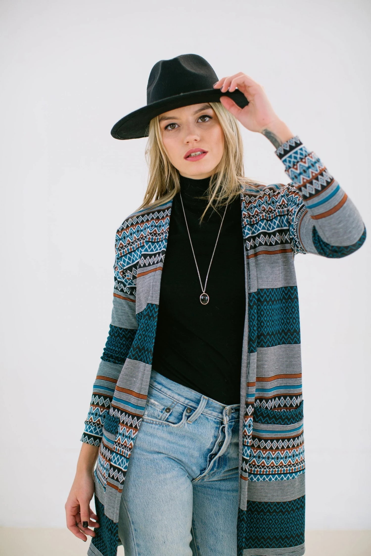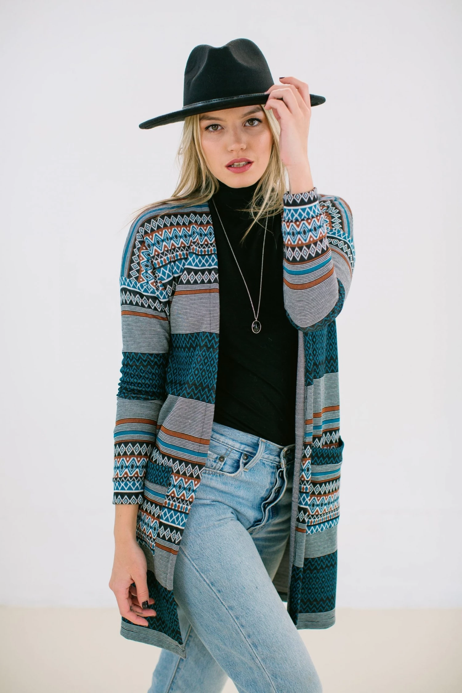 Cardigan Mona. A winter staple that you will love! Wear with a monochrome black outfit and we promise you that it will keep you both warm and stylish with its funky aztec vibes. Loving the colourful aztec print in various tones and stripes of blue, orange, white and black and its side pockets. Long fit to keep you looking cool and feeling cozy!