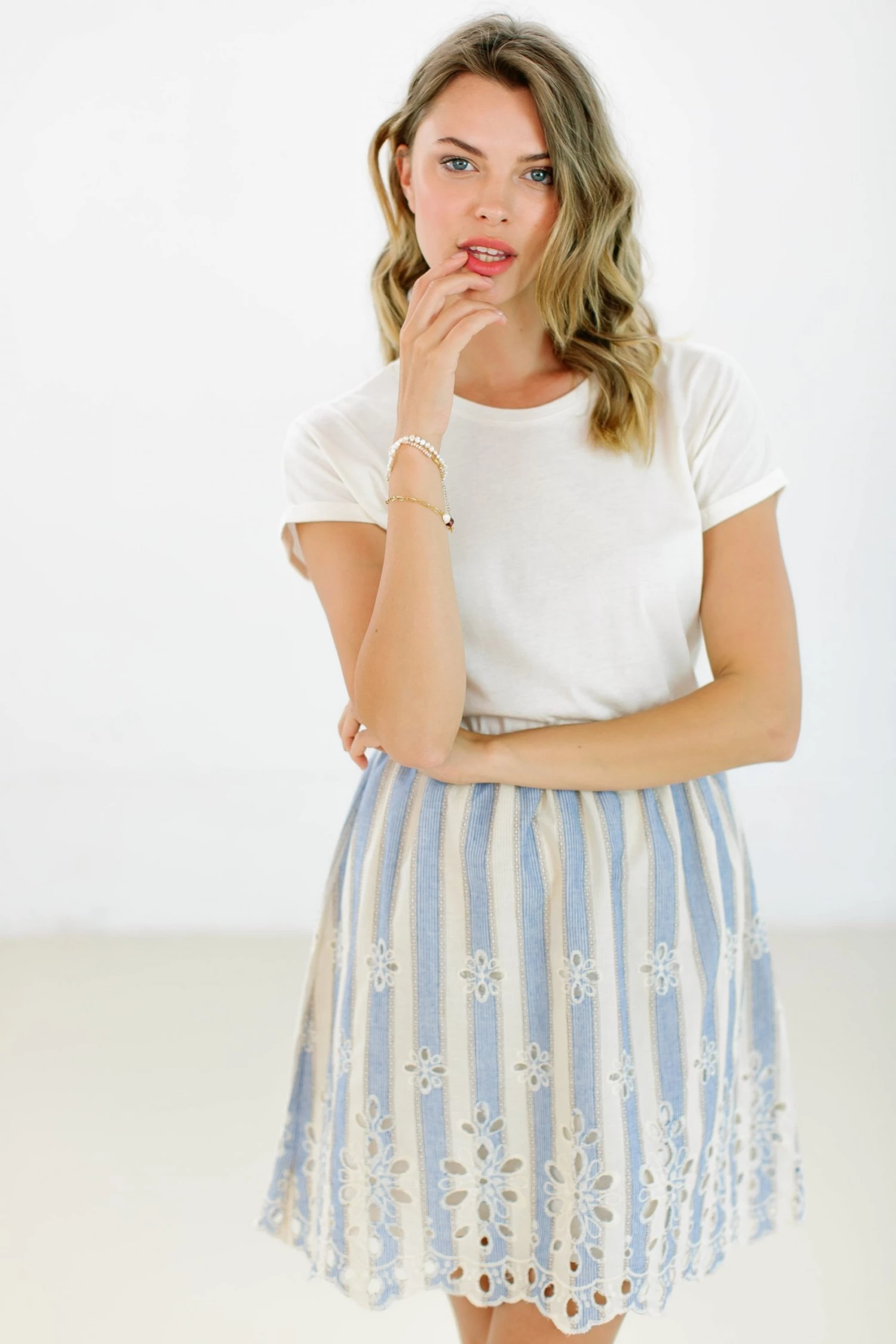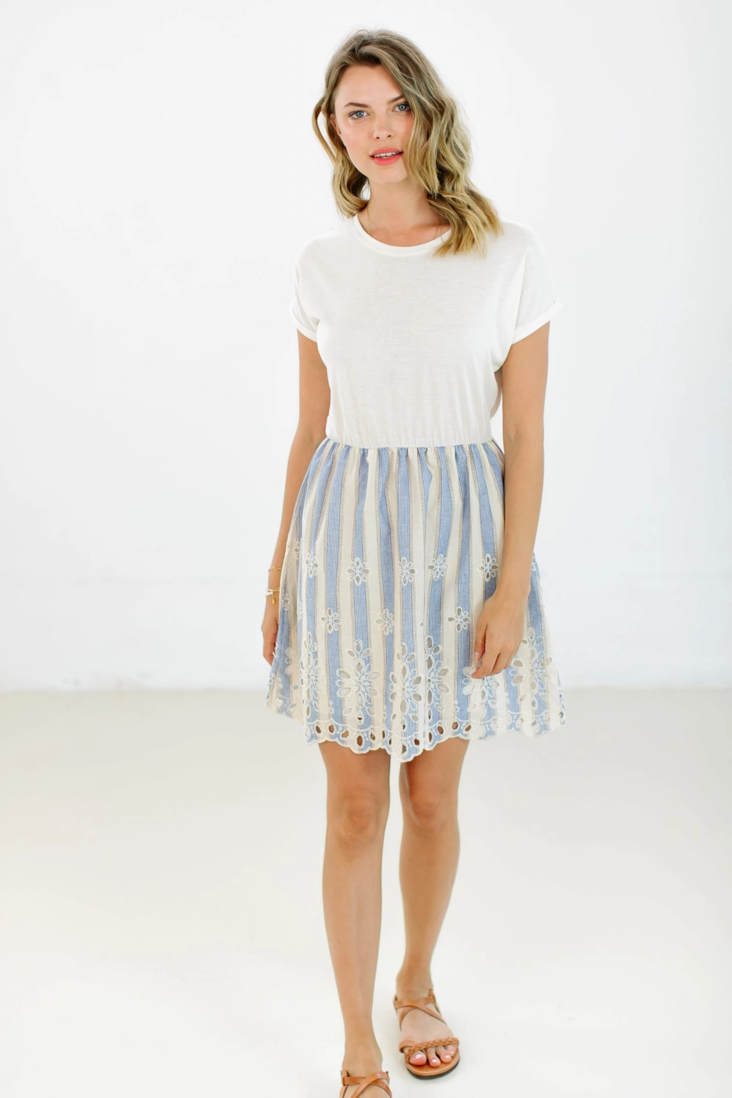 Dress Annie in the ultimate summer combo! A skater dress with a casual bodice made of a soft white organic cotton jersey and the cutest pastel embellished skirt with vertical white and blue stripes. Extra cute, easy to wear and as playful as it gets! Put it on and get ready to conquer the day!