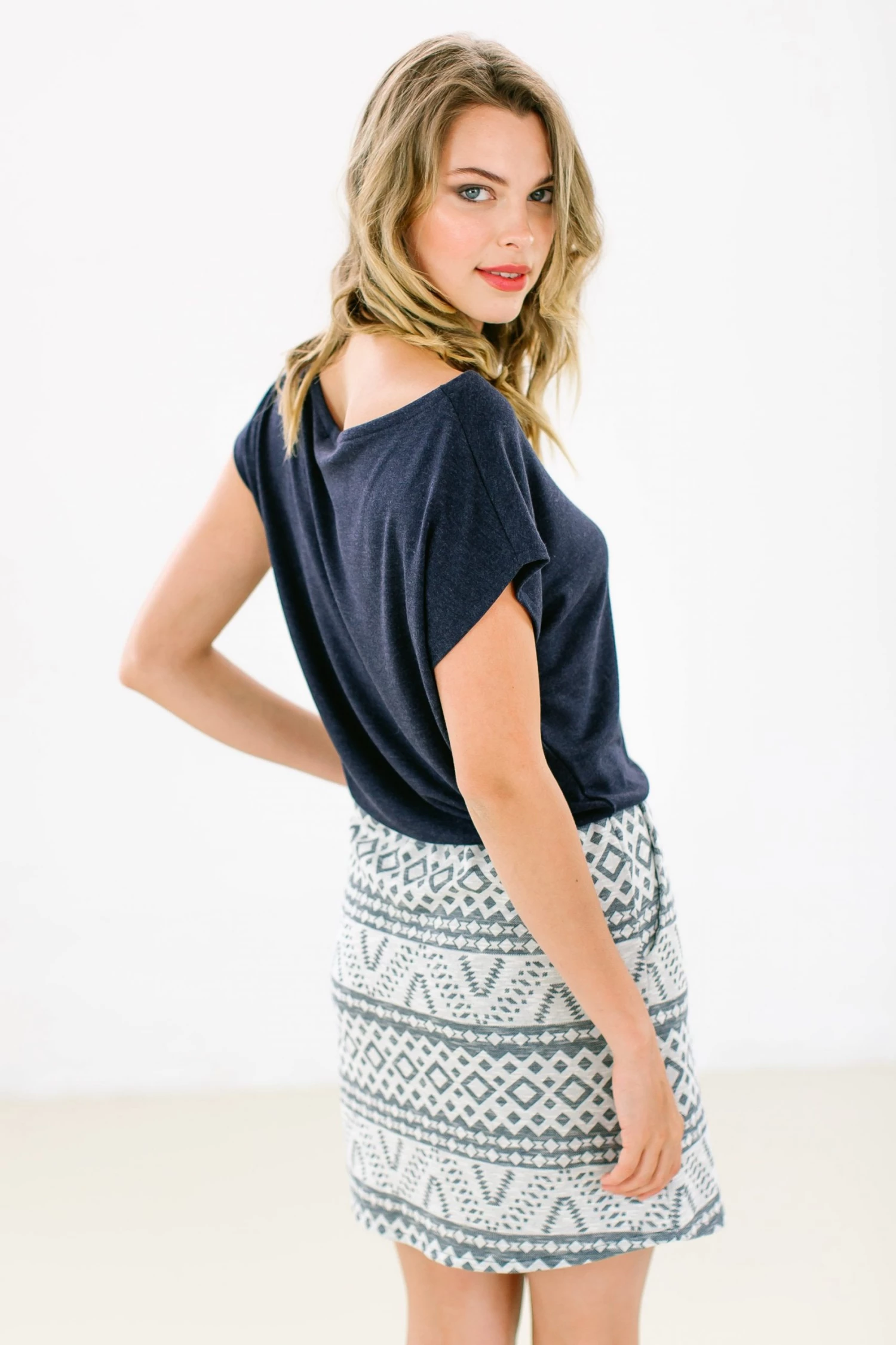 Ethnic dress with a classic boat neck and an elastic waist! The “Baloux” dress is crafted from a dark blue fabric on the top and an ethnic skirt in white and grey with side pockets! Just as cute as a feminine dress should be! Everybody loves a casual summer dress when it gets a little too hot, so the “Baloux” is perfect for hot summer days and nights.Â