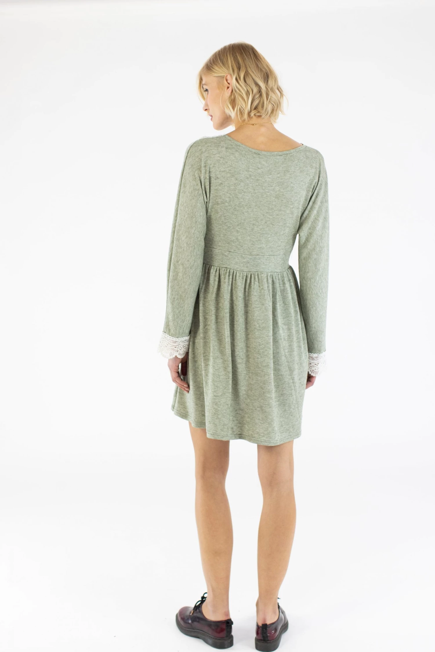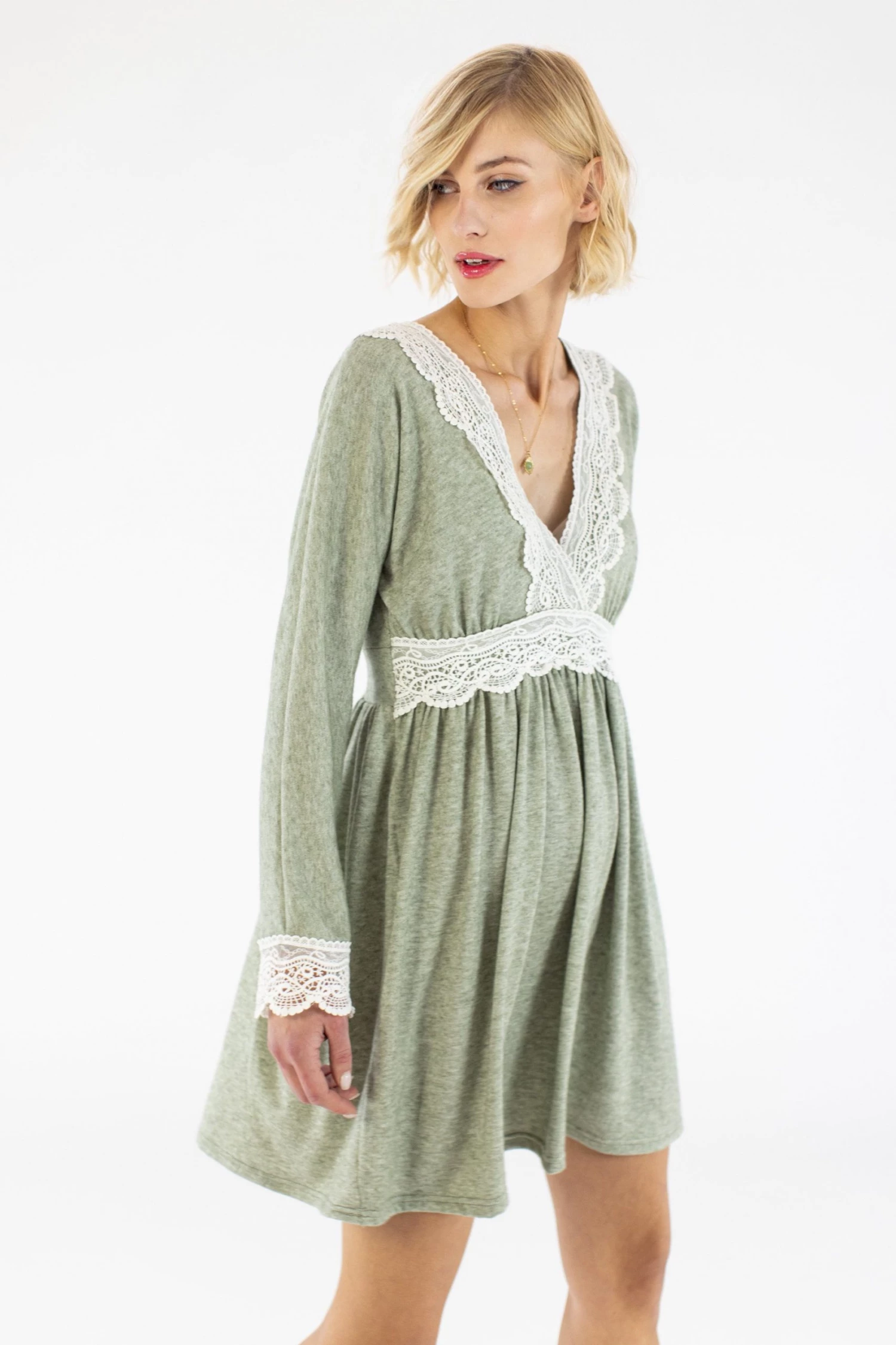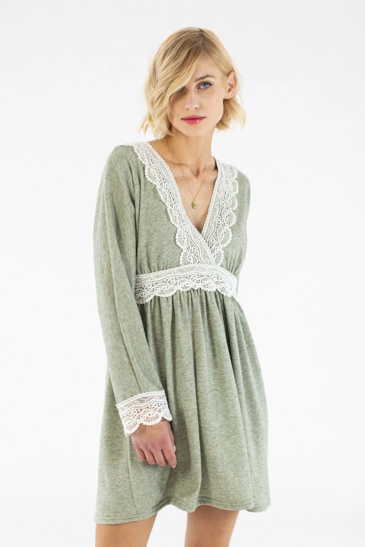 Midi dress ‘Chandelier’ crafted from a soft mint fabric. Loose fit, with an elegant low cut on the chest!Cute detail of a white lace around the waist, on the the chest and at the end of the sleeves! Easy to wear for an everyday look, you can match it with your boots or your fav sneakers! Style it with your fav jewelry!