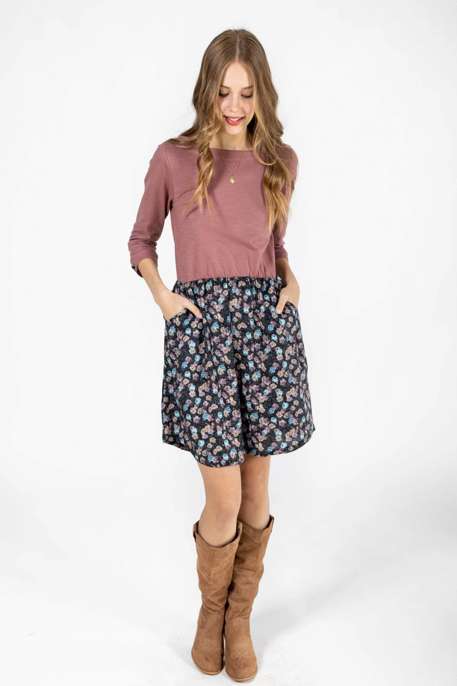 The Luiza dress is exactly what you need! The girlie look, its dusty pink color on upper part and the playful light blue and pink flowers pattern on its skirt will bring out your romantic and flirty side. This beauty has an elegant boat neck, a cute button at the end of each sleeve and two small pockets on each side. Match it with sneakers and a chunky necklace or layer it and dazzle them all!