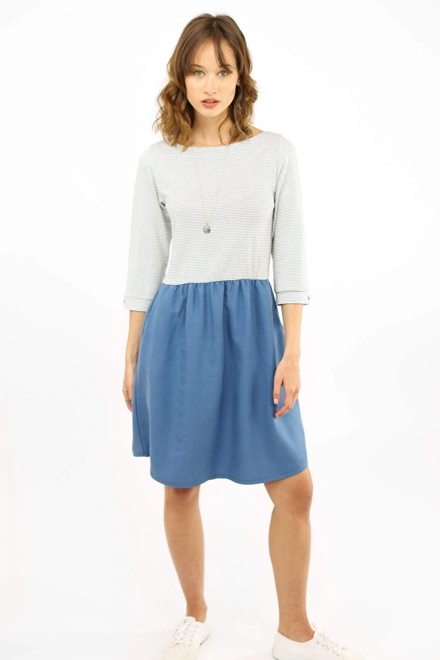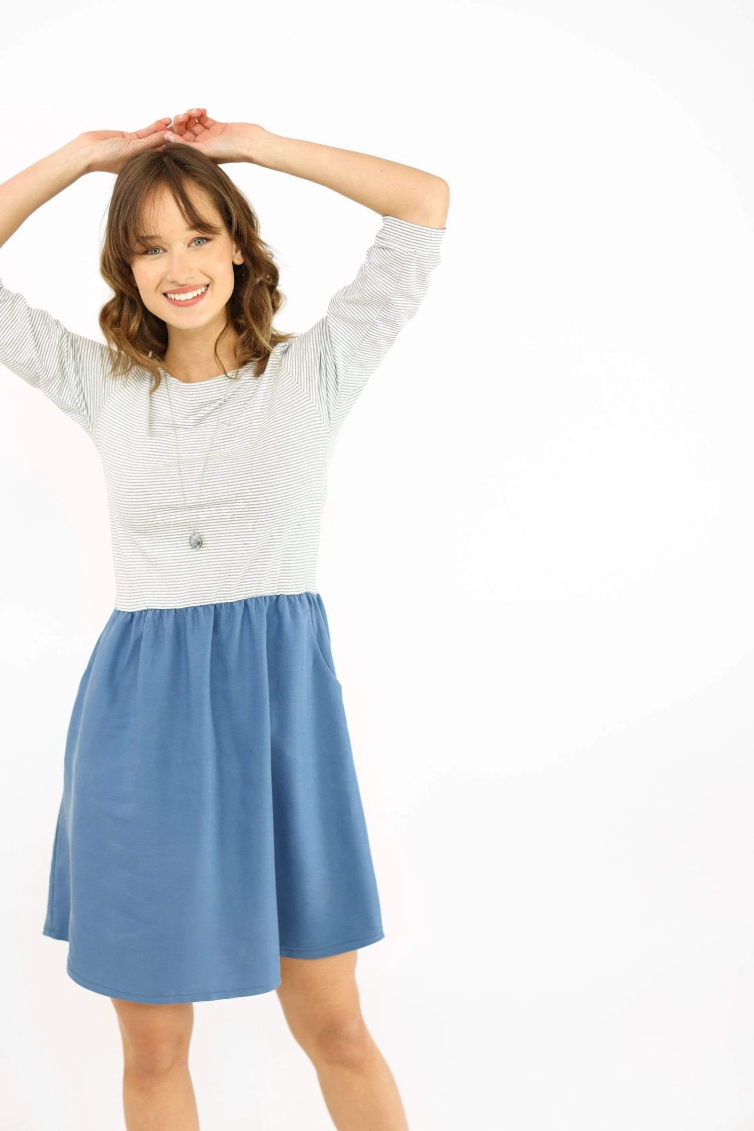 The new Luiza dress is here and it is exactly what you need! The beautiful blue and white striped top and the cute, playful skirt in blue makes you look perfect! In addition, this beautiful dress has an elegant boat neckline, a cute button at the end of each sleeve and two small pockets on each side. Combine it with your white sneakers or ankle boots and a nice necklace and let the world shine!