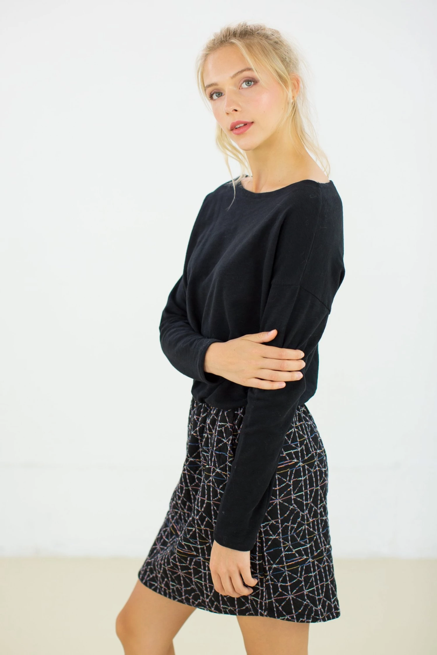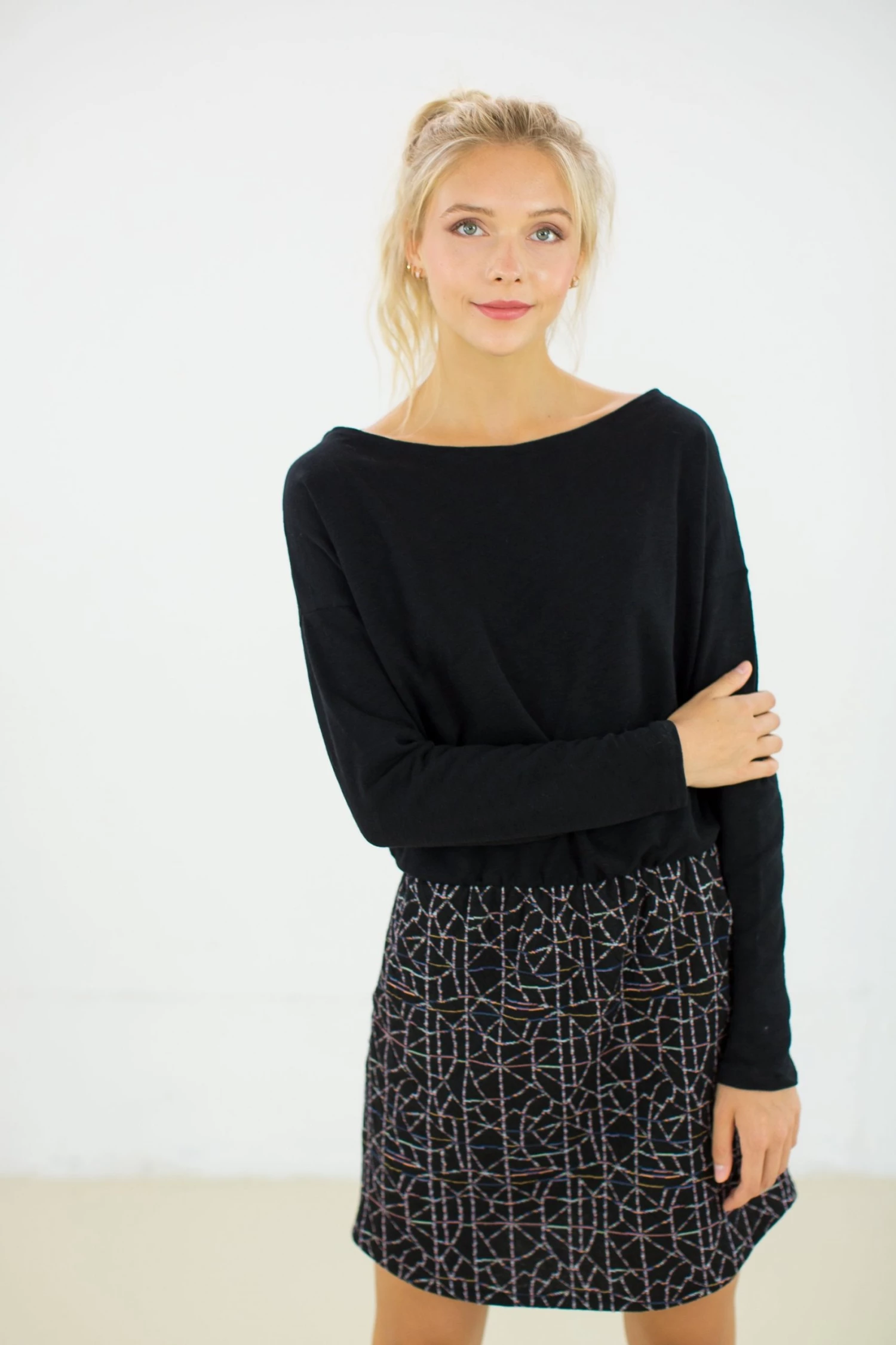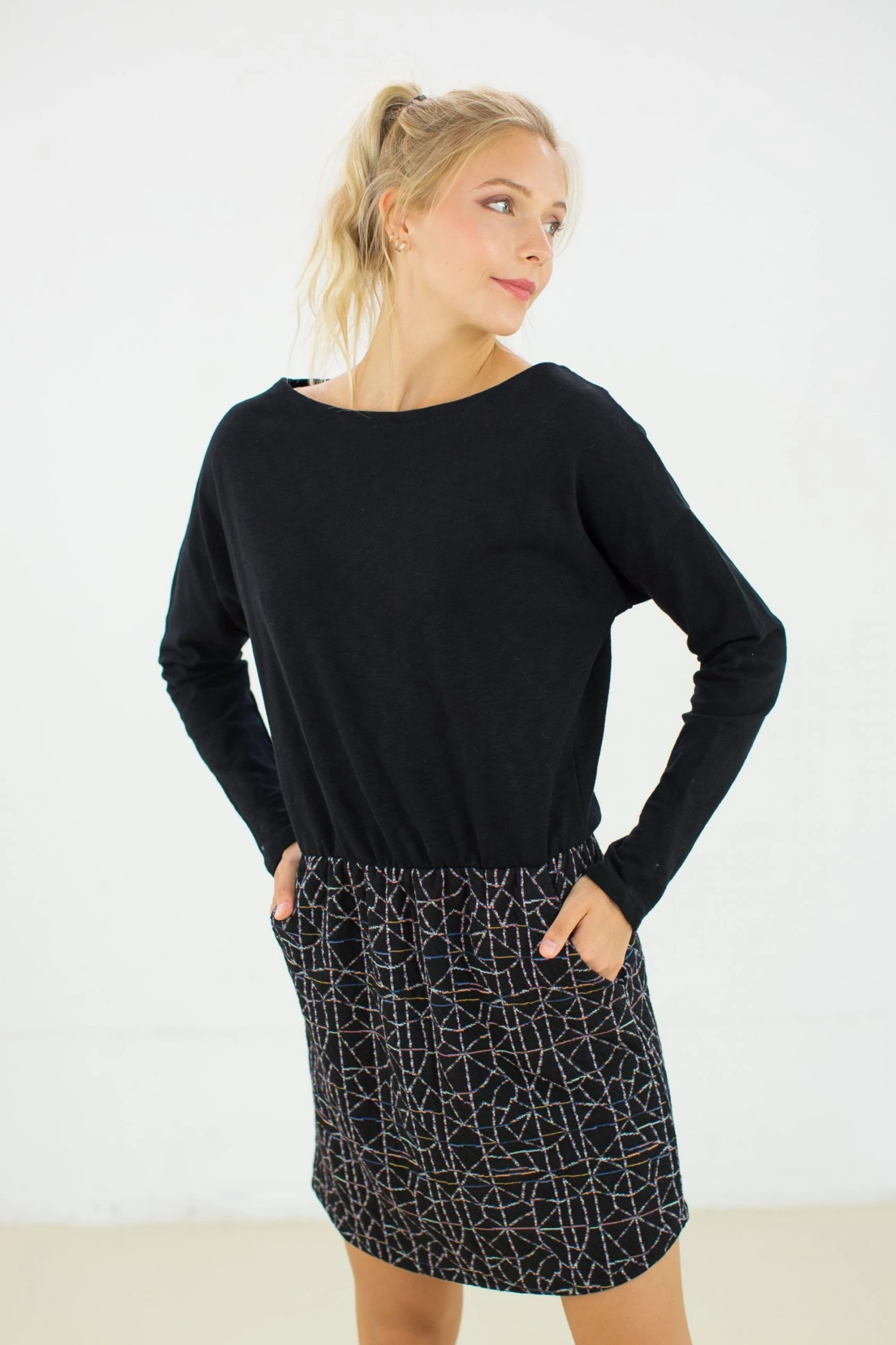 Dress Malu in black and geo stripes lower part. A playful dress with a casual long-sleeve bodice made of a cotton black fabric, a cute black skirt with colourful geo stripes and practical side pockets. Put it on and get ready to conquer the day! Cuteness overload is what you get in this comfy dress!