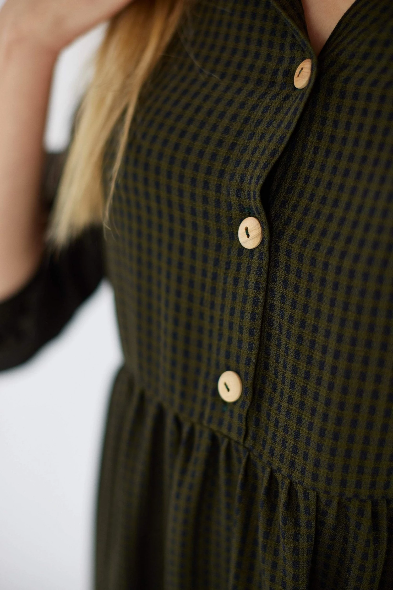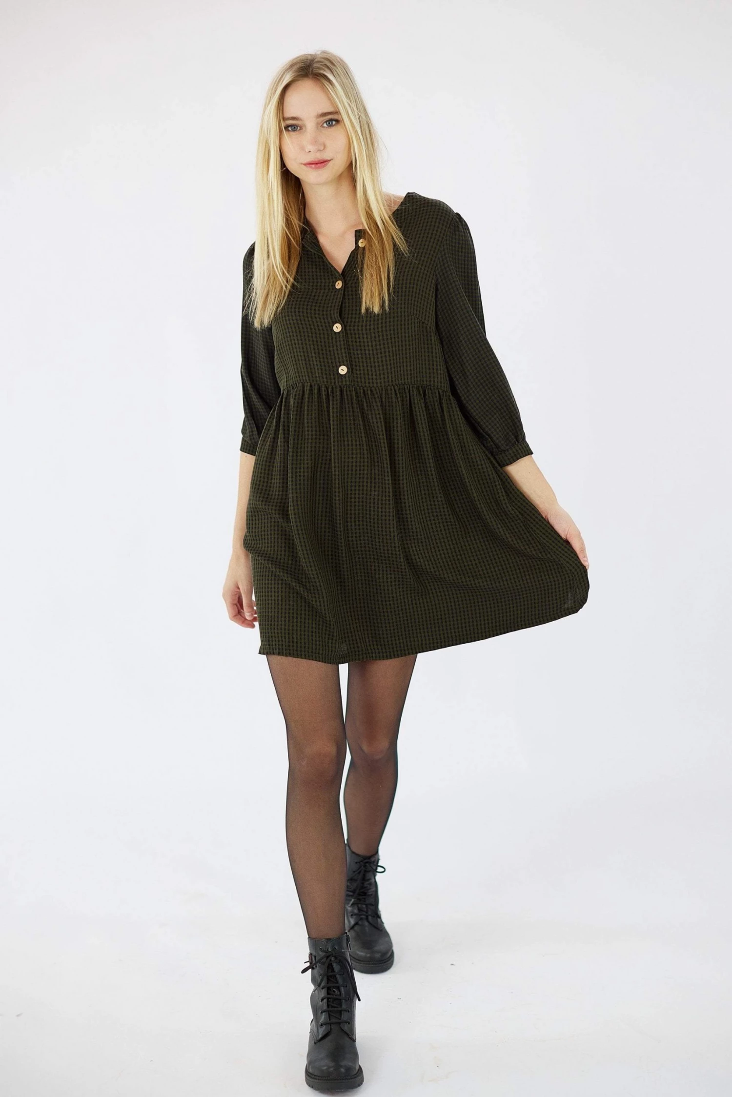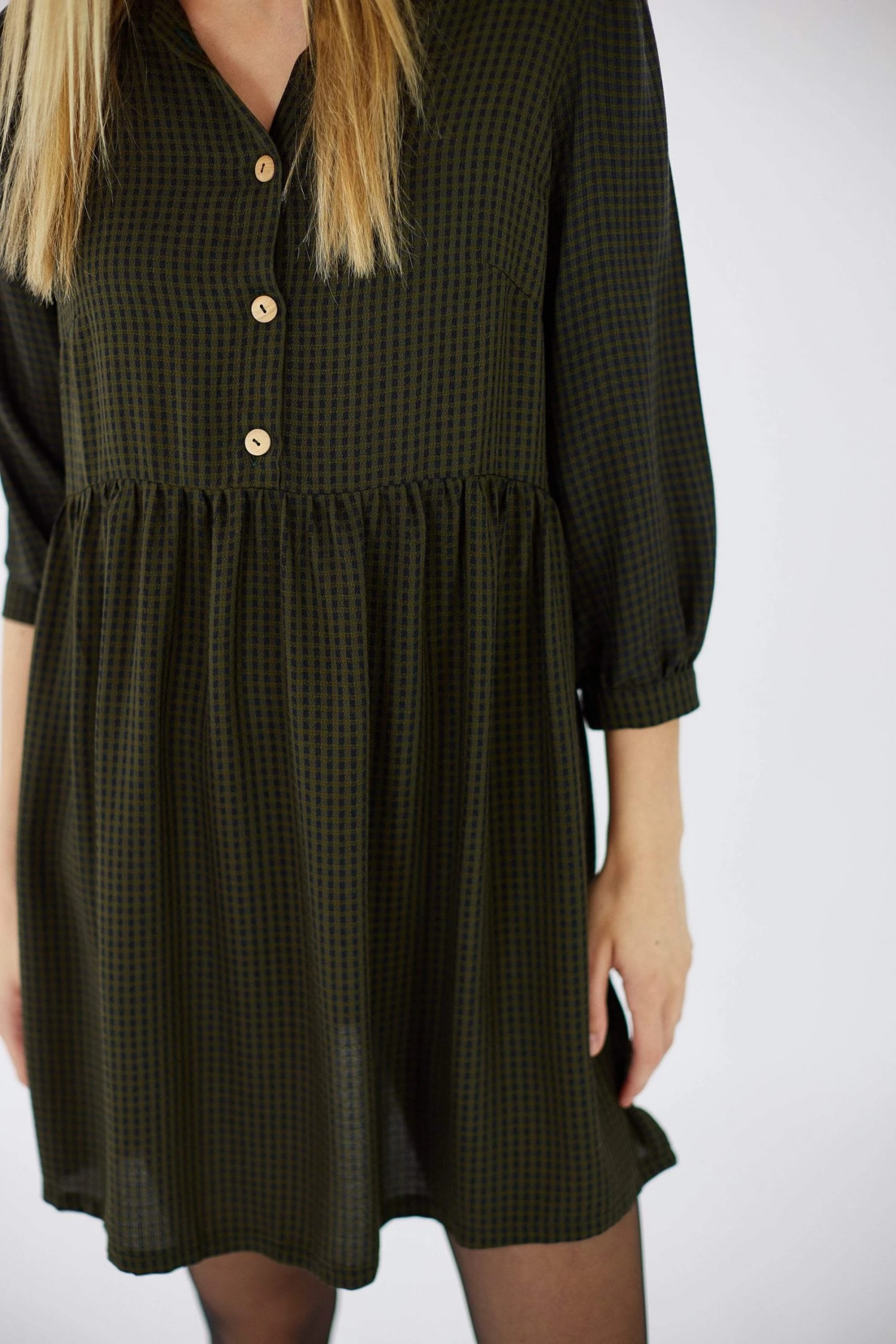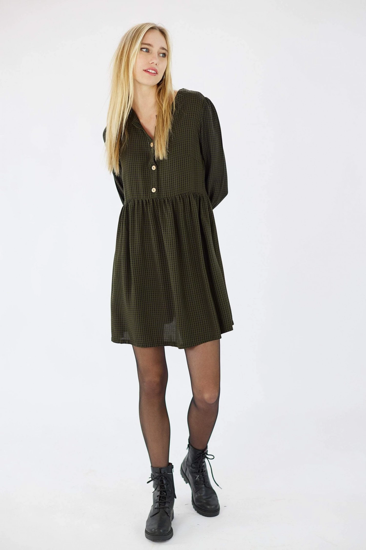 The new Mariza dress is here and it is exactly what you need! Plain and simple in a beautiful checked pattern in olive green and black. In addition, this beautiful dress has an elegant V-neckline with buttons and two small pockets on each side of the skirt. Combine it with your white sneakers or ankle boots and let the world shine!