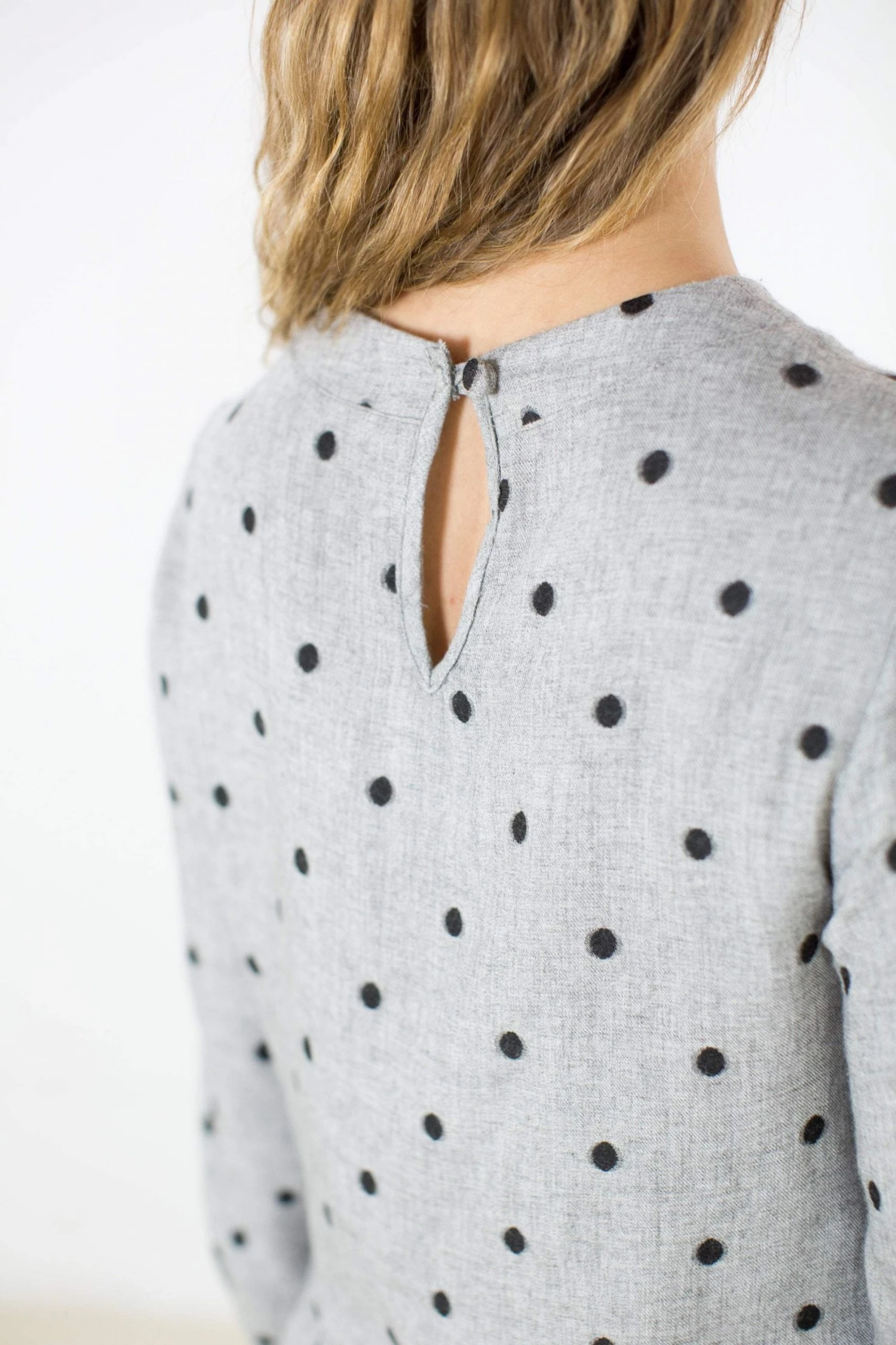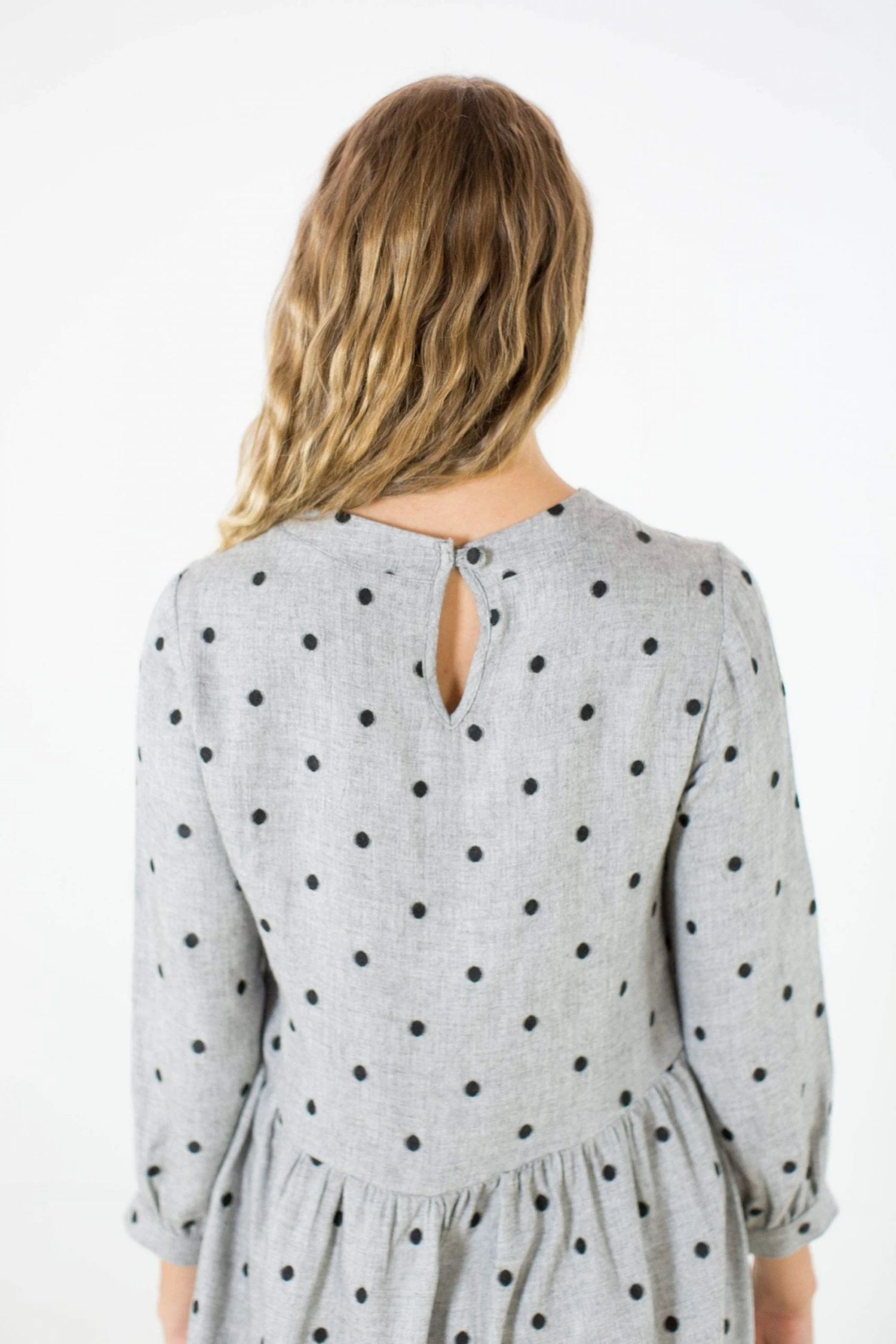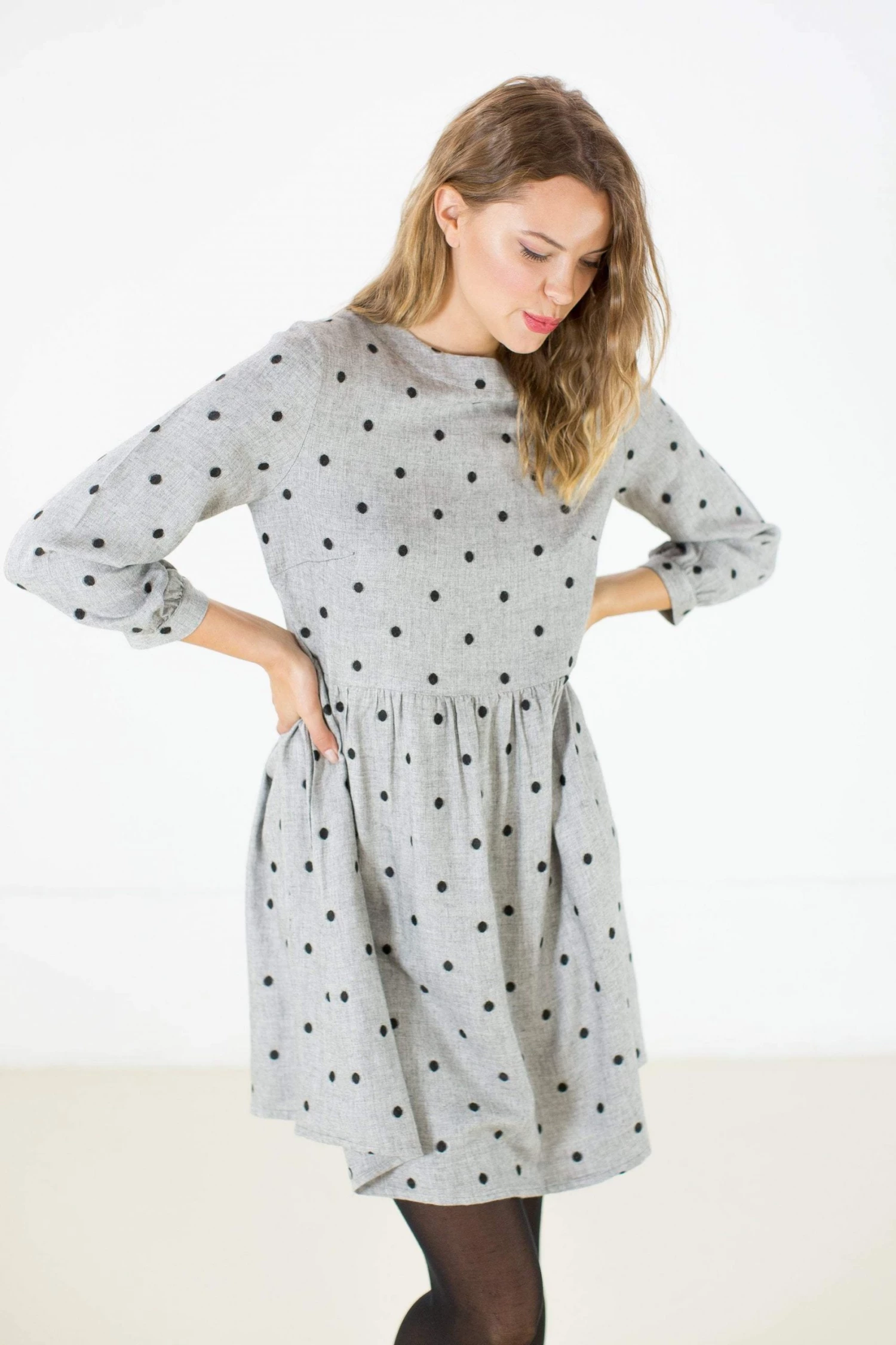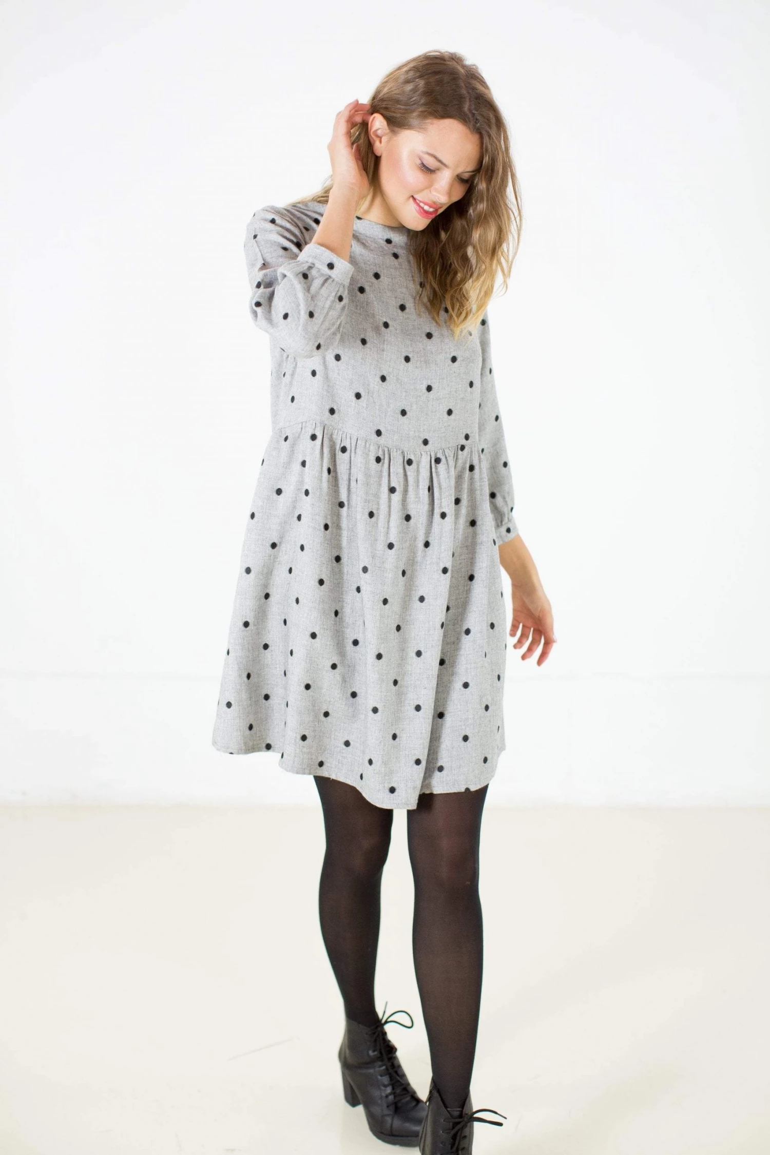 Dress ‘Naria’ in grey and black polka dots. Loose fit, round neckline, small side pockets and a cute little button at the neck. Easy to wear for an everyday look, you can match it with your army boots for a rock morning look or with some heeled and funky sheer tights for a night out! Make it yours now (;