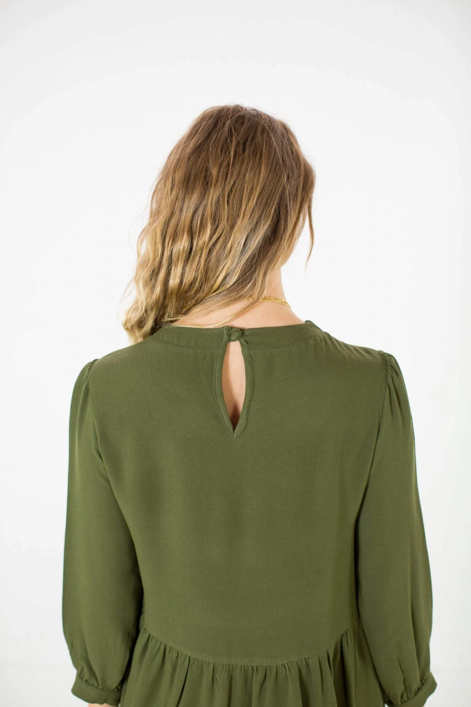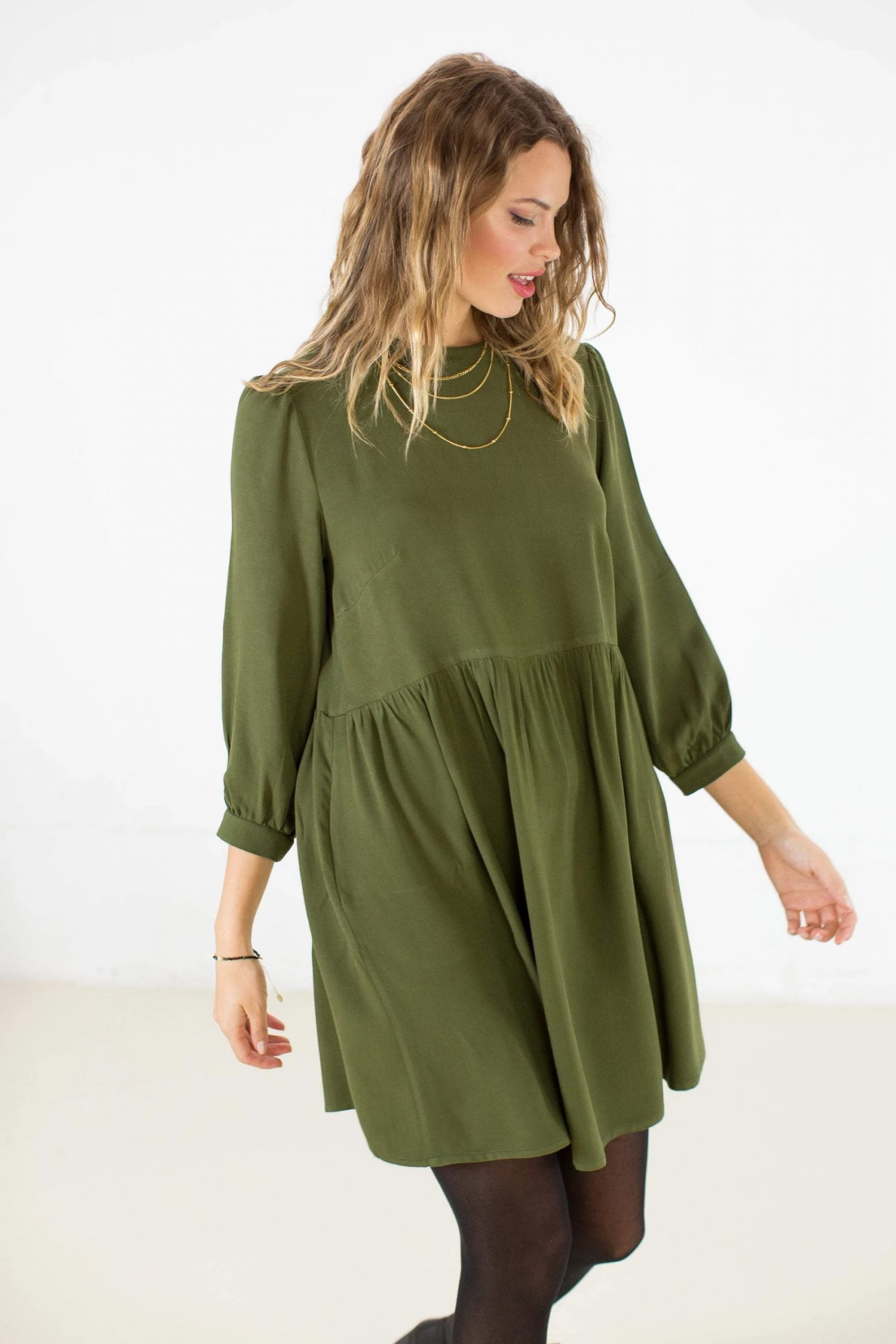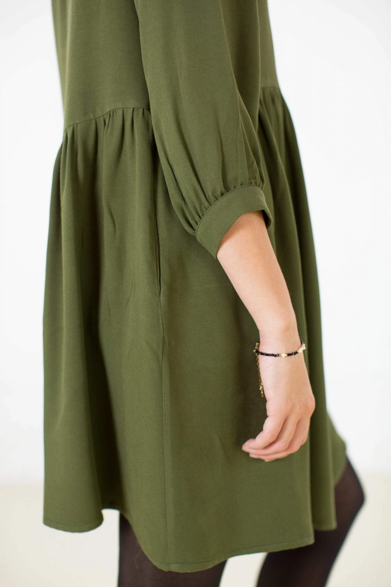 Dress ‘Naria’ in great olive green colour. Loose fit, round neckline, small side pockets and a cute little button at the back. Easy to wear for an everyday look, you can match it with your army boots for a rock morning look or with some heeled and funky sheer tights for a night out! Make it yours now (;