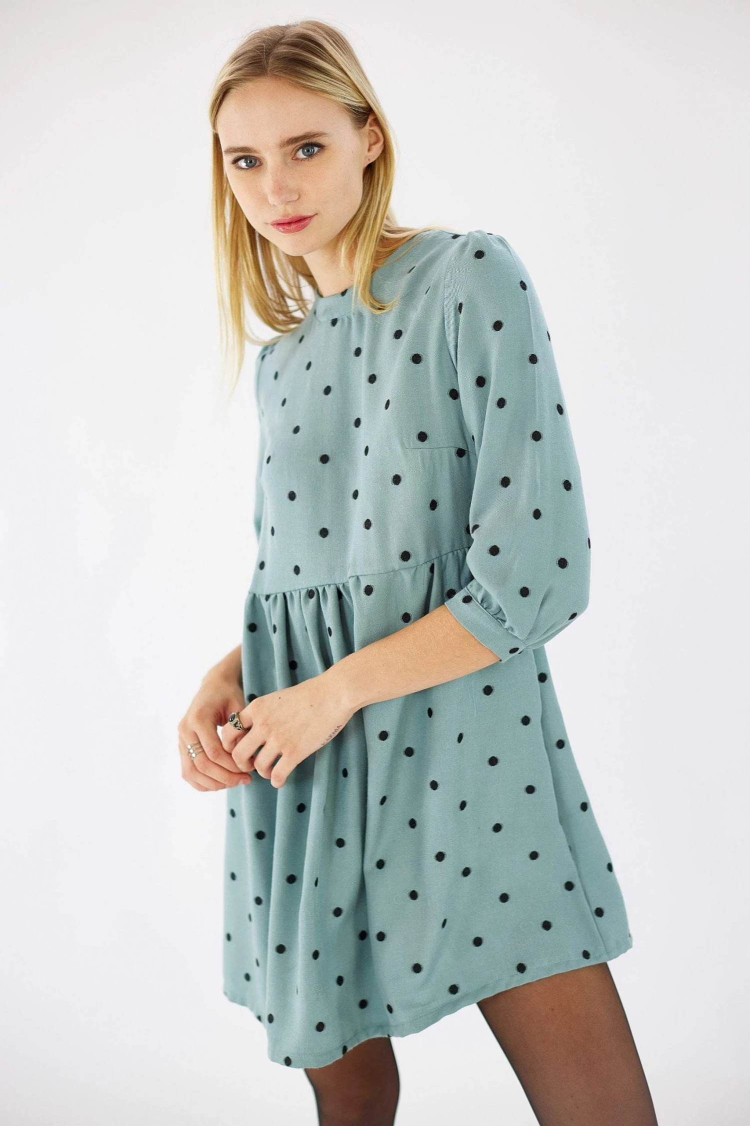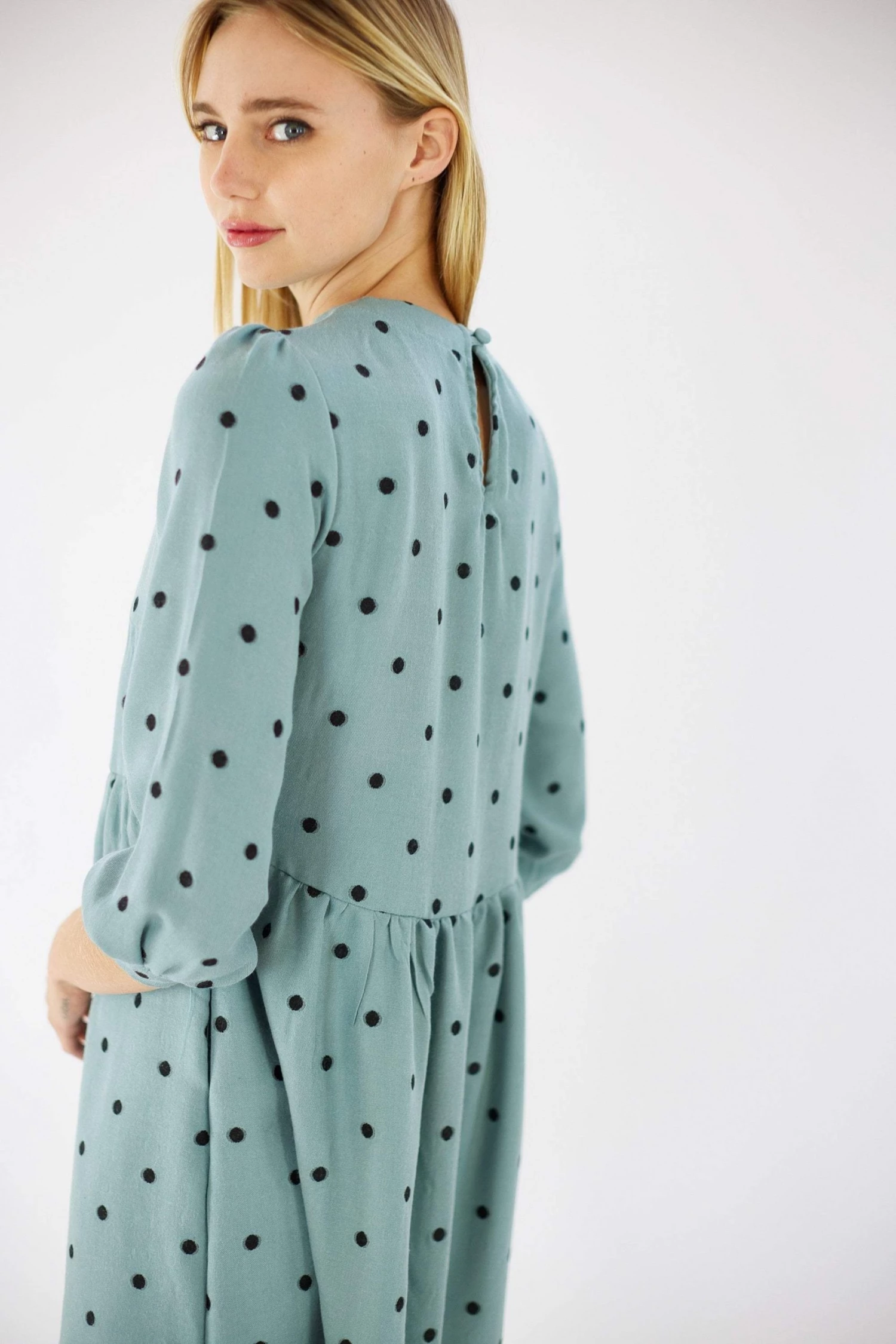 Dress ‘Naria’ in mint and black polka dots. Loose fit, round neckline, small side pockets and a cute little button at the neck. Easy to wear for an everyday look, you can match it with your army boots for a rock morning look or with some heeled and funky sheer tights for a night out! Make it yours now (;