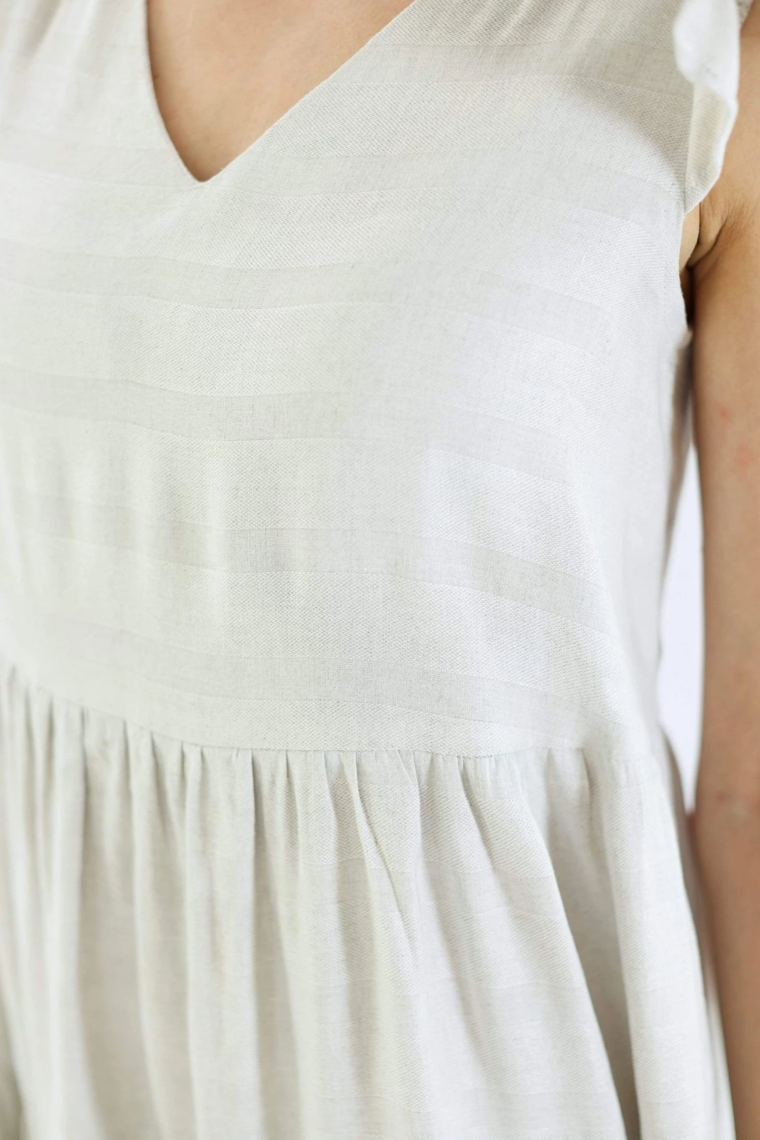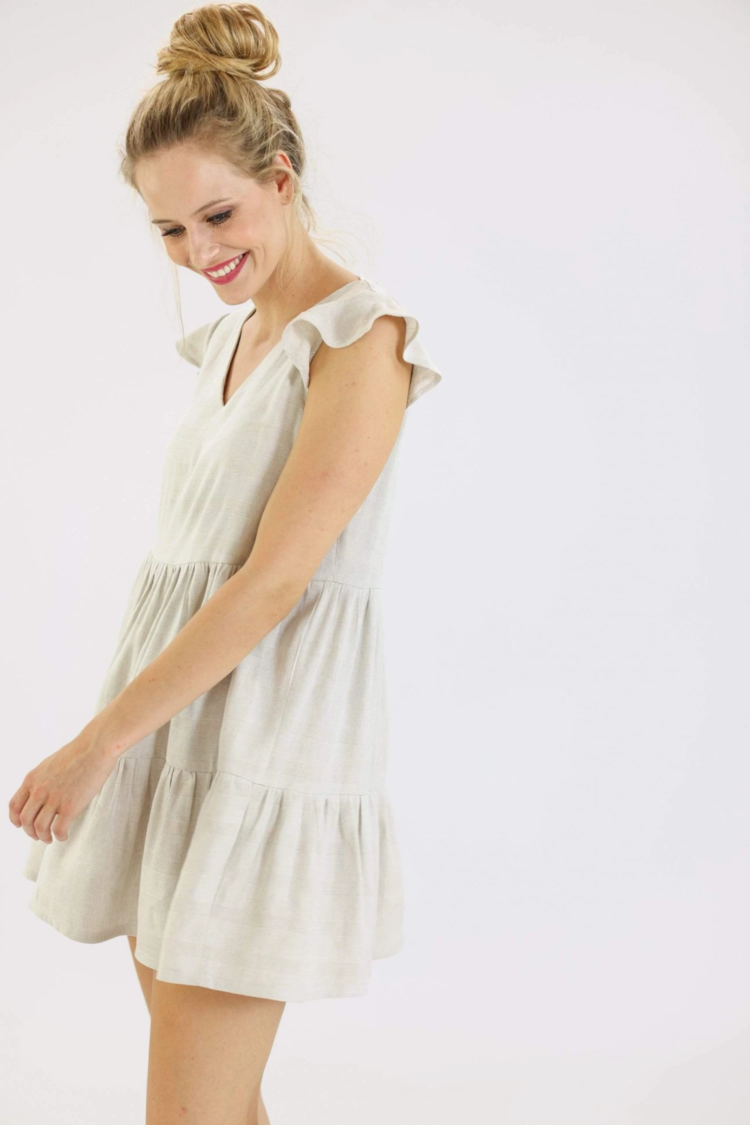 Mini Dress ‘Syros’ in a beige color . With a loose fit and a V neckline. Short sleeves with ruffles, adding a more playful touch. Easy to wear for a fit and flare style!