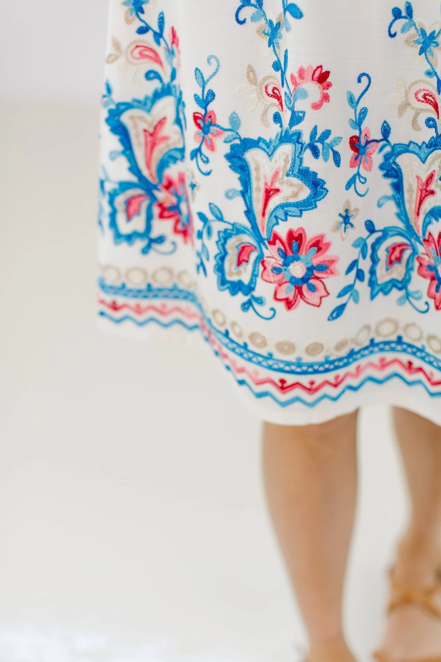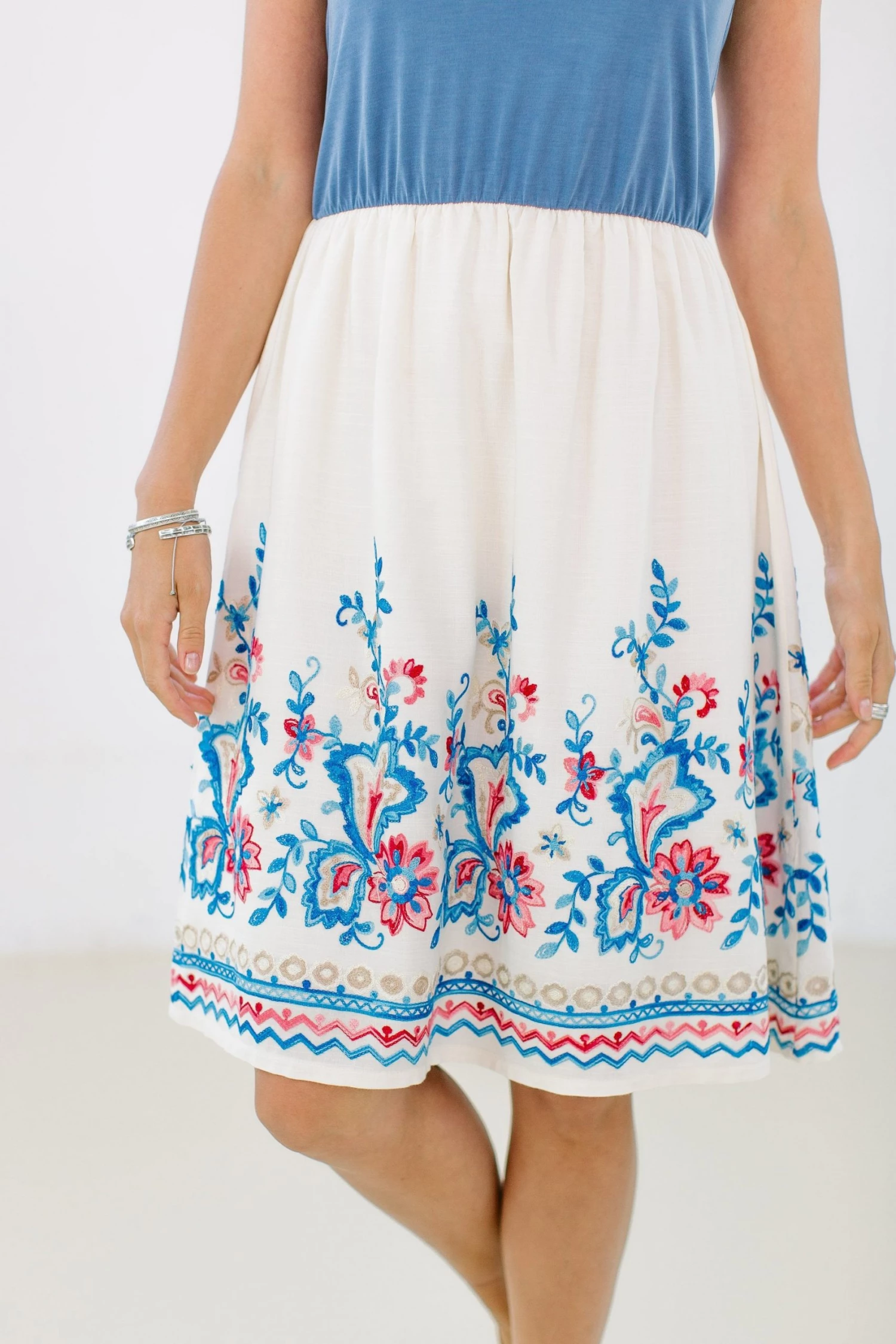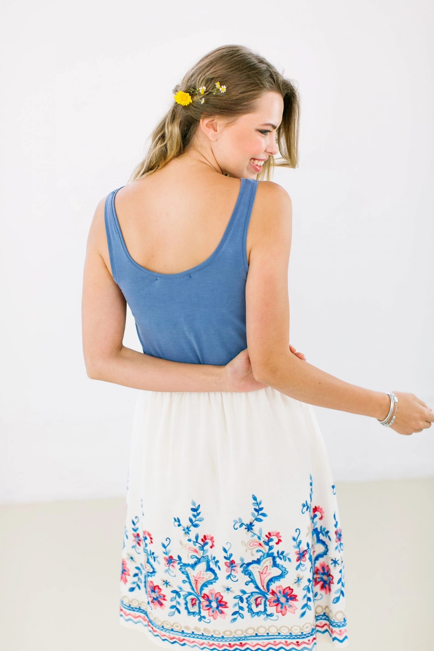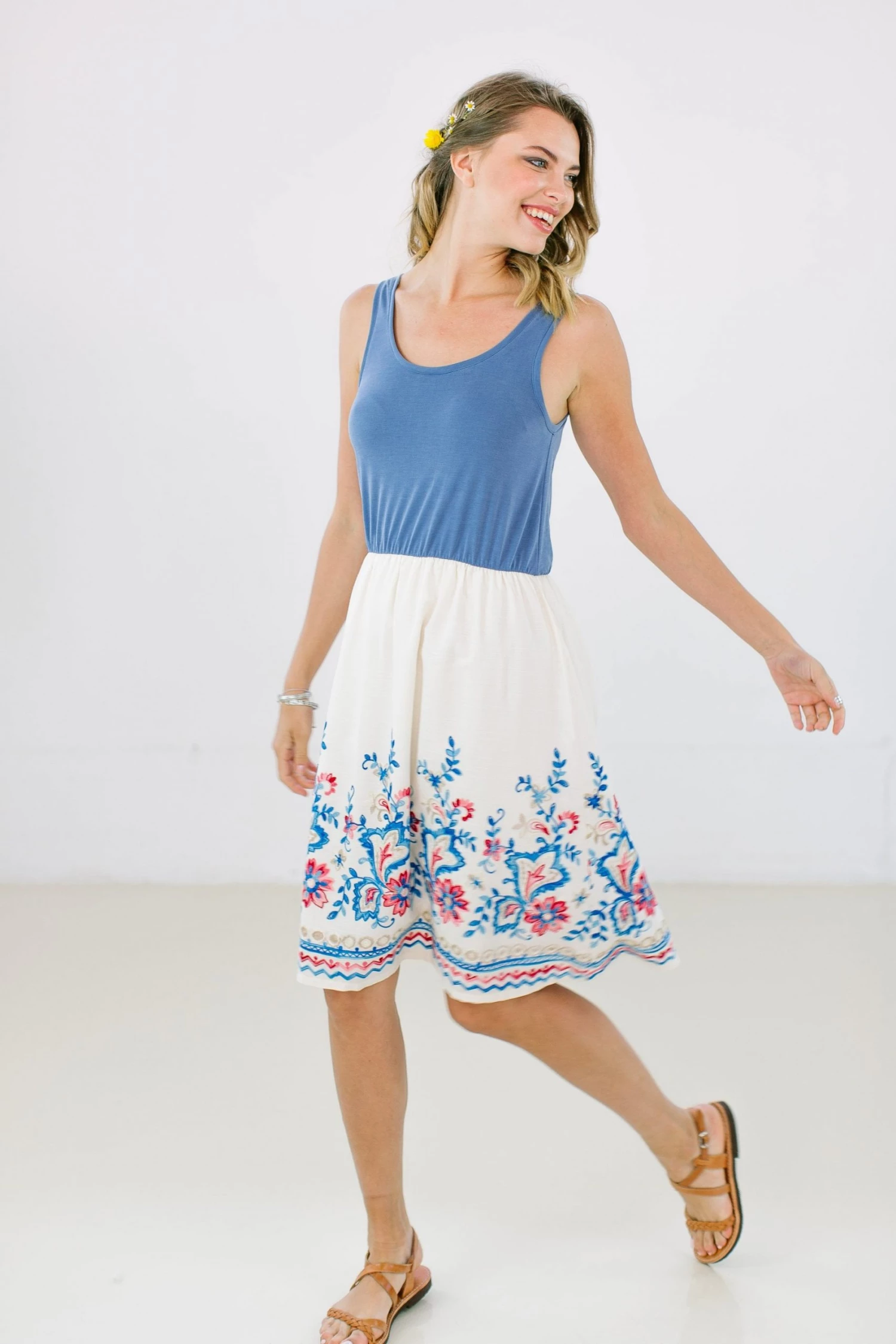 A sleeveless midi dress with a twist! Its classic boat neck and elastic waist make this dress very comfy. It features a gorgeous floral folk print in blue and pink on its skirt and a lovely blue casual front bodice! Everybody loves a casual summer dress when it gets a little too hot and Lucy is a great choice from dusk till dawn!
