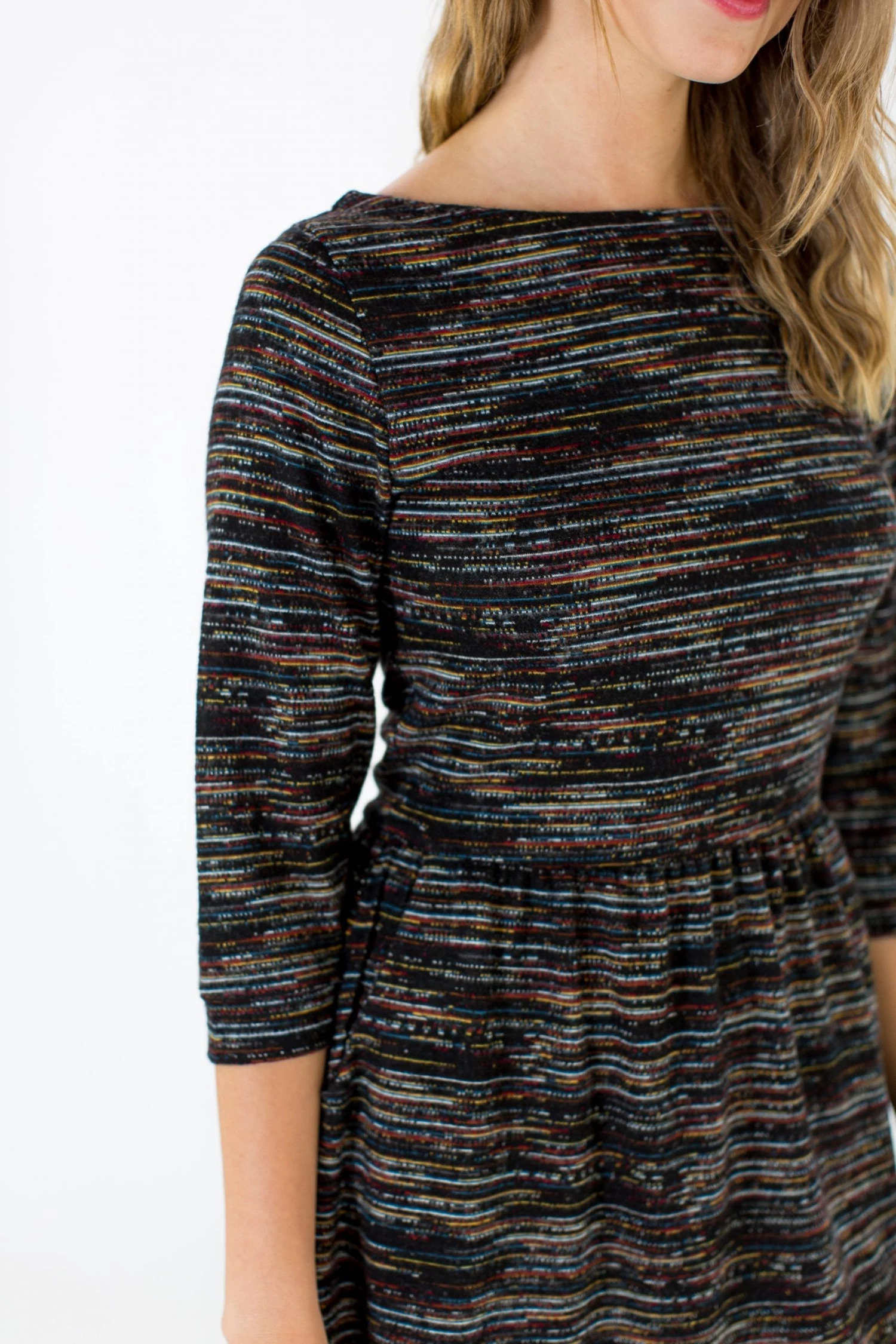 The girlie flattering cut and the black colour will colourful lined details will elevate your mood instantly. This beauty has an elegant boat neck, a cute button at the end of each sleeve and two small pockets on each side. Match it with your sneakers or ankle boots and dazzle the world!Â