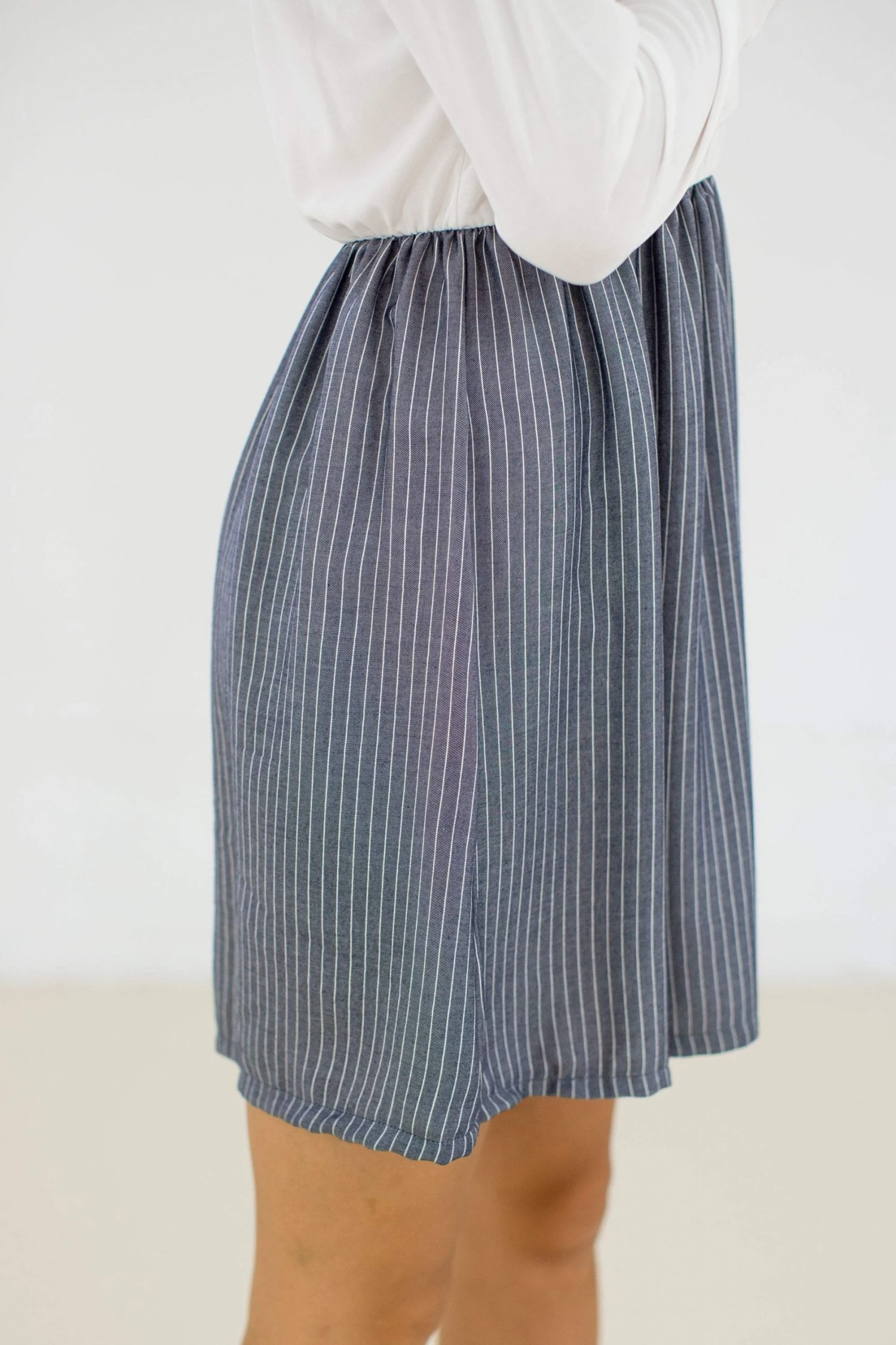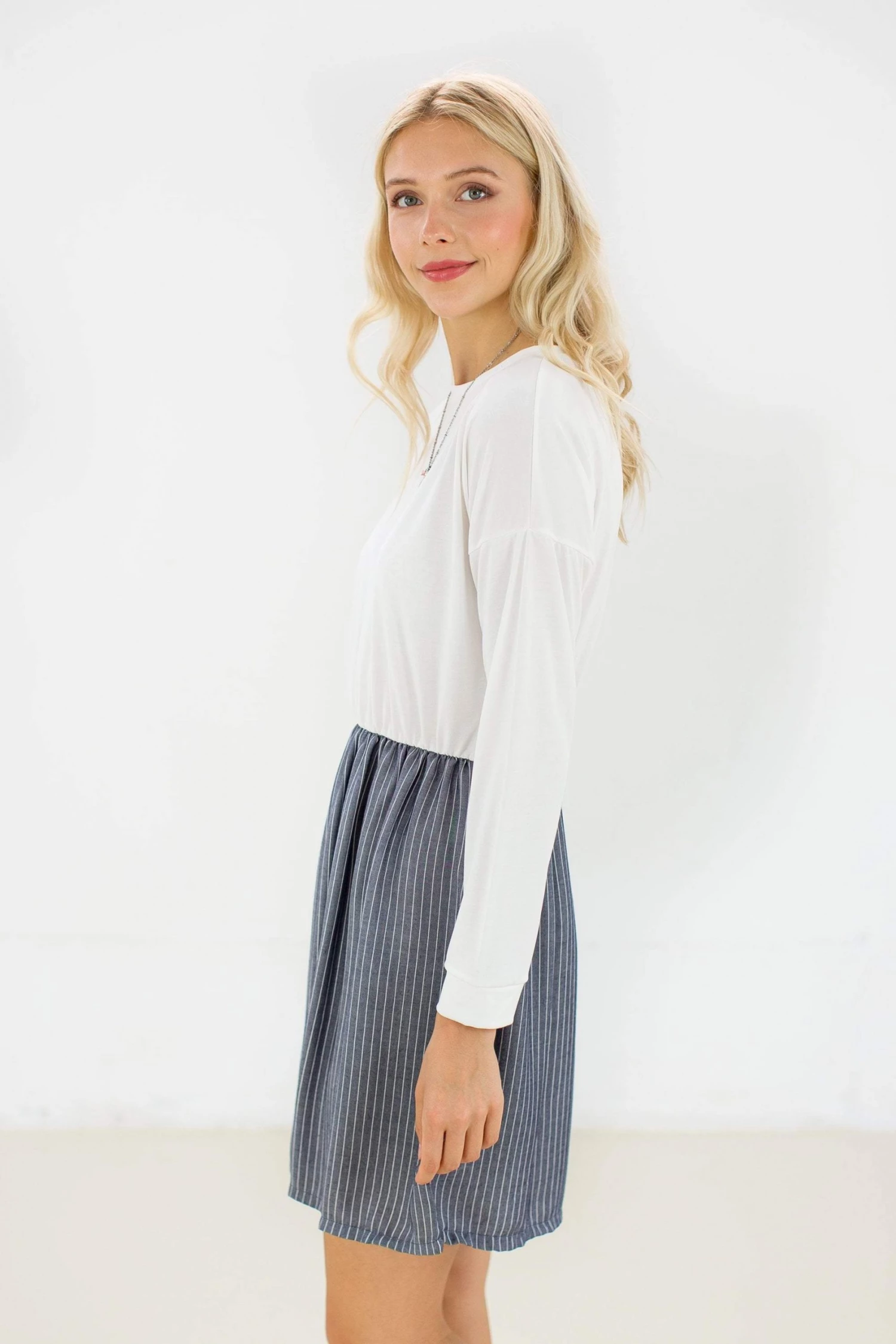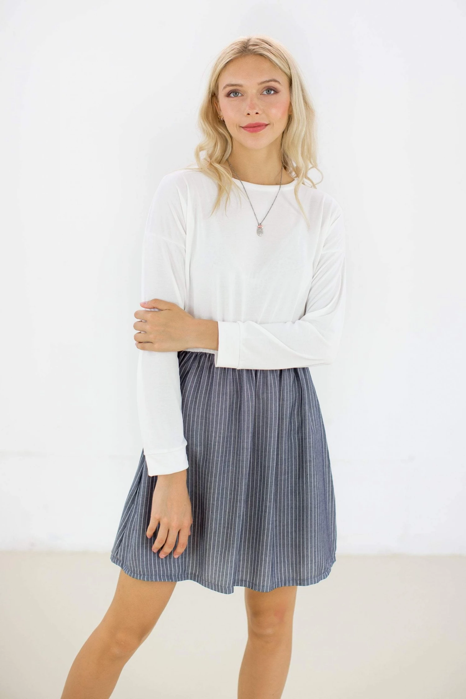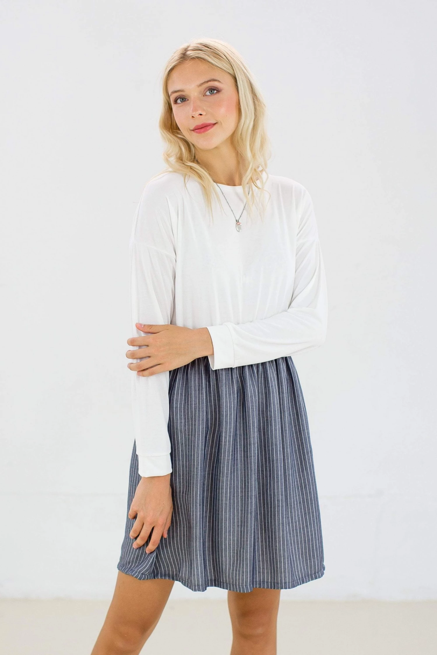 An elegant yet playful dress with a casual white sleeved bodice and a flattering grey with white stripes. Great for an office look during the day and styled with some additional accessories an ideal outfit for a night out too. Put it on and get ready to conquer this season!Â