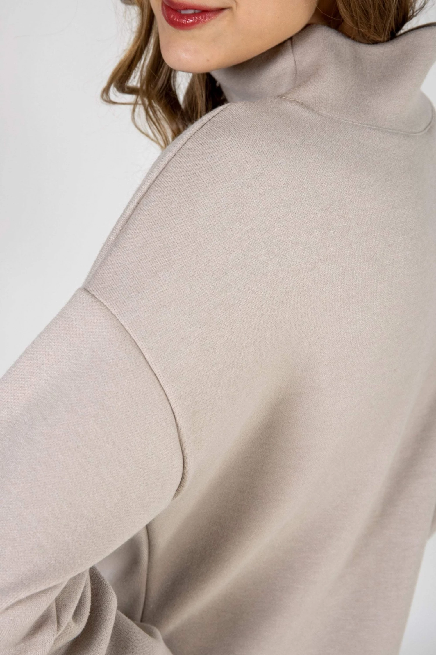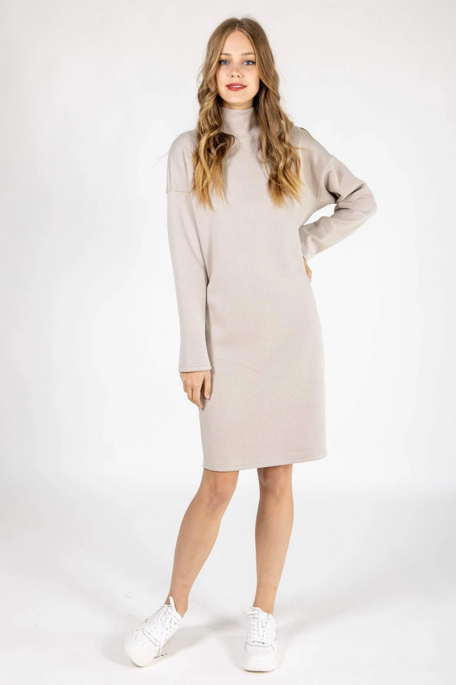 Sweater dress Skylar in beige. With a high neck and a cozy beige fabric that makes it incredibly easy to wear. This dress is one of the cutest and most comfortable cover-ups we’ve come across to date. Dress it up or keep it simple. Perfect dress for lounging around the house or grabbing a quick coffee on a lazy day.Â