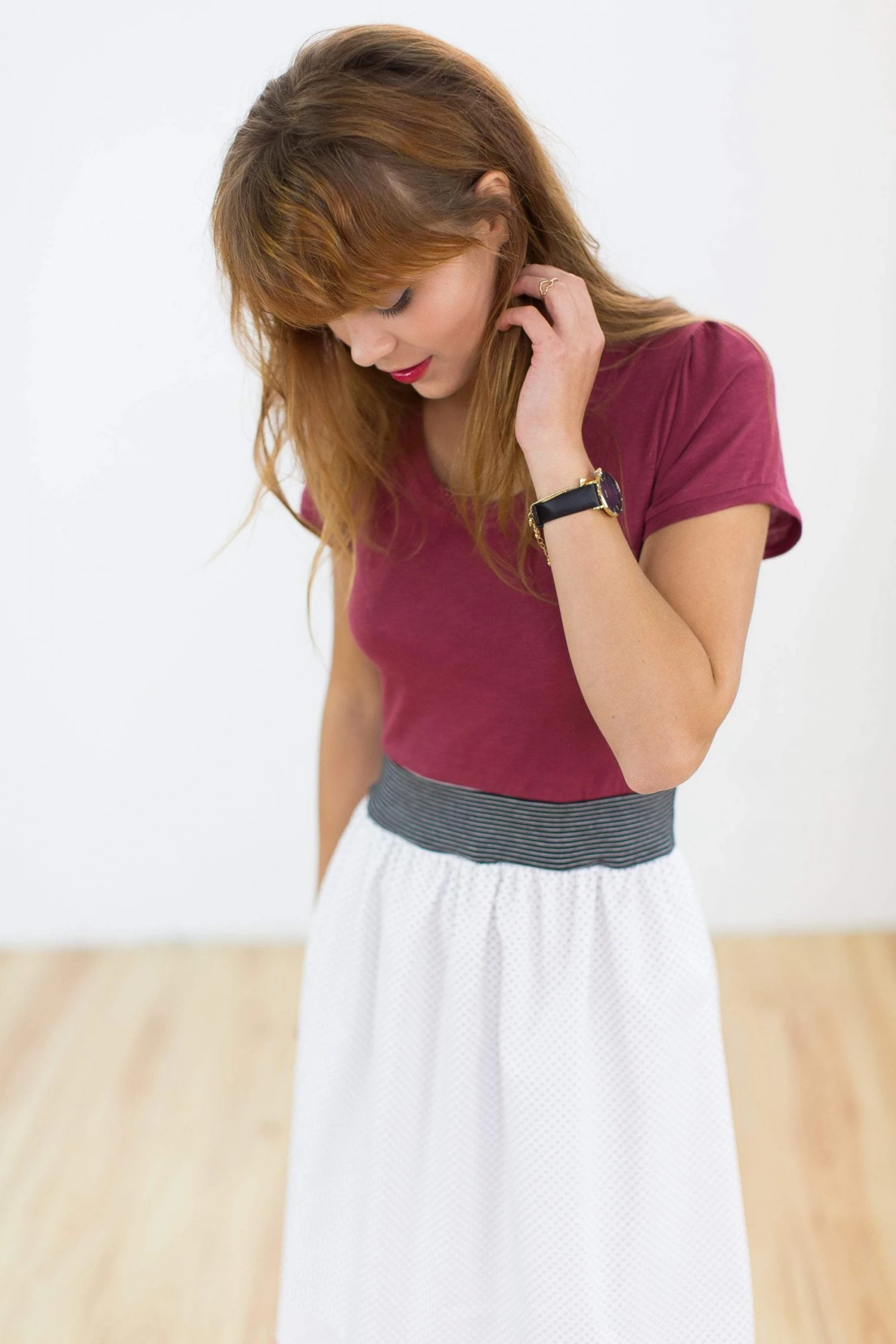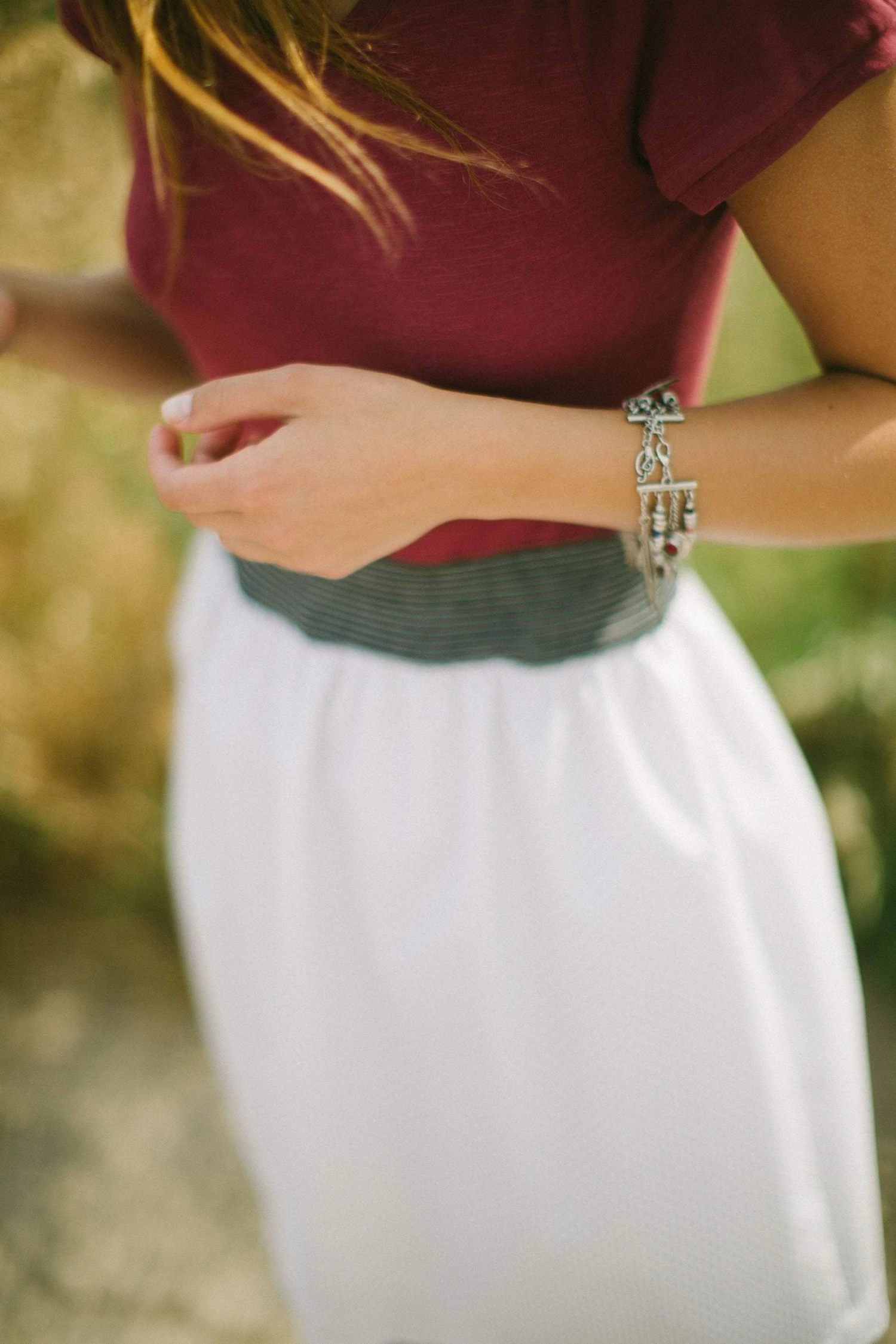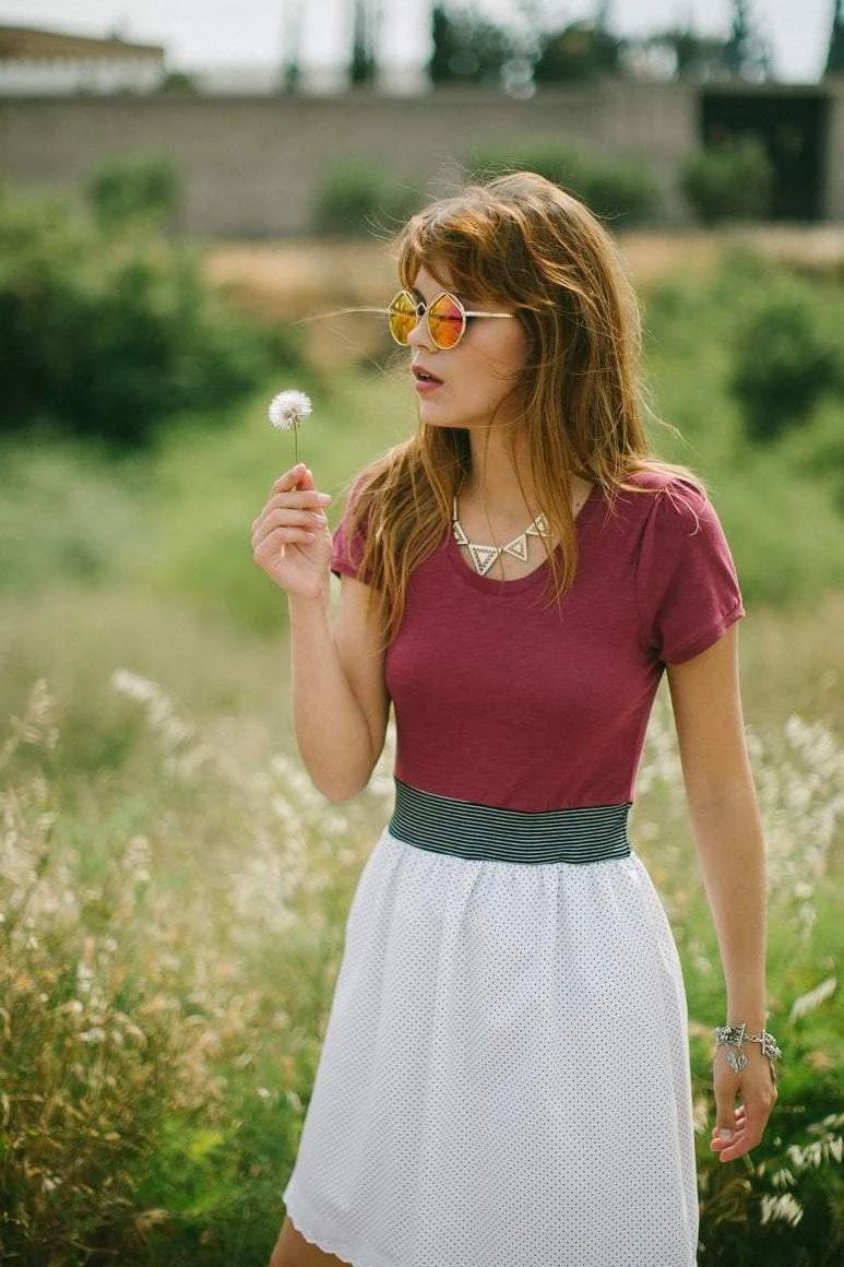 A playful dress with a casual bodice made of dark red cotton jersey and a cute white & black polka dot skirt. The hem is finished off with a fine cotton lace trim. A black and white striped jersey insert at the waist gives the dress a feminine fit. Put it on and get ready to conquer the day.