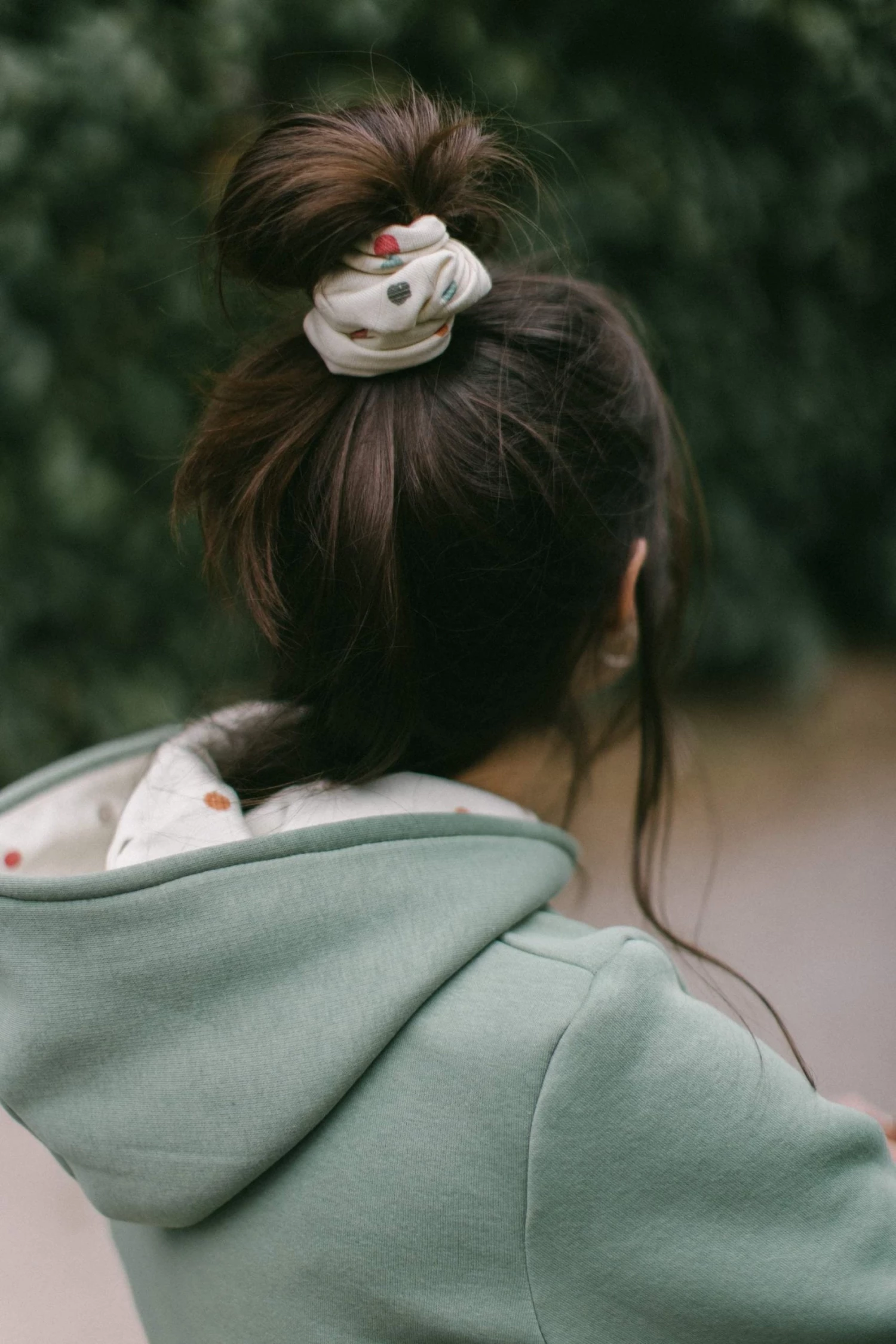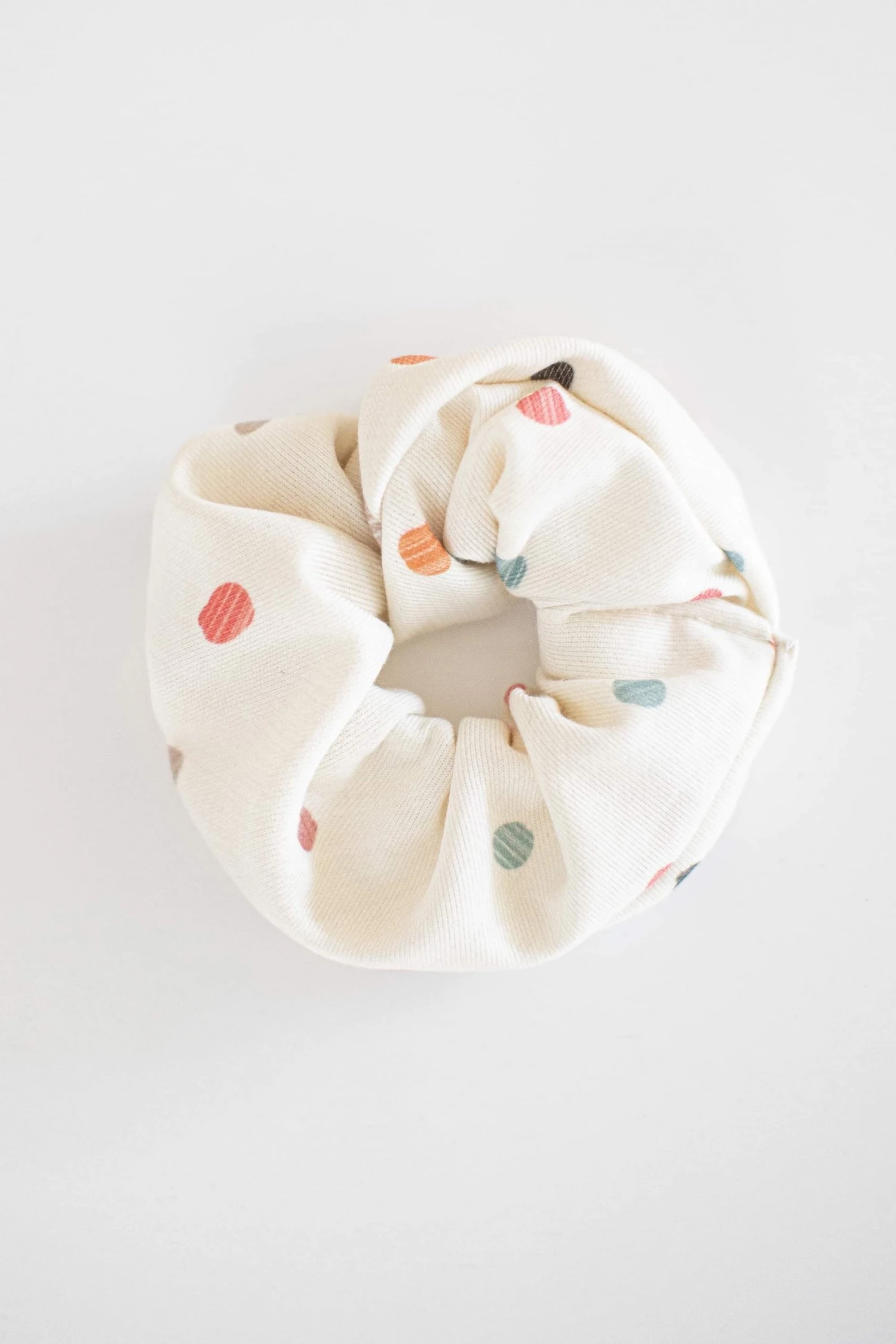 Long hair needs a wardrobe all of its own. No need to worry about flyaway and frizzy hair! Scrunchie with pastel polka dots for a playful hairstyling!
