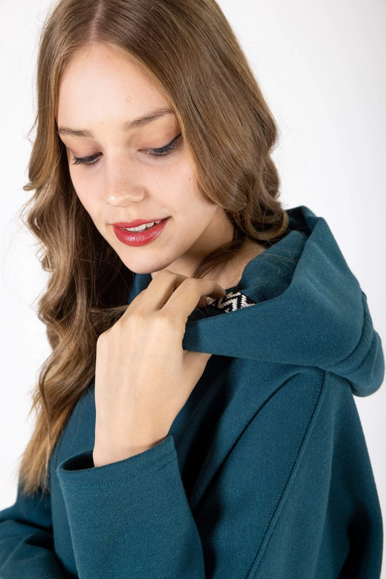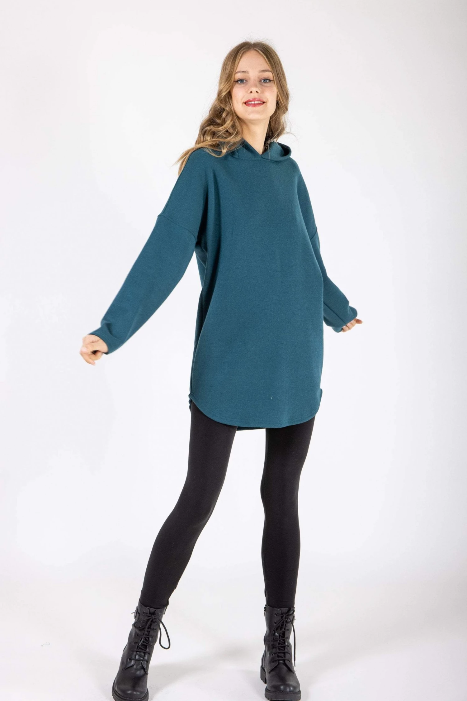 Hoodie ‘Geneva’ in petrol sweatshirt fabric. It’s a long sweater to keep you warm and cozy through the winter! The hood is made from the same fabric decorated with a cute black geometrical ribbon as a detail! Wear with jeans and sneakers for a cute urban look!