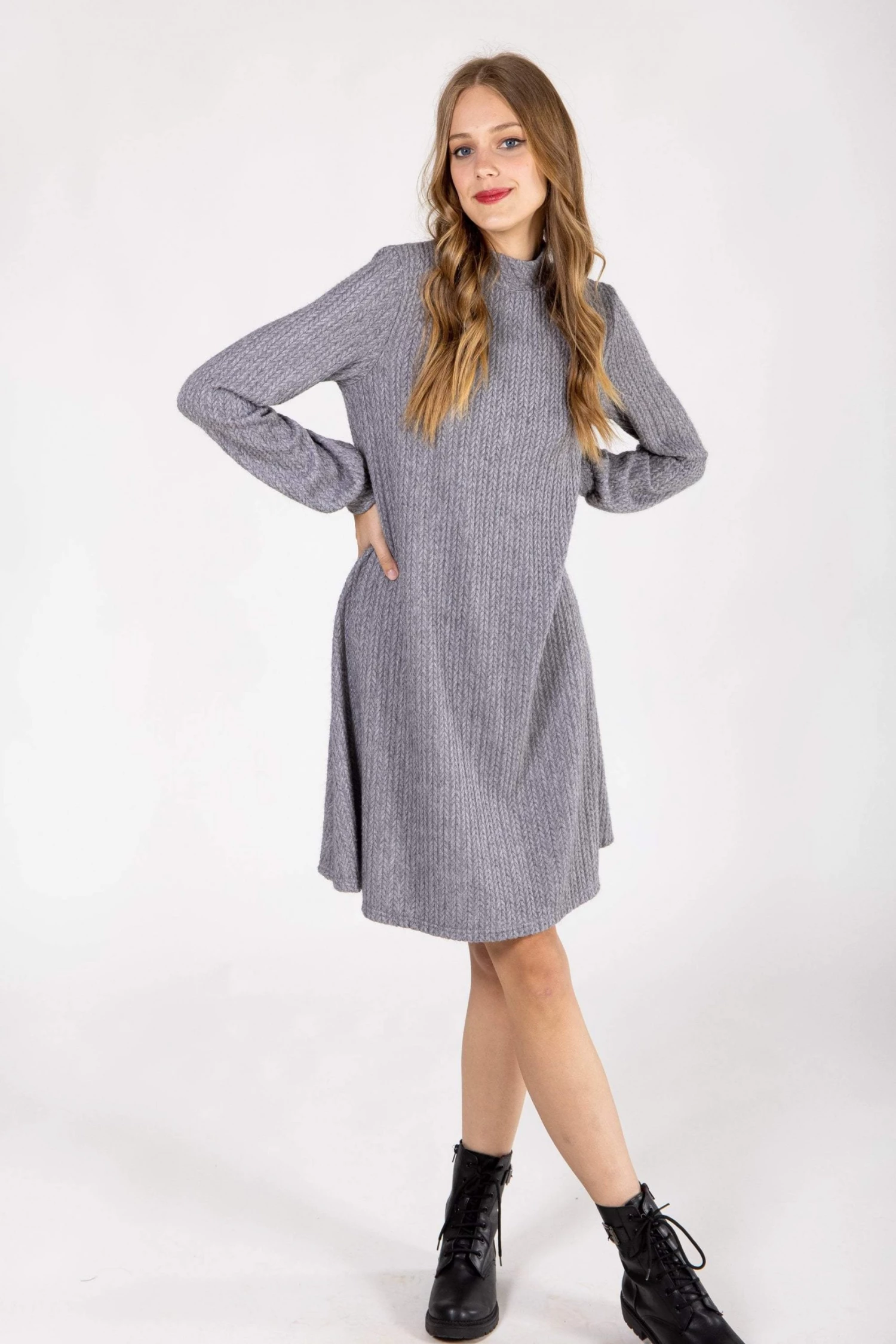This new designed dress is crafted from a soft knit fabric in grey color!It features a high neck and two cute little buttons at the back! The long-sleeves of the dress and its loose fit makes it the coziest dress on your closet for this winter. Combining warm comfort and style all in one dress!