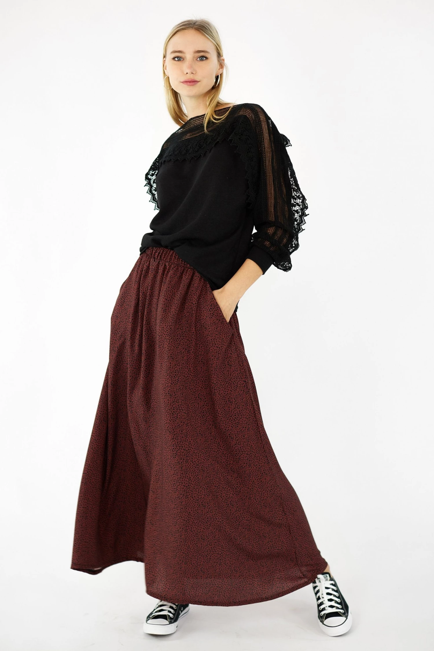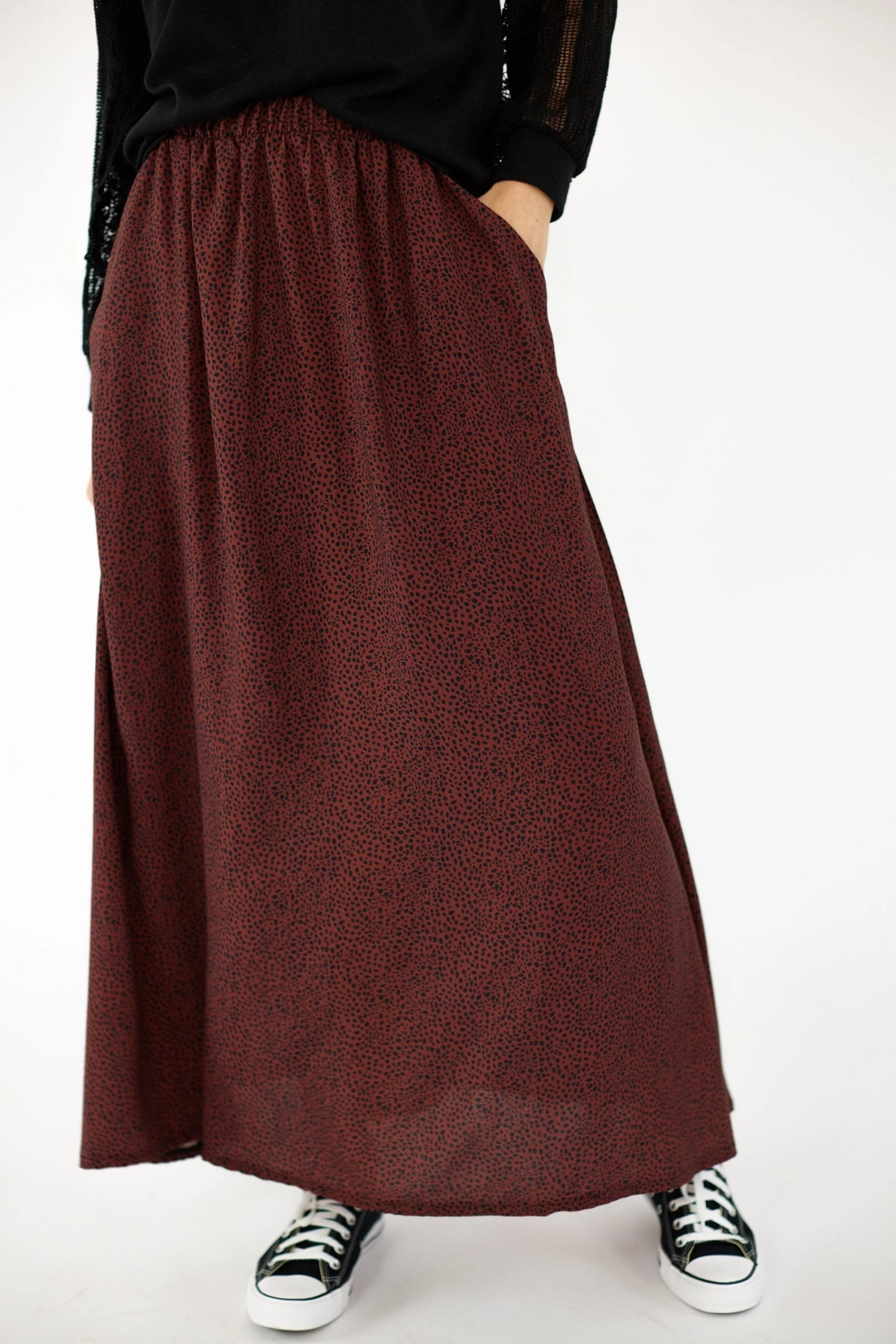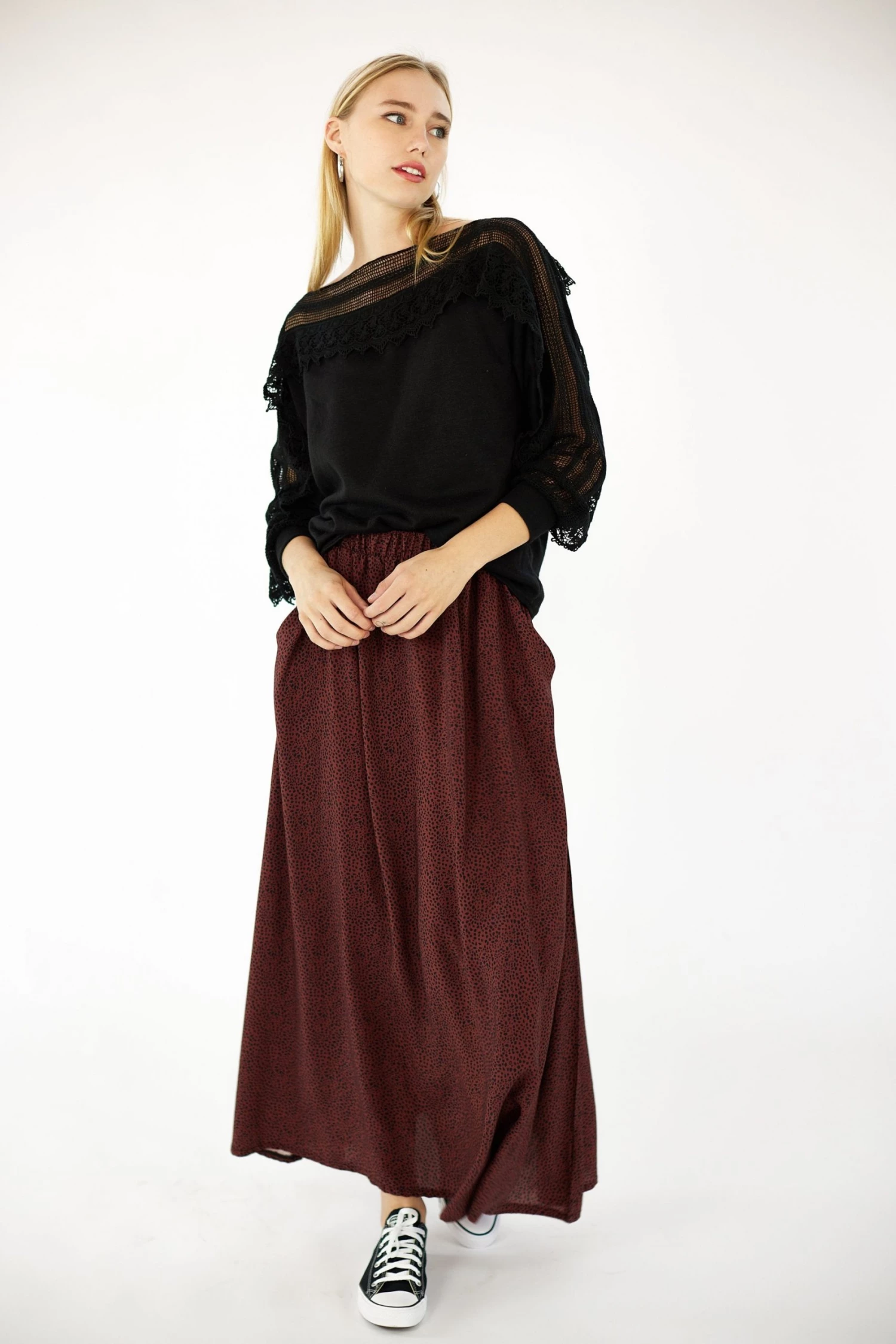 Boho, flared maxi skirt crafted from a chestnut brown fabric with leopard pattern. This skirt is amazing! Just look at it, all flowy and elegant and oh so cool with a crop top. The side pockets and its elastic waistband make it comfortable but with sexy and chic vibes 😉