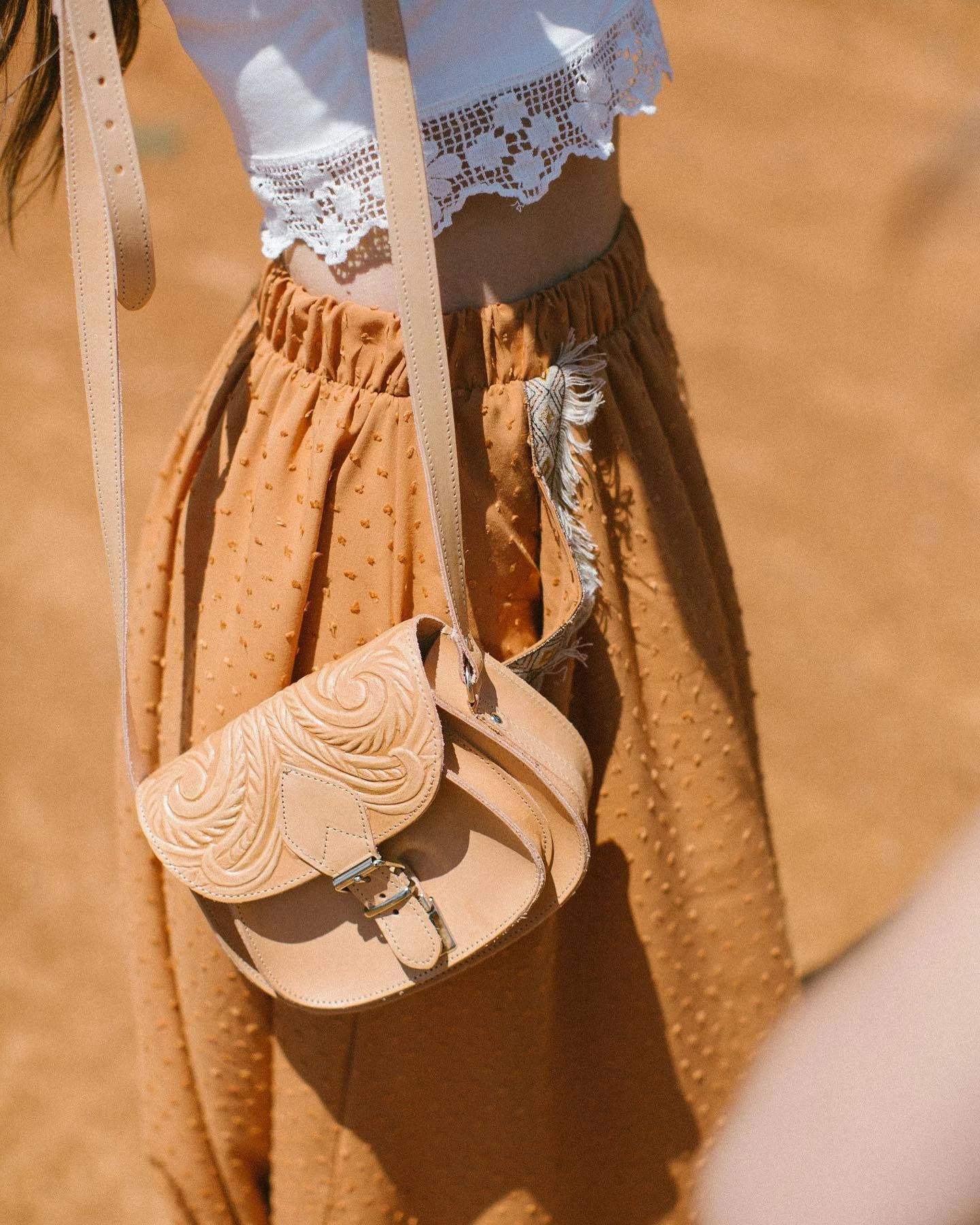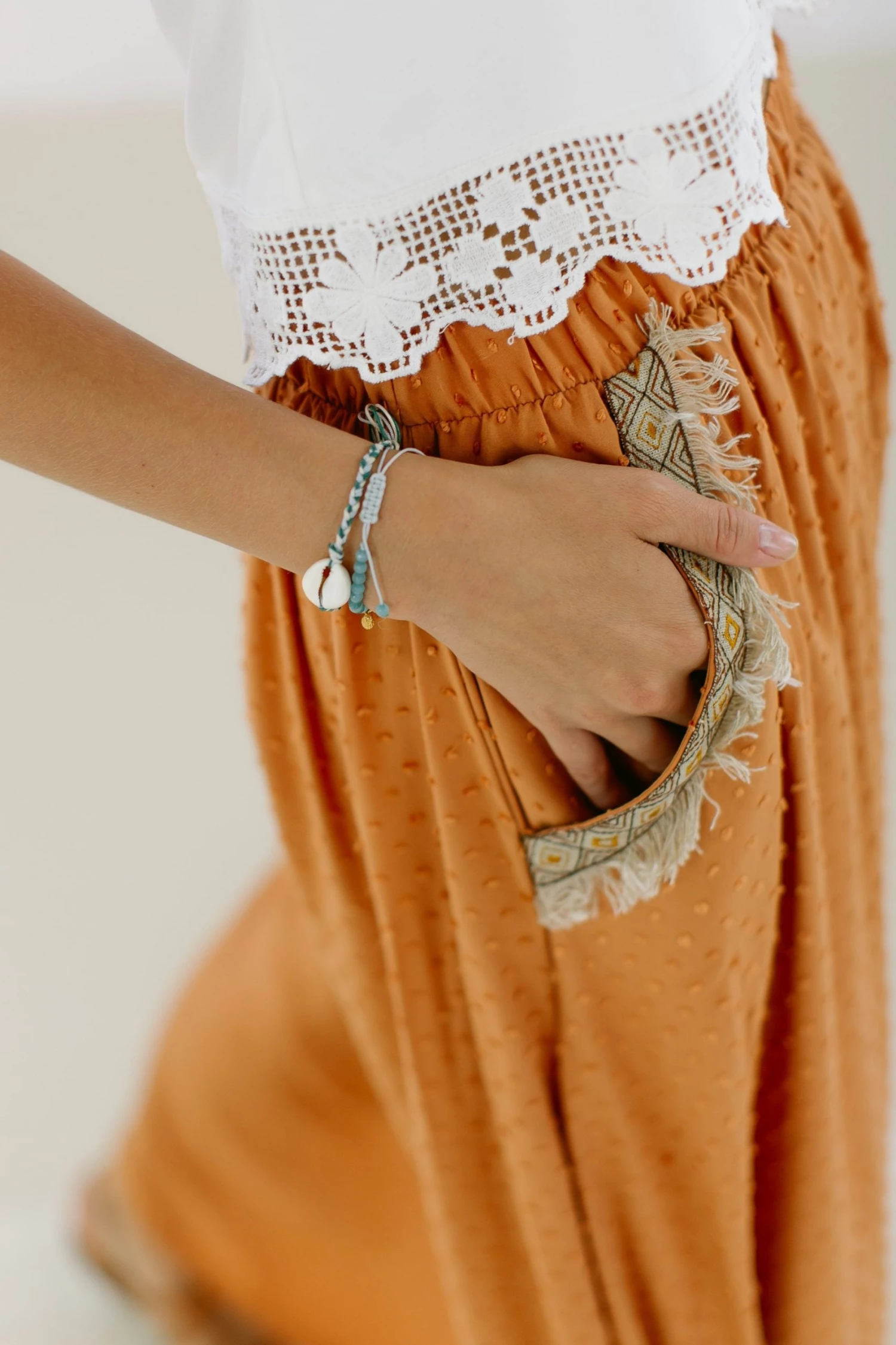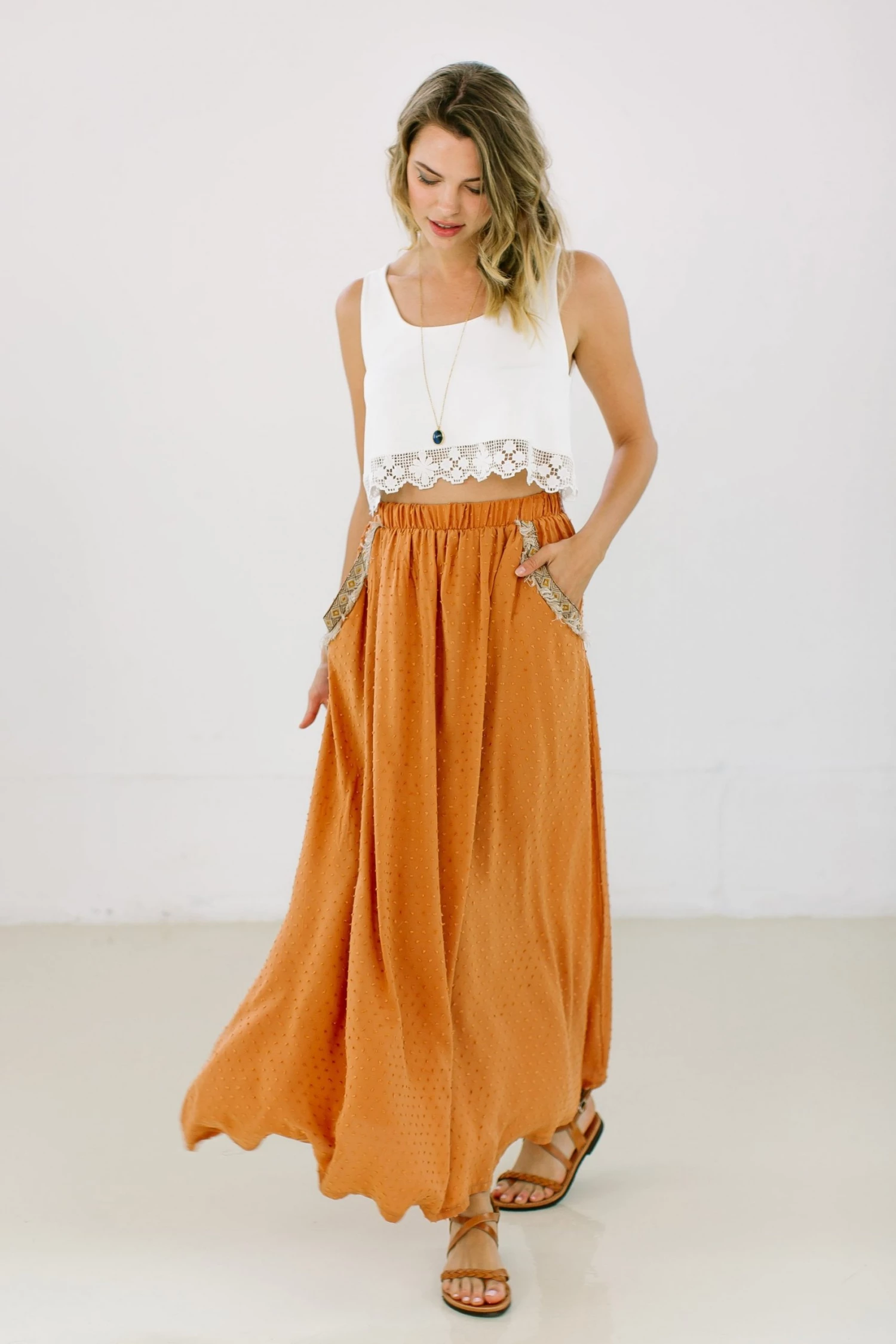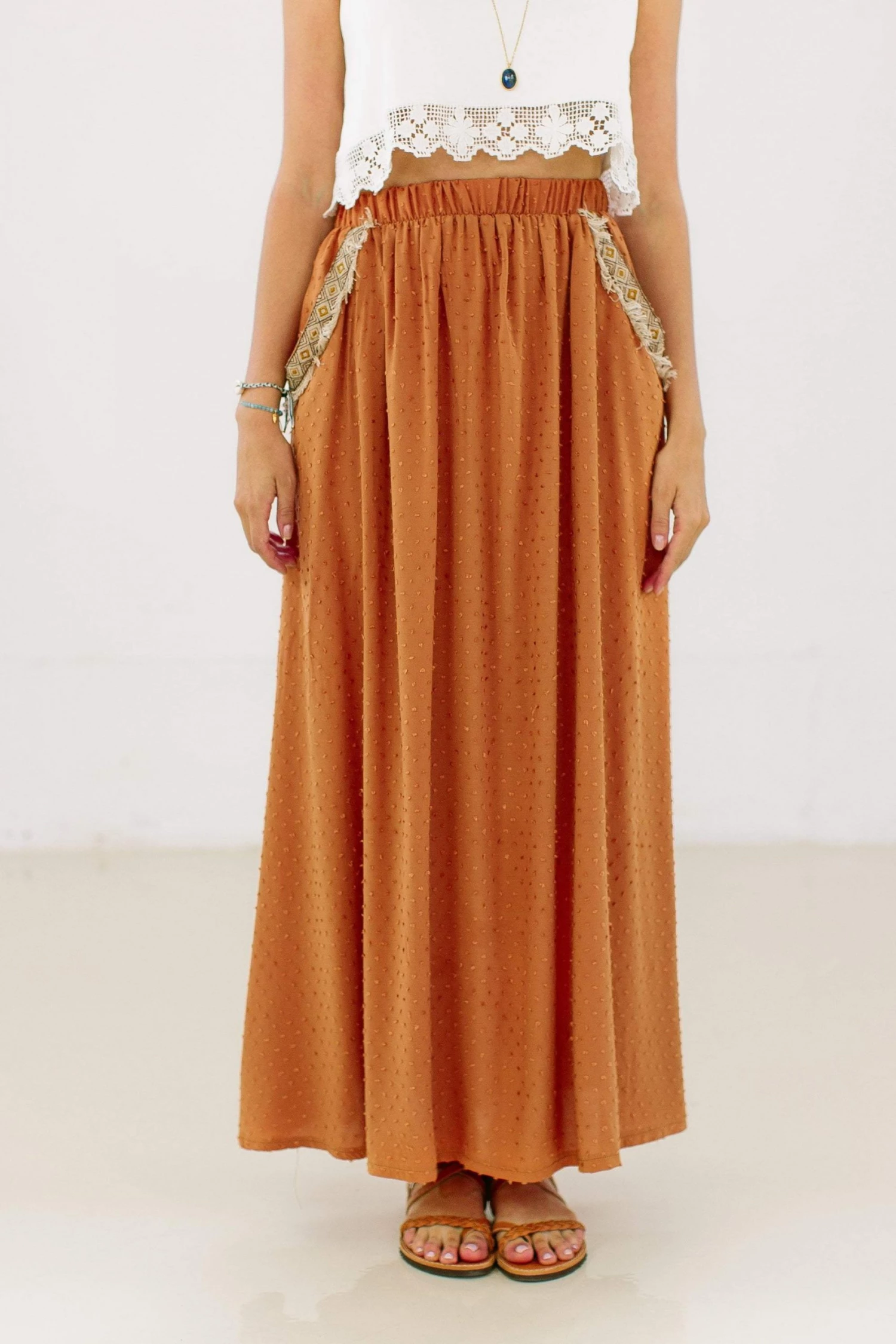 Boho, flared maxi skirt crafted from a light orange fabric embellished with tiny polka dots. This skirt is amazing! Just look at it, all flowy and elegant and oh so cool with a crop top. The side pockets lined with an ethnic ribbon and beige tassels alongside its elastic waistband make it comfortable but with sexy and chic vibes 😉