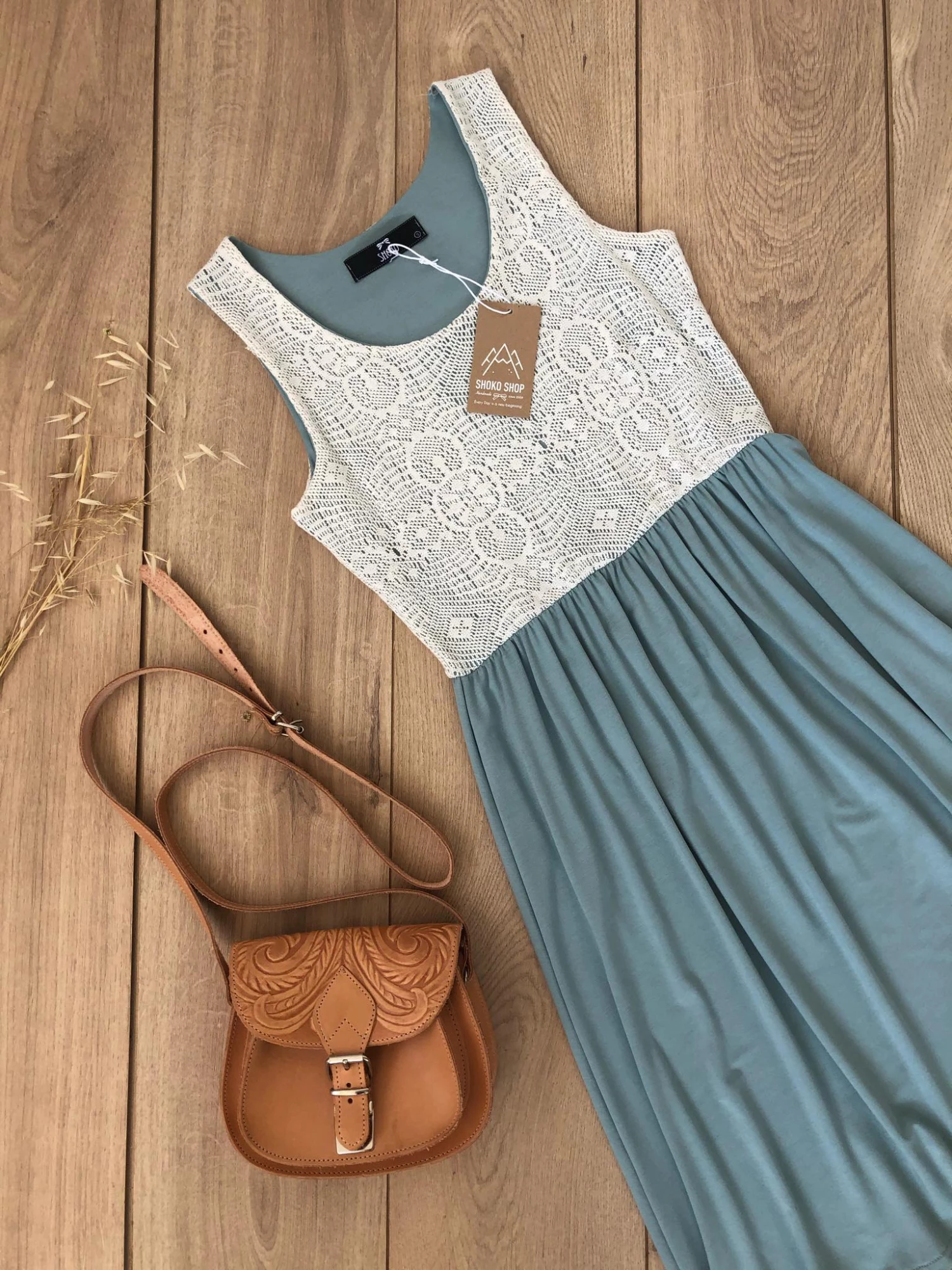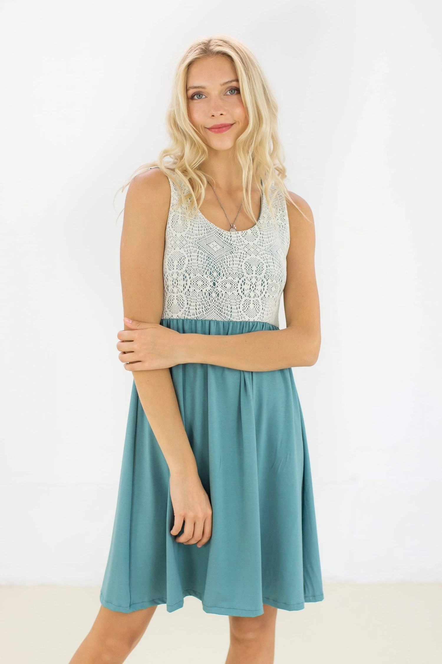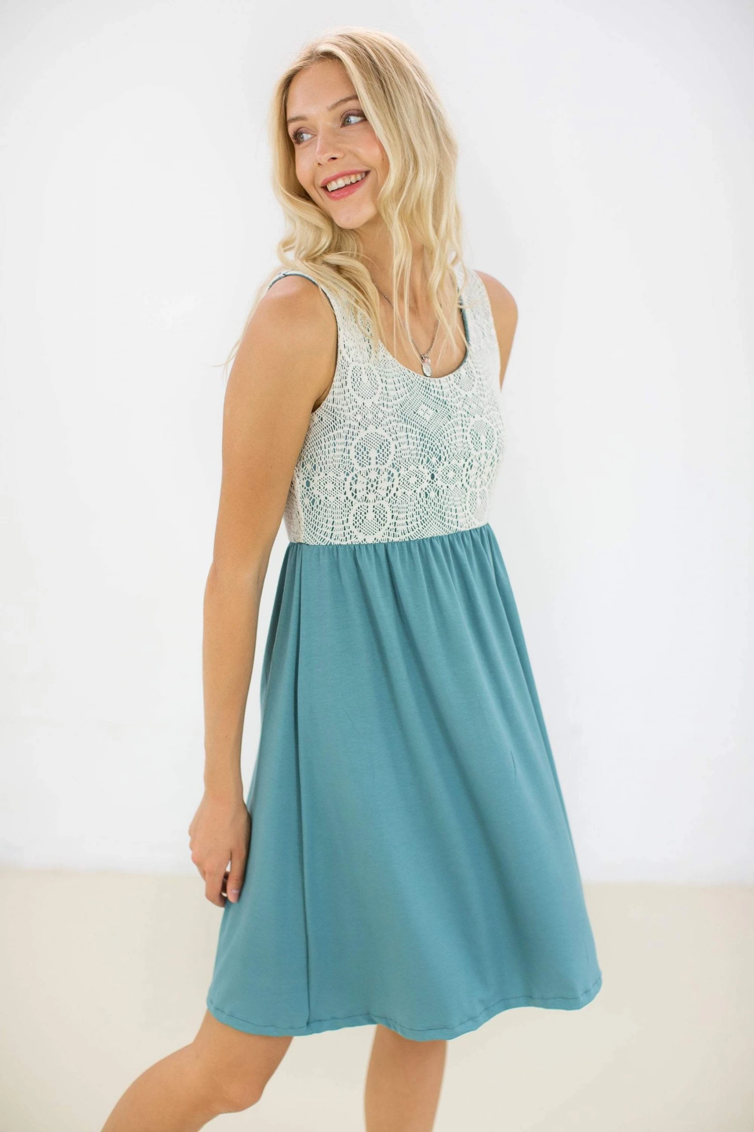 The sweet, mint – coloured midi dress Maya with beautiful lace in cream. The babydoll cut with its elastic waist is super comfortable and will make you look chic and sexy. Style it with your favourite sandals or sneakers and get ready to seize the day!