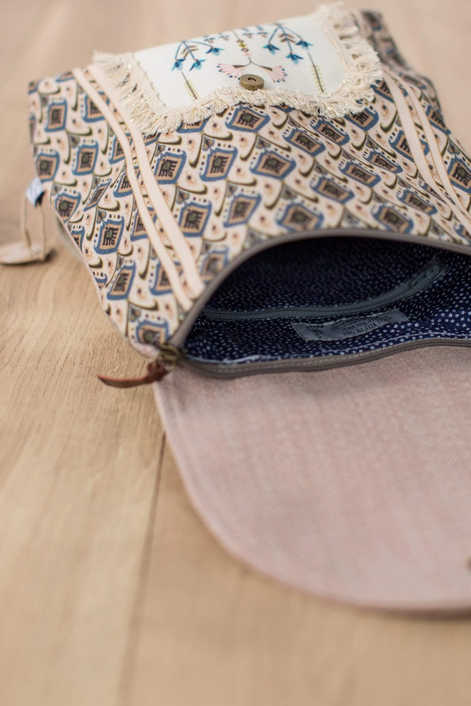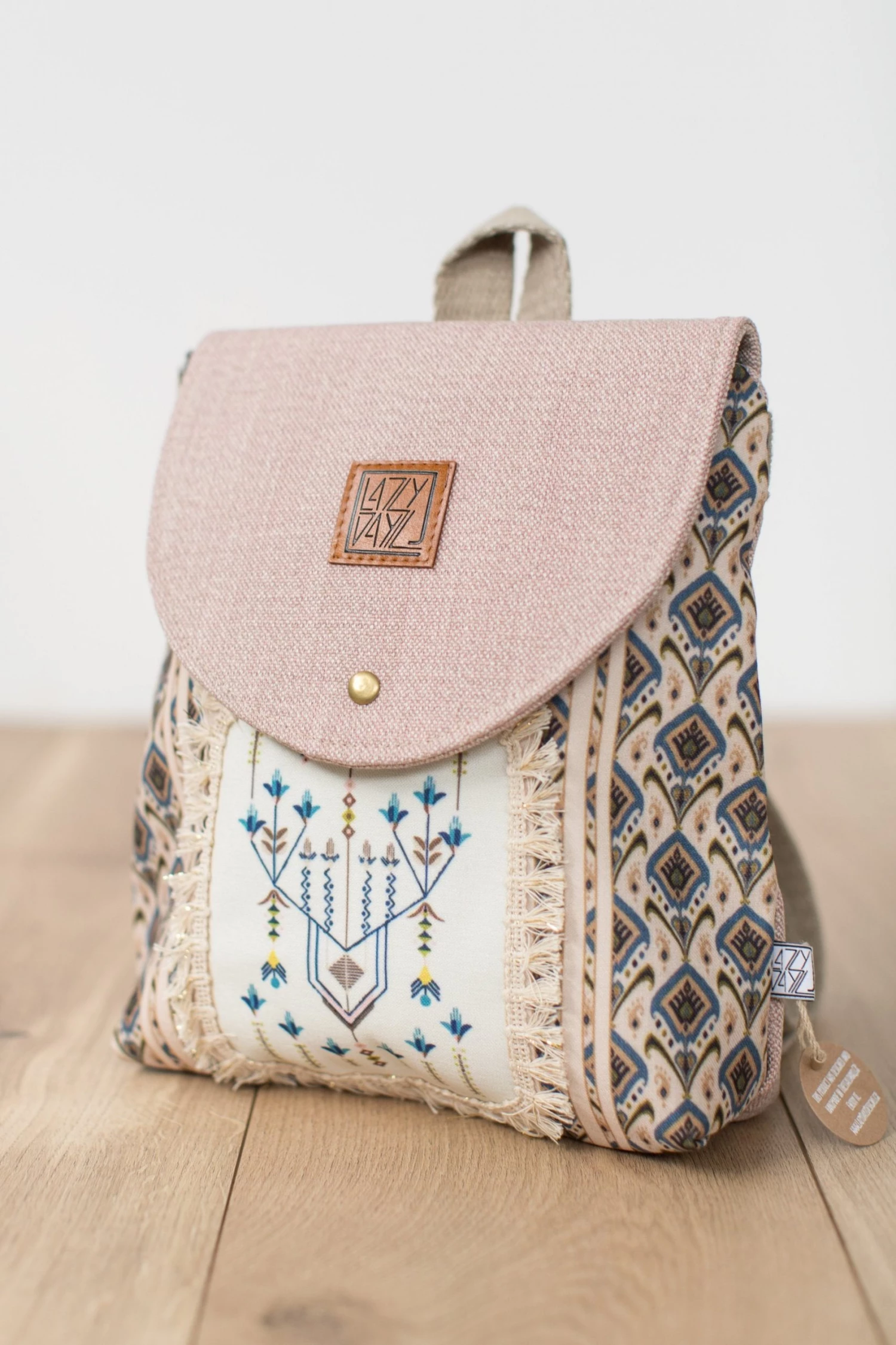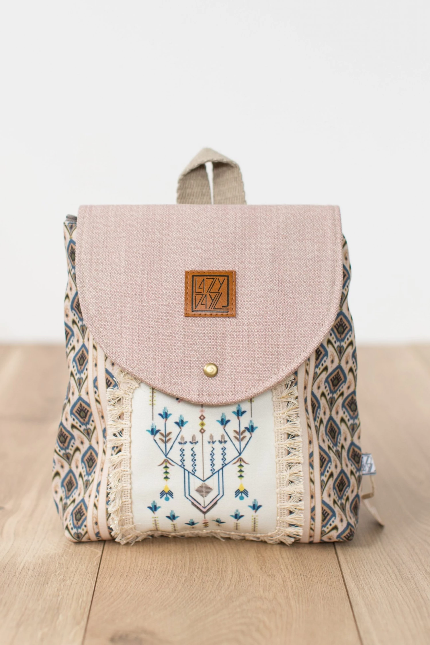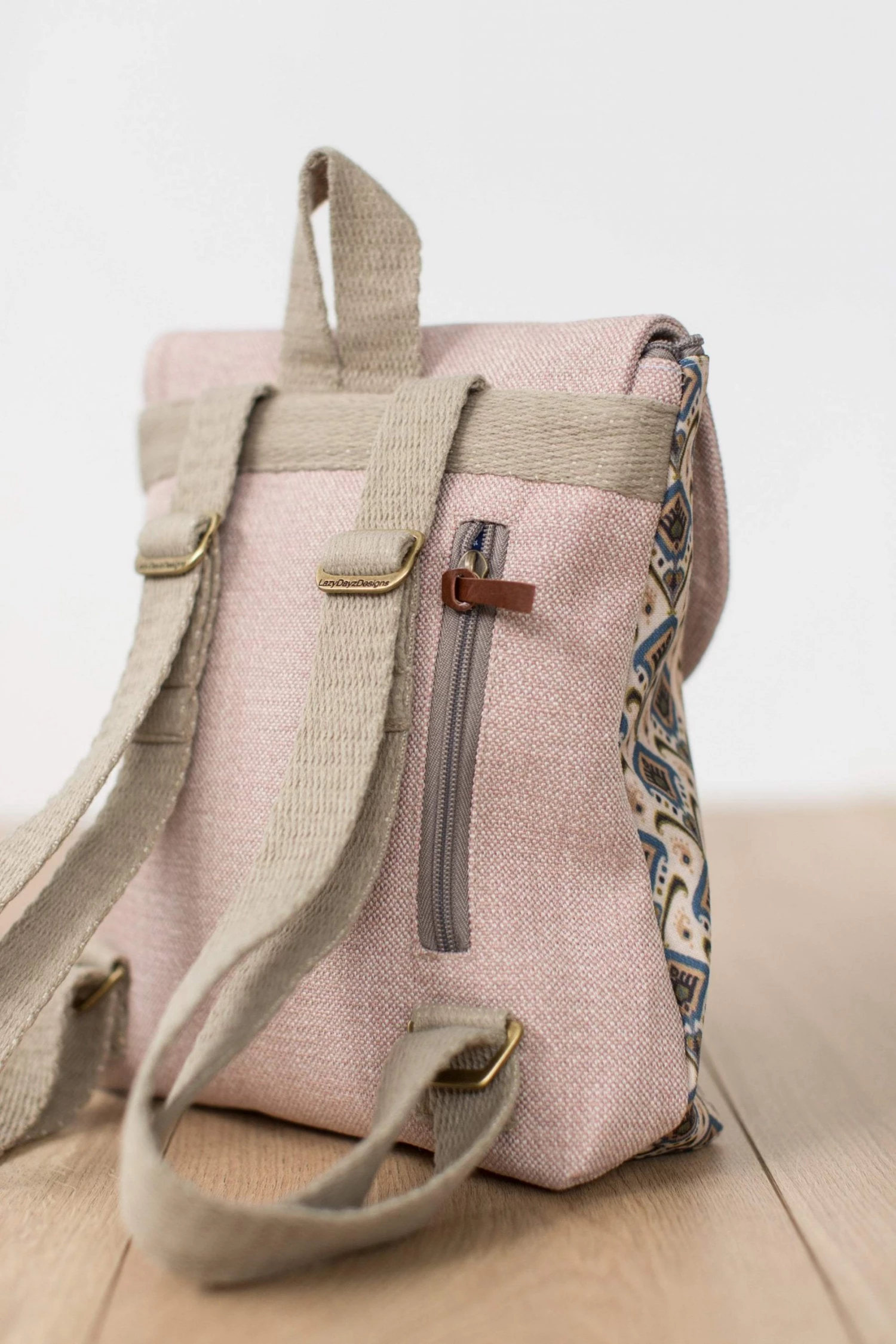 Mini backpack Cyclades in beautiful tones of cream, baby pink, beige and green patterned prints. This backpack has a suede light pink-colored cup and beautiful patterned designs on the front in a white canvas with intricate yet minimal colorful designs. You’ll absolutely adore this well-designed small backpack, it’s hidden back pocket and two inner pockets. All these combined in a waterproof material! It gives an elegant touch to any casual look and it certainly makes everybody wonder where you got it from!