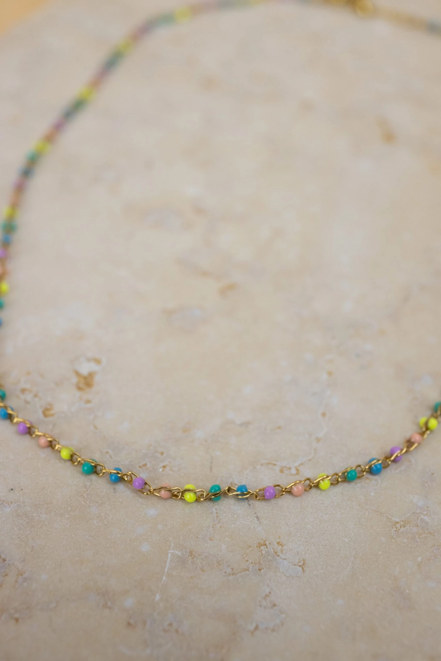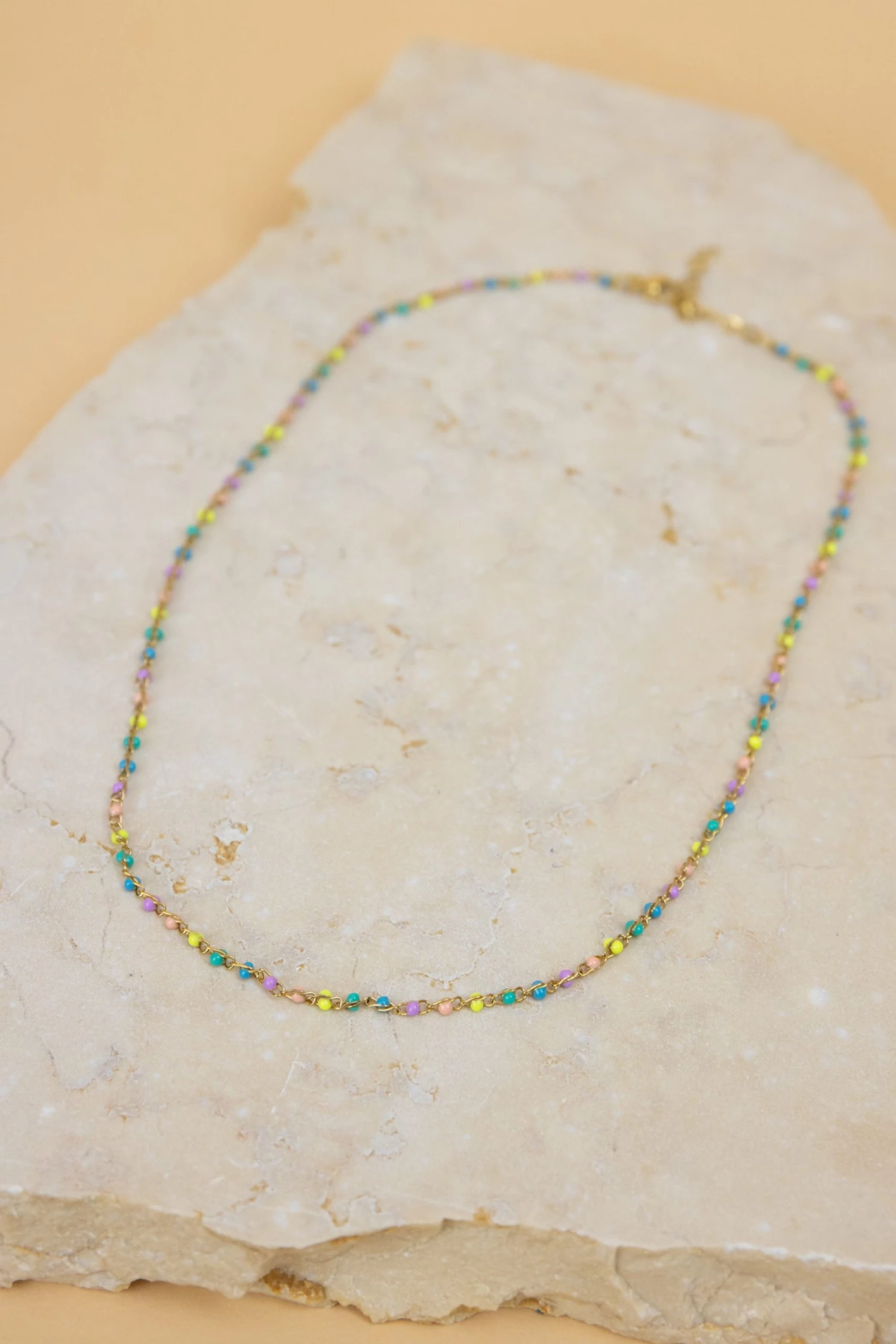 A very elegant spring necklace! A short gold plated chain decorated with beautiful colourful beads!Wear it with any outfit and give a little sparkle to your day!Â