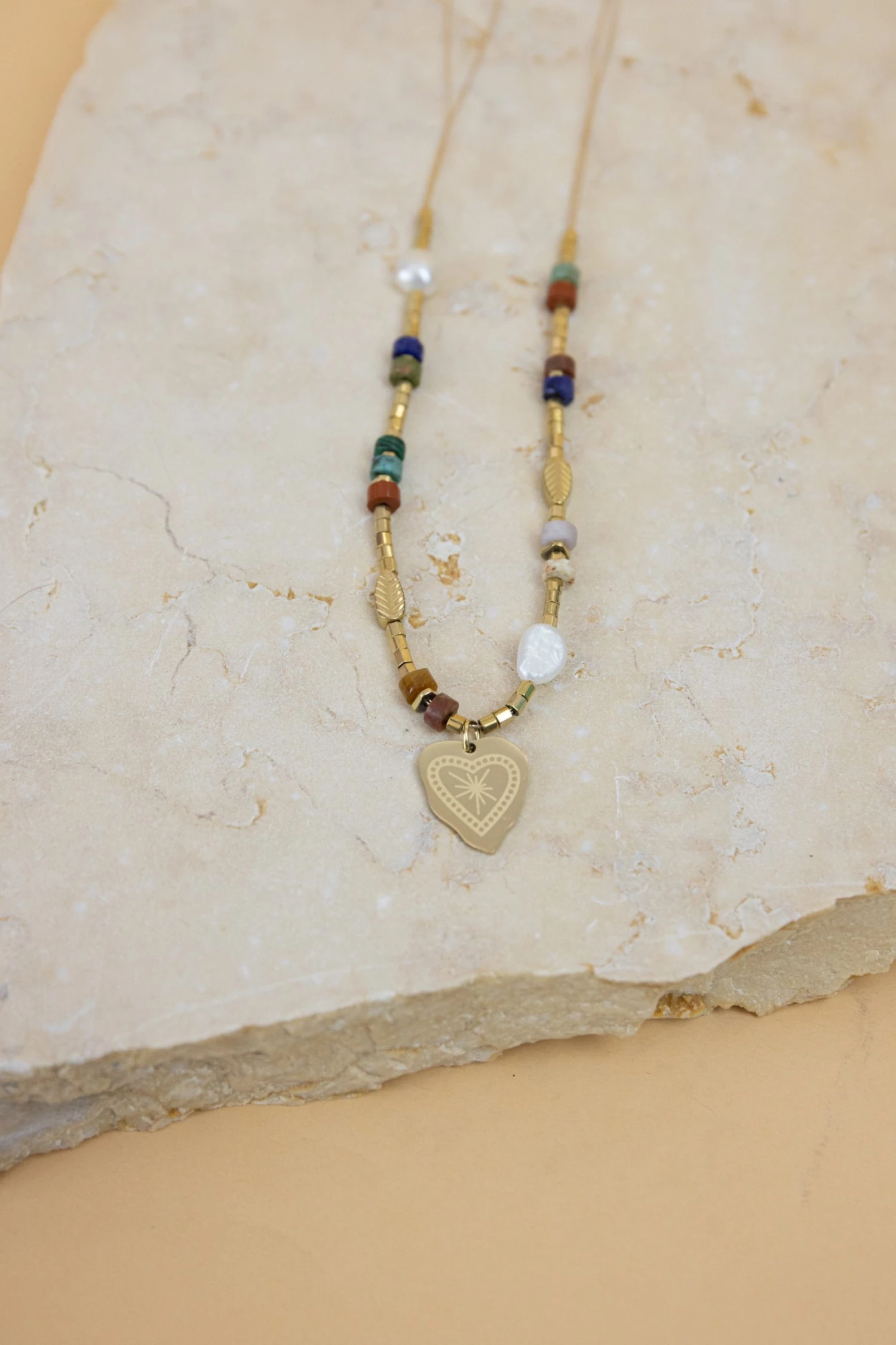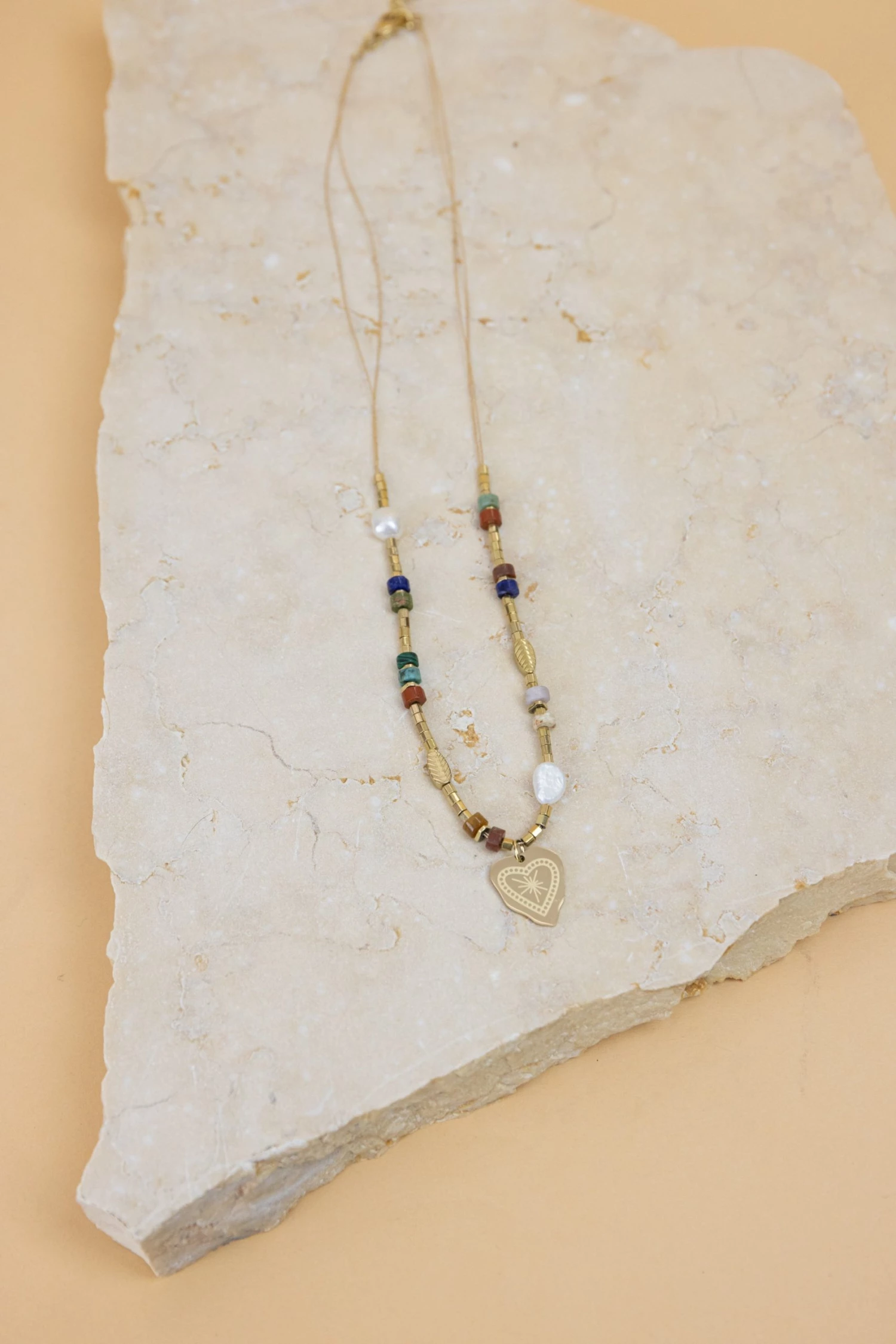 A very elegant spring necklace! A short gold plated chain decorated with beautiful colourful beads and a heart shape charm!Wear it with any outfit and give a little sparkle to your day!Â