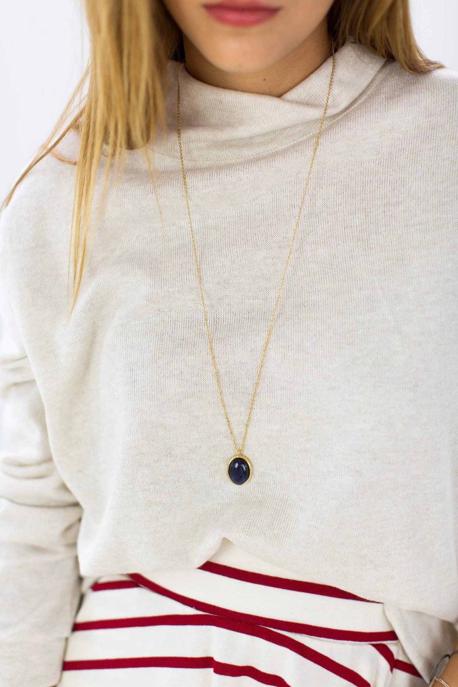 A very elegant and boho necklace! A long gold chain decorated with a beautiful lapis lazuli semi-precious stone! Its dark blue colour matches beautifully with the gold colour that surrounds it! Wear it with any outfit and give a little sparkle to your day!Â