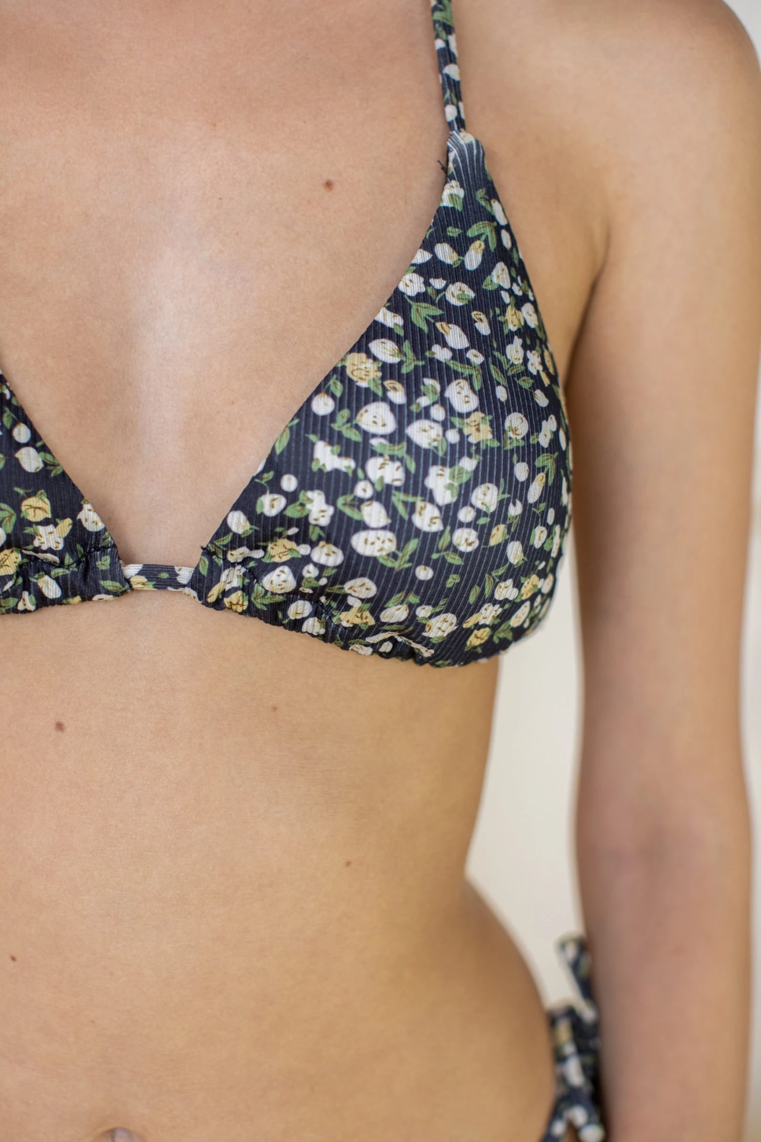 Rosie Ann is a floral triangle bikini top, rib texture fabric, in black color with white and beige roses. It has straps around neck and back, so you can tie it in different ways. Wear it with the matching bottom or try mix it up with other colours.