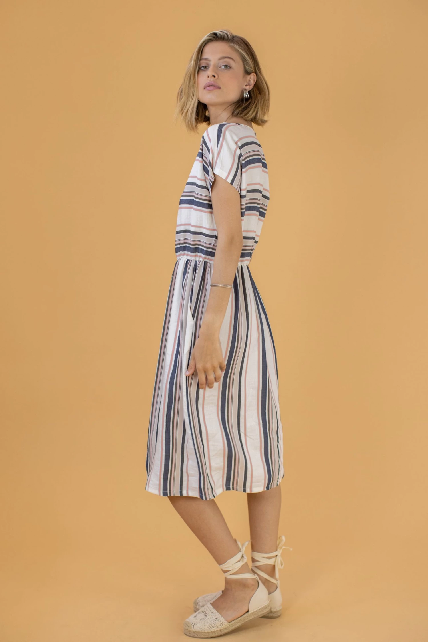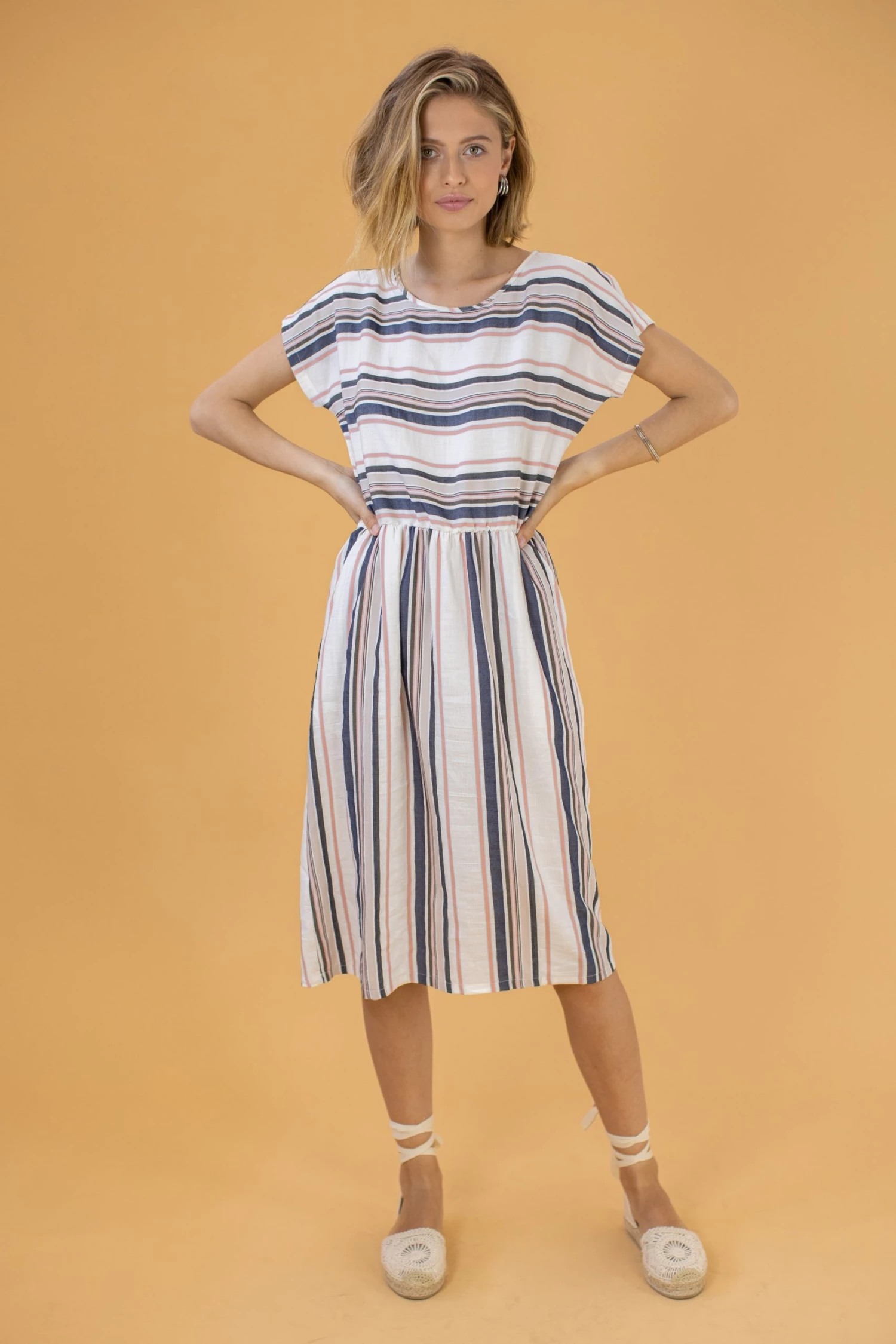 - Cream, beige, pink, blue, grey and light blue stripes