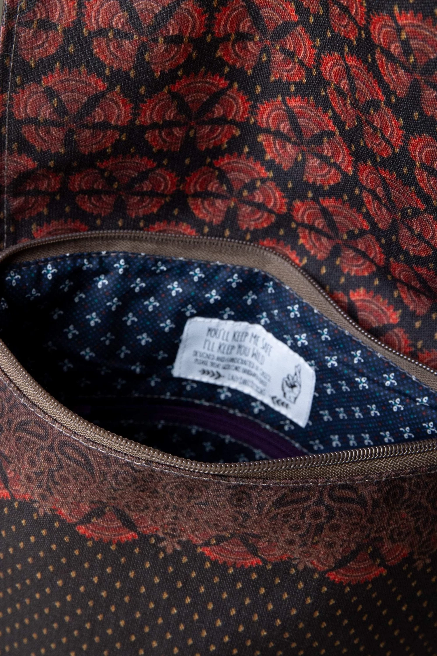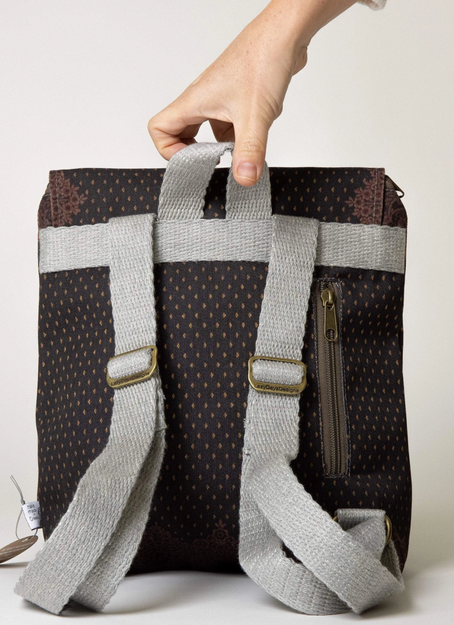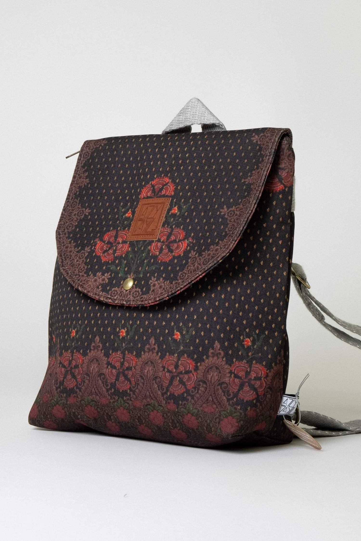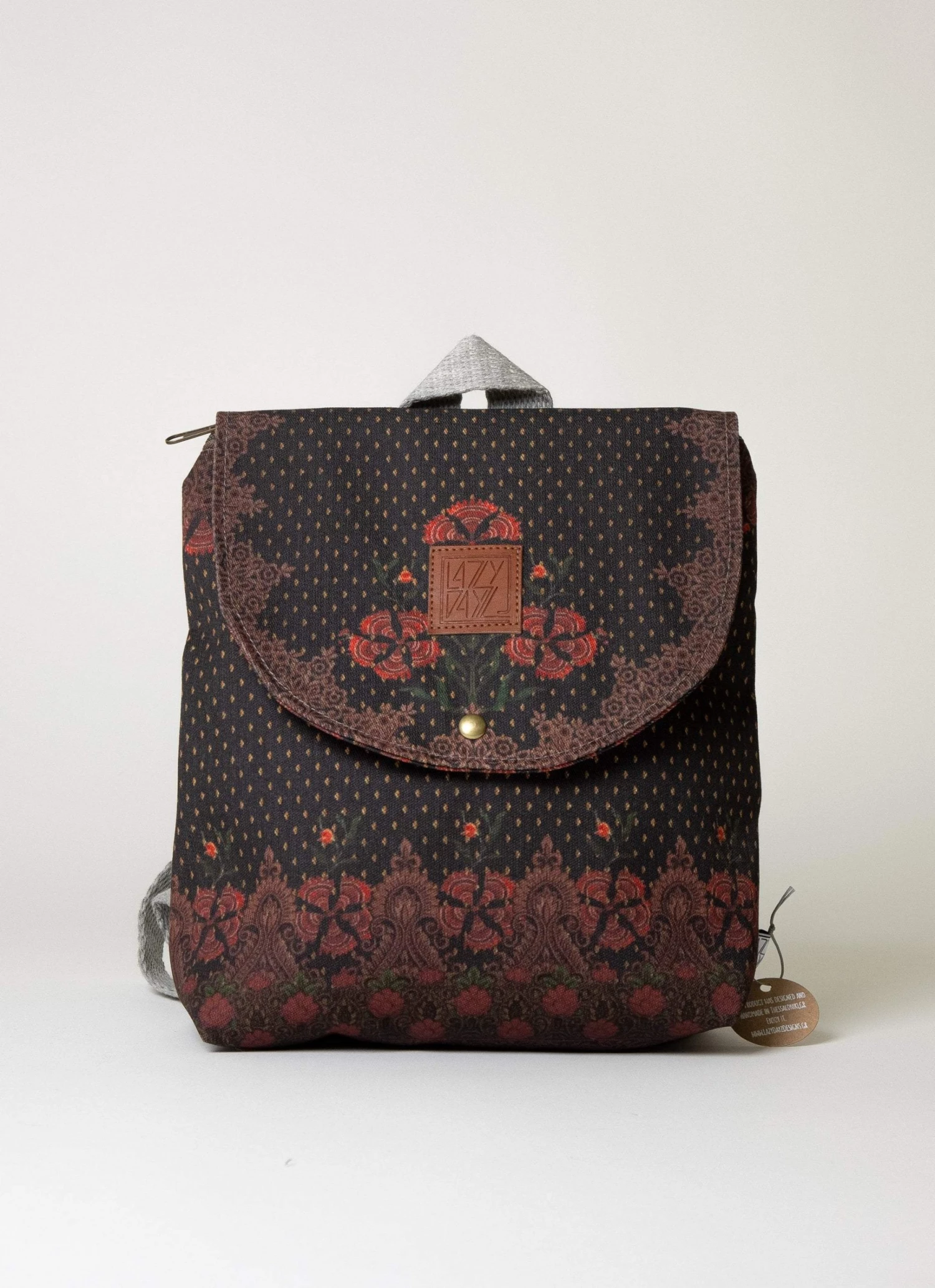 Mini backpack Cyclades in beautiful tones of black, warm red and green patterned prints. You’ll absolutely adore this well-designed small backpack, it’s hidden back pocket and two inner pockets. All these combined in a waterproof material! It gives an elegant touch to any casual look and it certainly makes everybody wonder where you got it from!