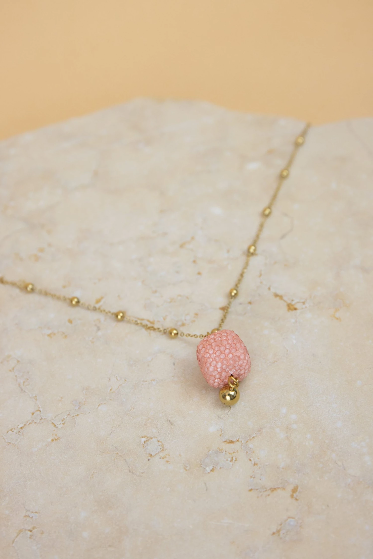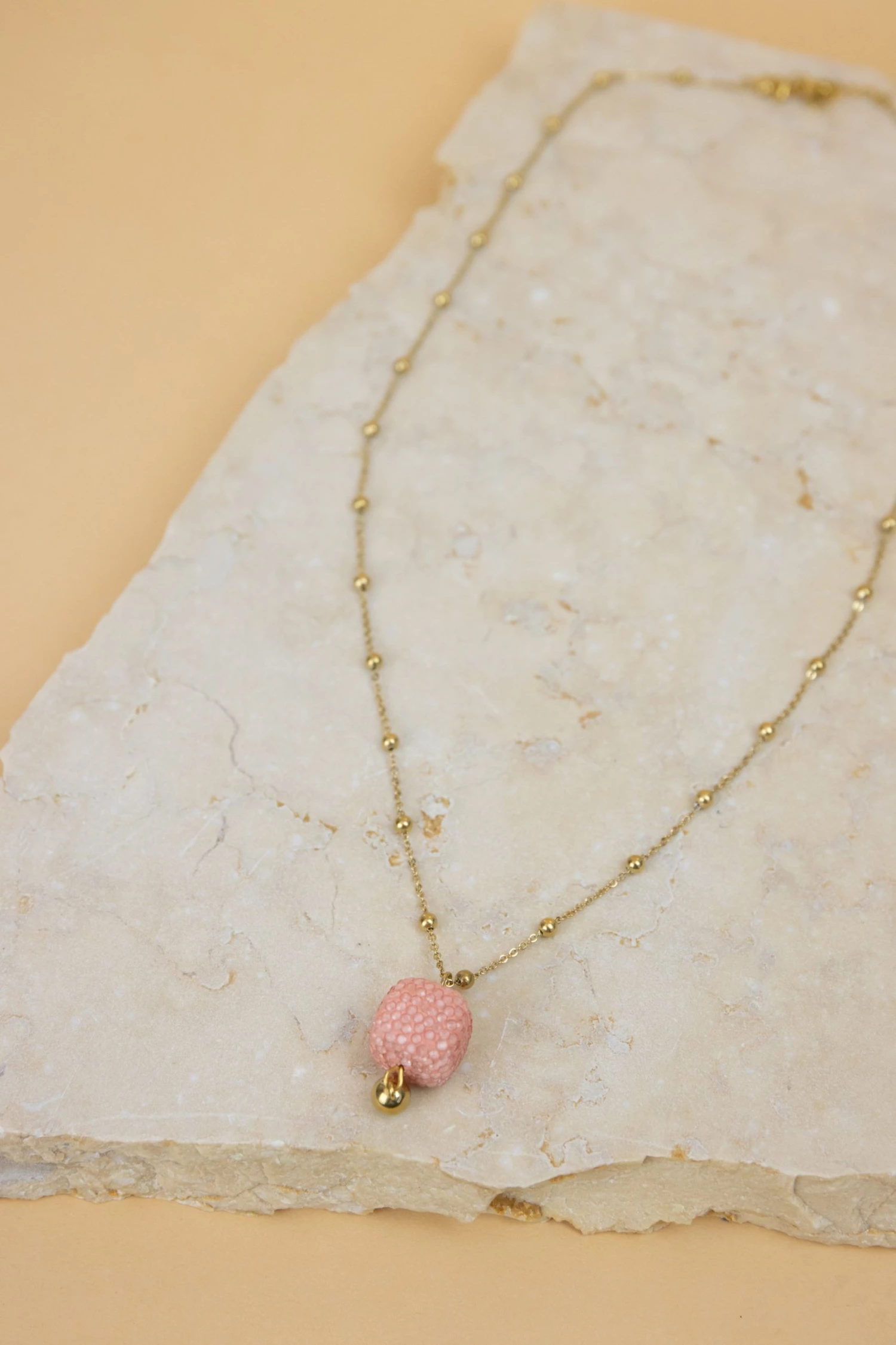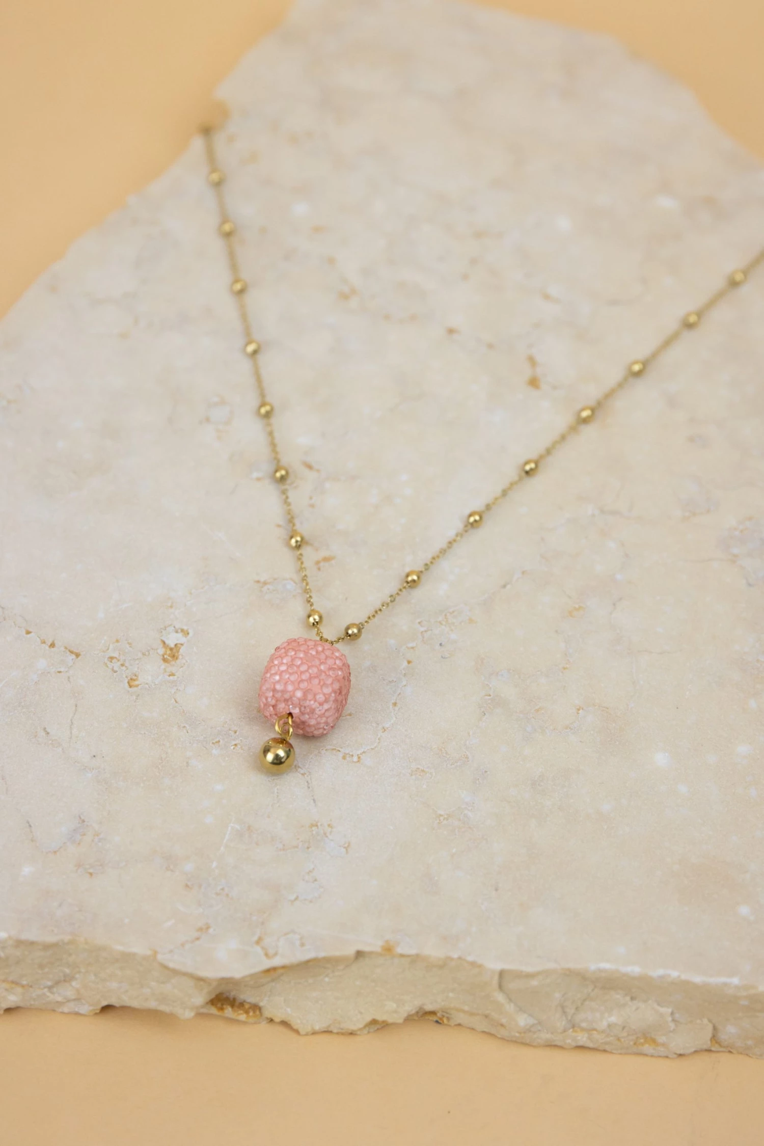 A very cute and summery necklace! A long gold chain decorated with a beautiful semi-precious stone! Its pink colour matches beautifully with the golden necklace! Wear it with any outfit and give a little sparkle to your day!