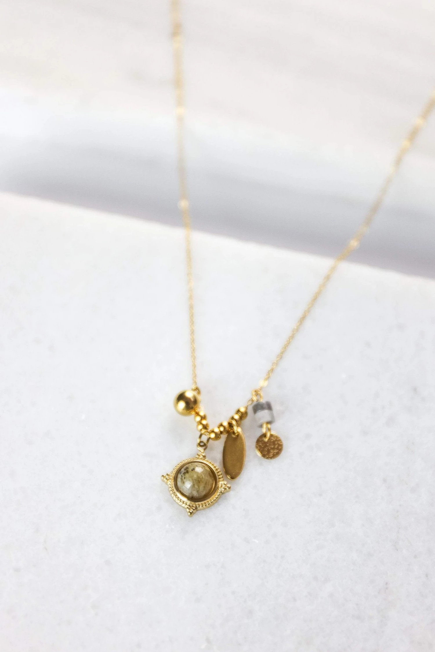 A very elegant and boho necklace! A long gold chain decorated with a beautiful grey stone and cute little gold details!Wear it with any outfit and give a little sparkle to your day!Â