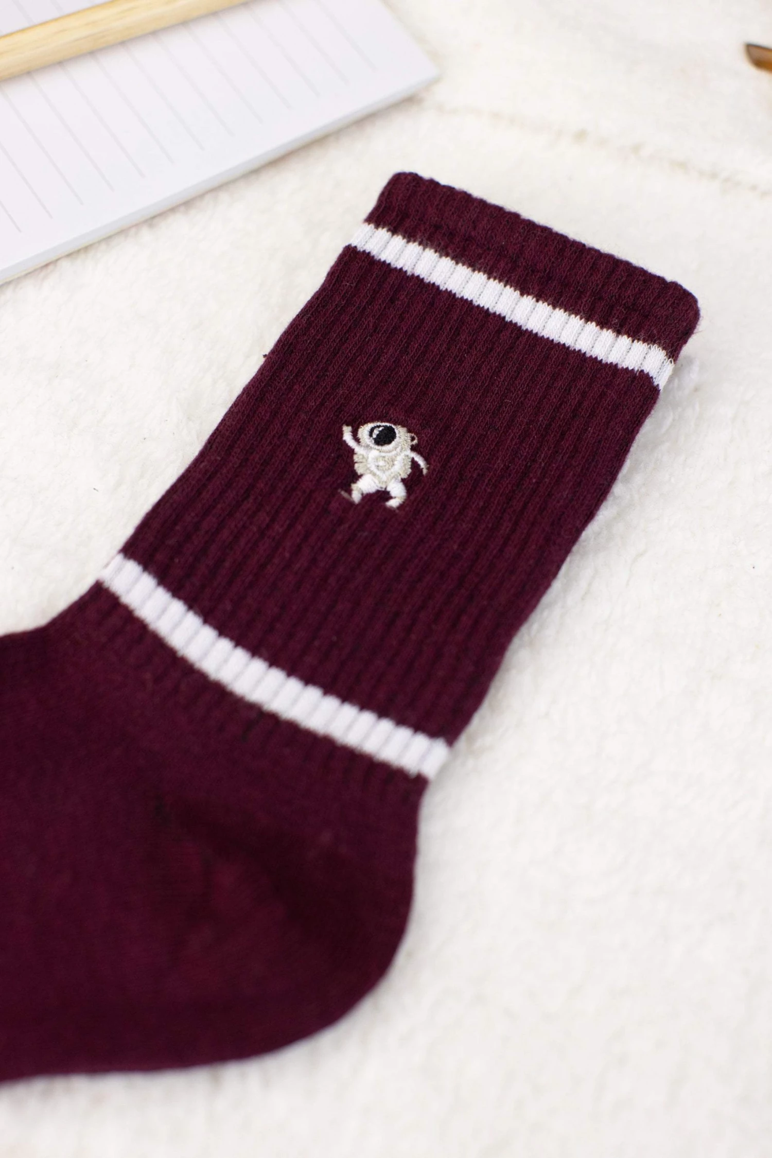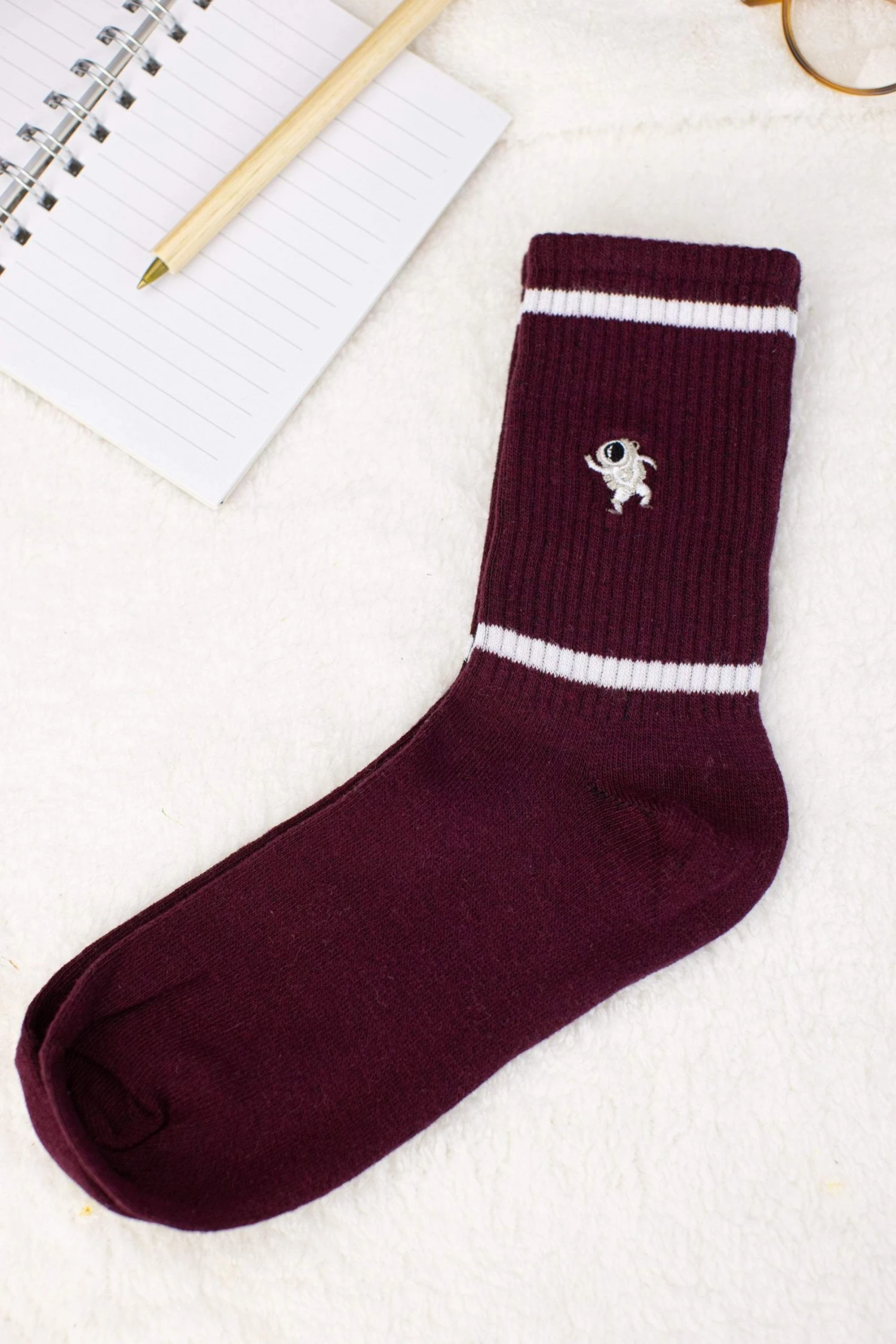 Impress with your old school, high rise socks in burgundy with a cute astronaut patch! Crafted from a cotton fabric.