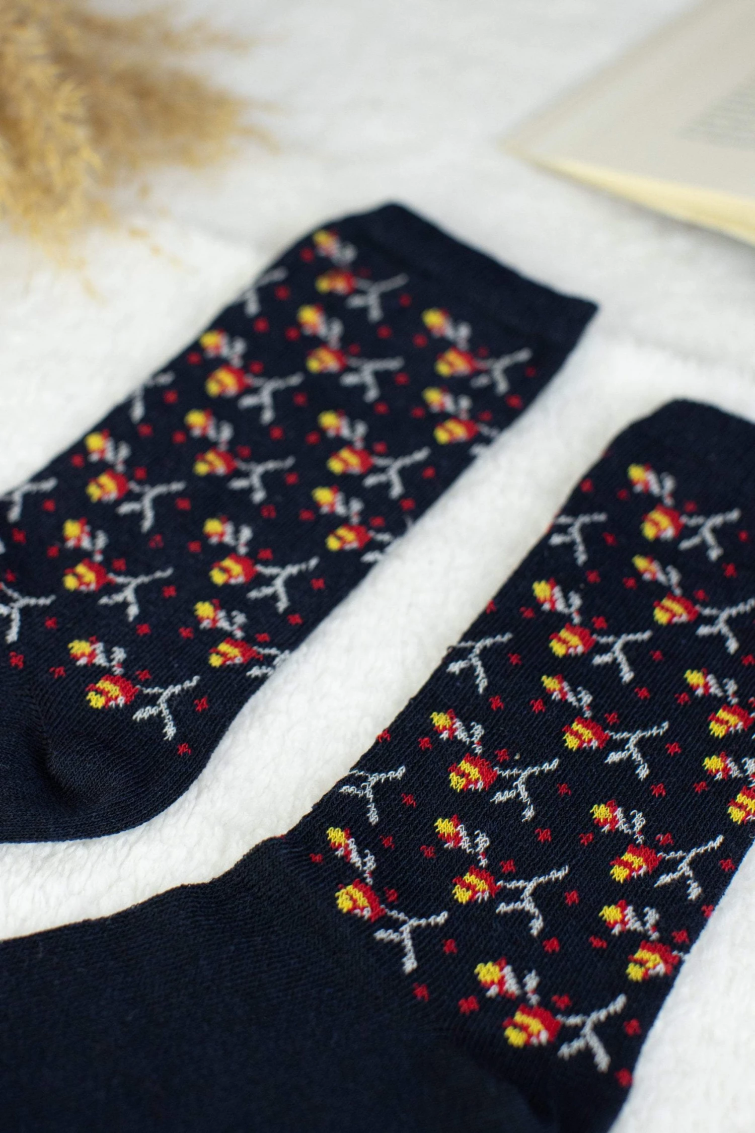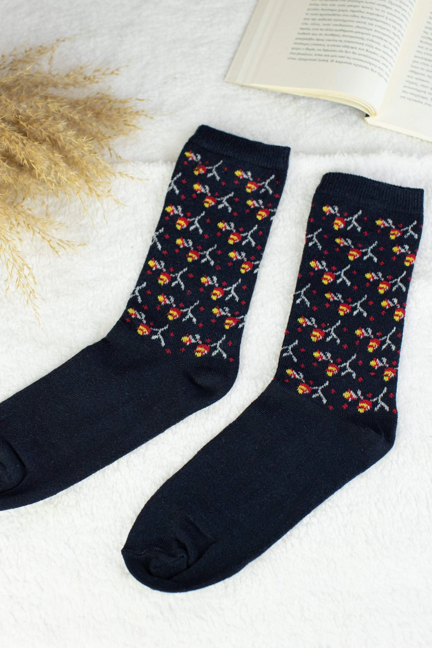 All time classic! Crafted from a dark blue colored fabric with cute little red roses, these socks can rock any look! Wear with rolled up jeans and an oversized sweater! Cozy and romantic!