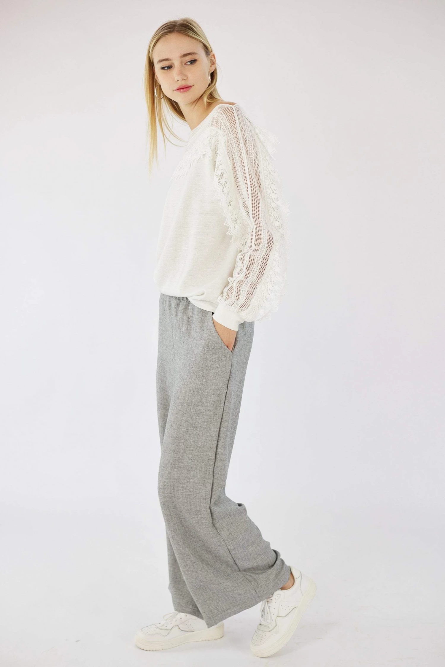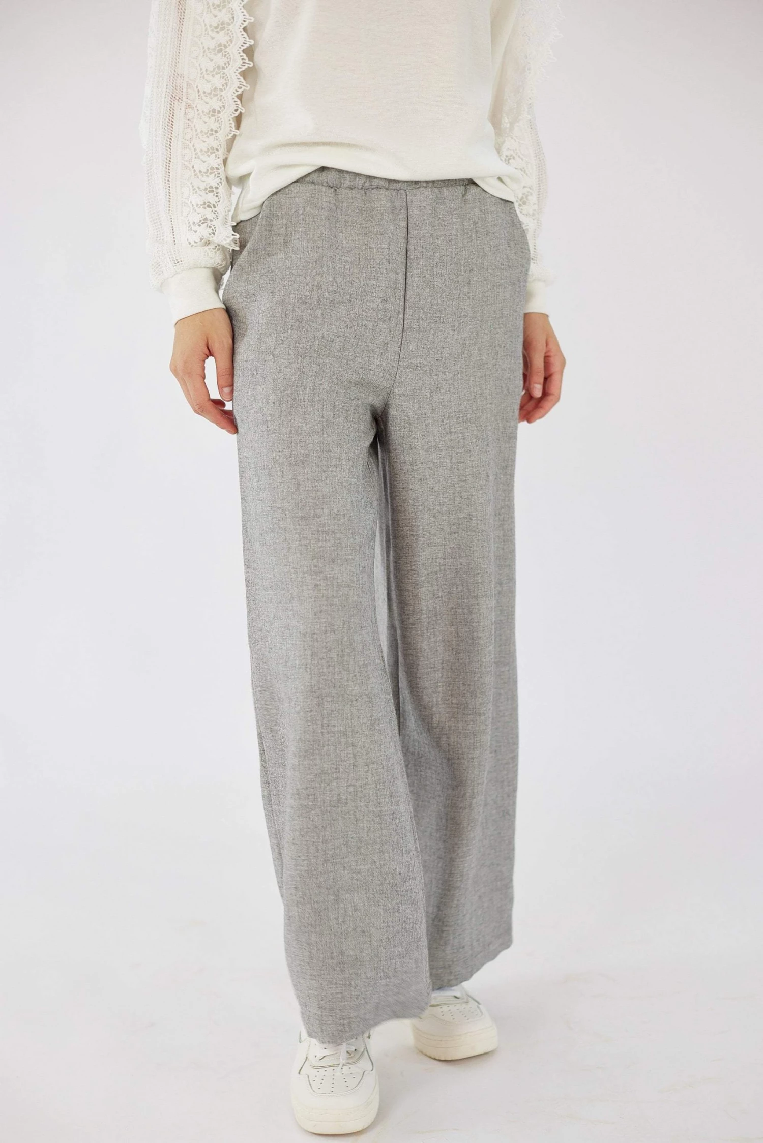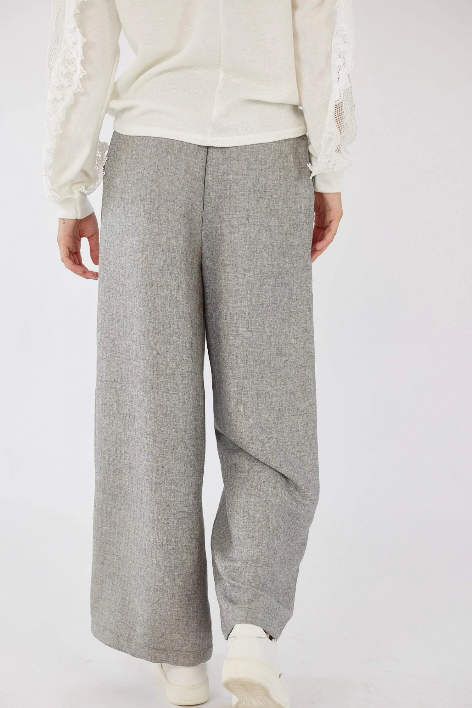 Pants Kos in light grey! Absolutely chic and elegant they feature an elastic high waist and practical side pockets. The wide cuts make them airy and extremely comfortable. Combine it with white sneakers for an urban look or with sandals for a casual look (;