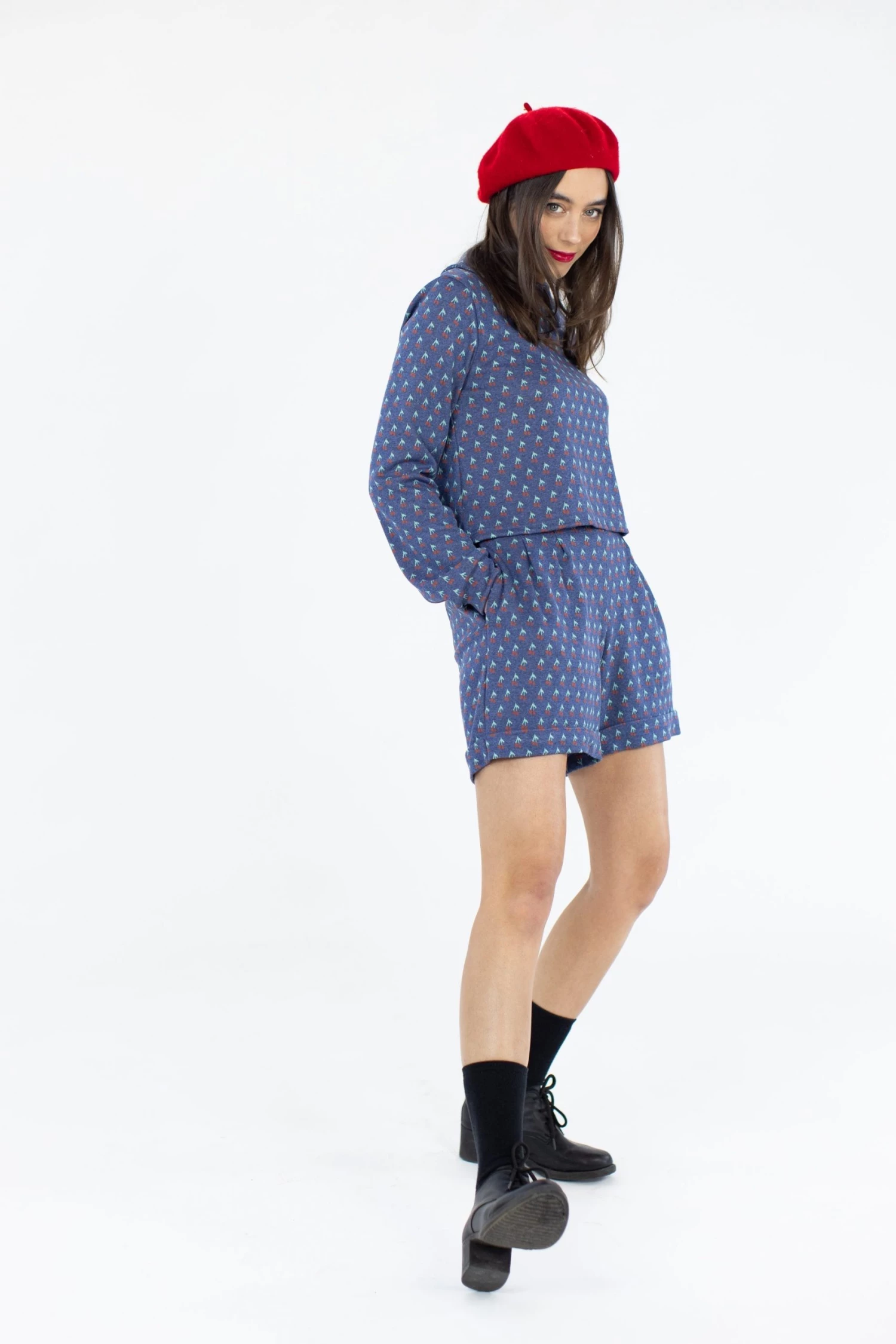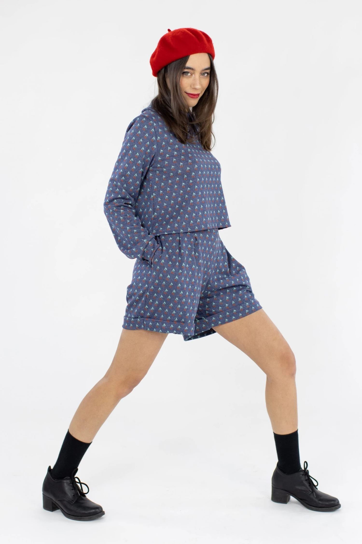 Gorgeous shorts with cherry pattern all over on a blue canvas.