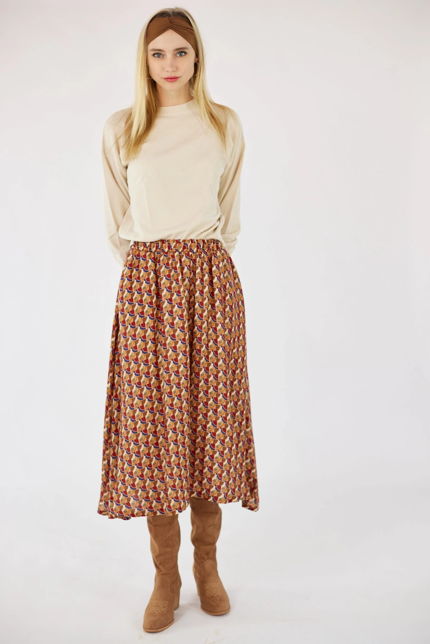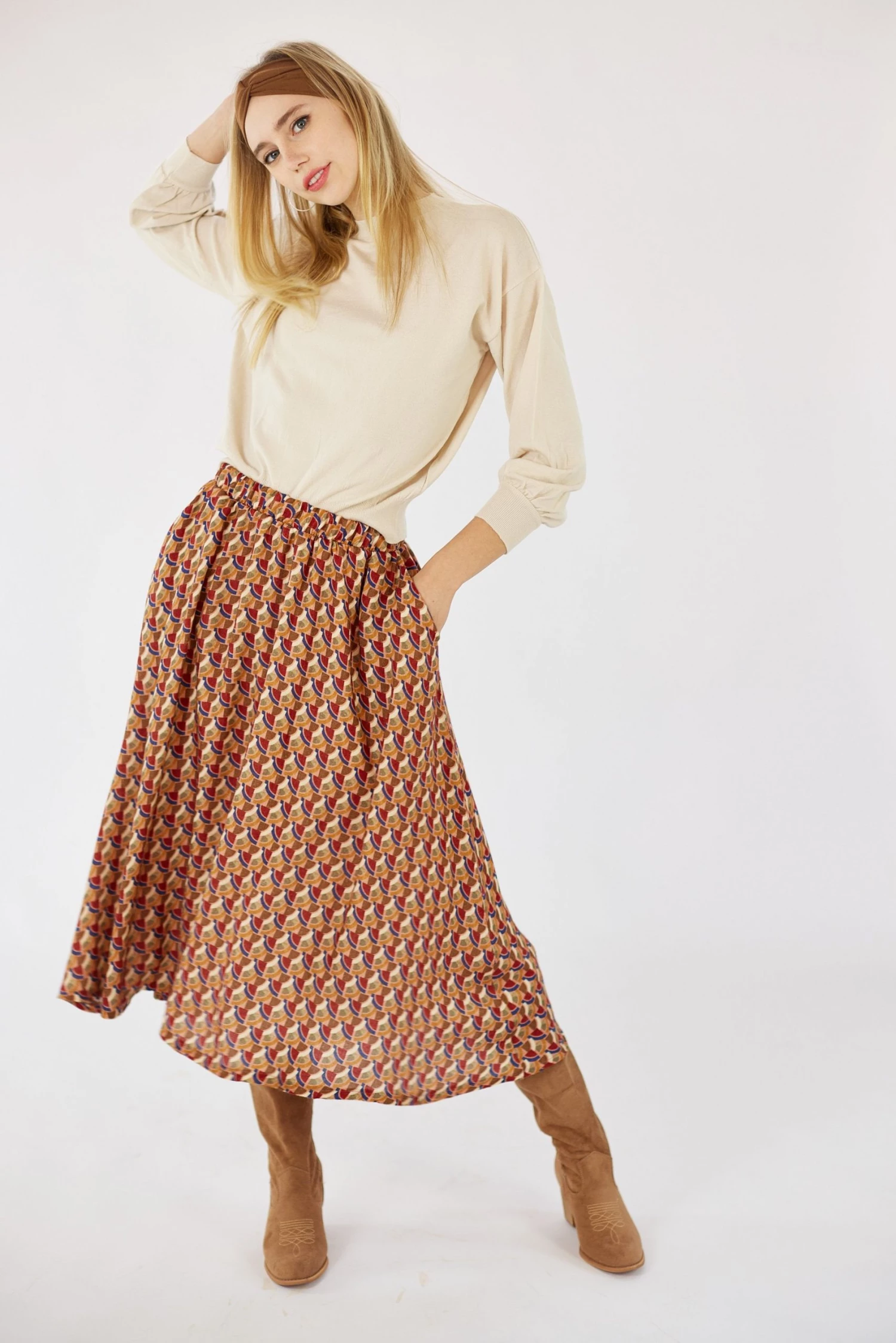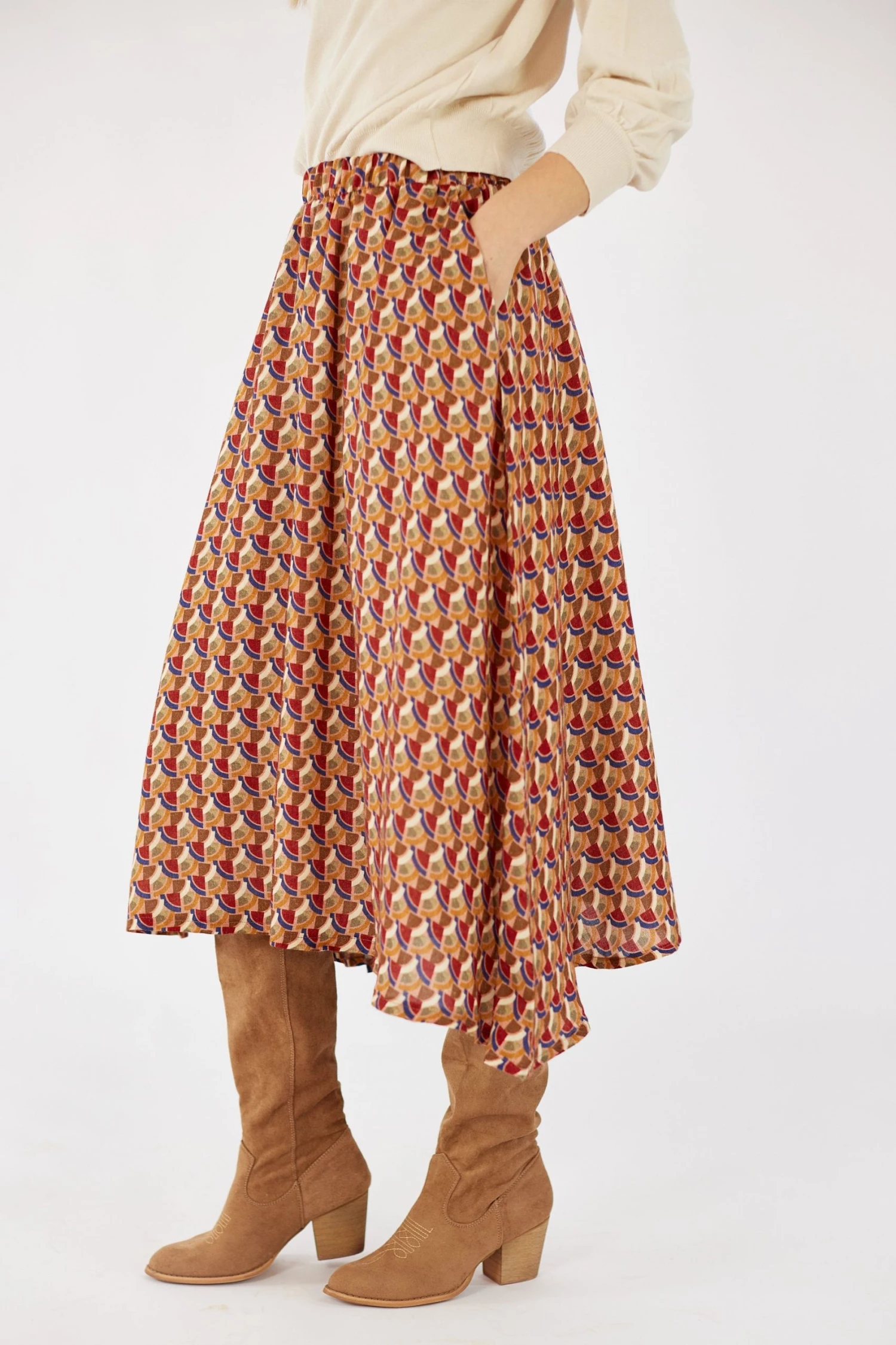 Flared midi skirt Serena with a boho geometric pattern in the colors orange, blue, red, brown and cream. This skirt is amazing and has a white underskirt! Elegant with a romantic touch and oh so cool with a crop top. The practical side pockets and the elastic waistband, make it soooo comfortable!