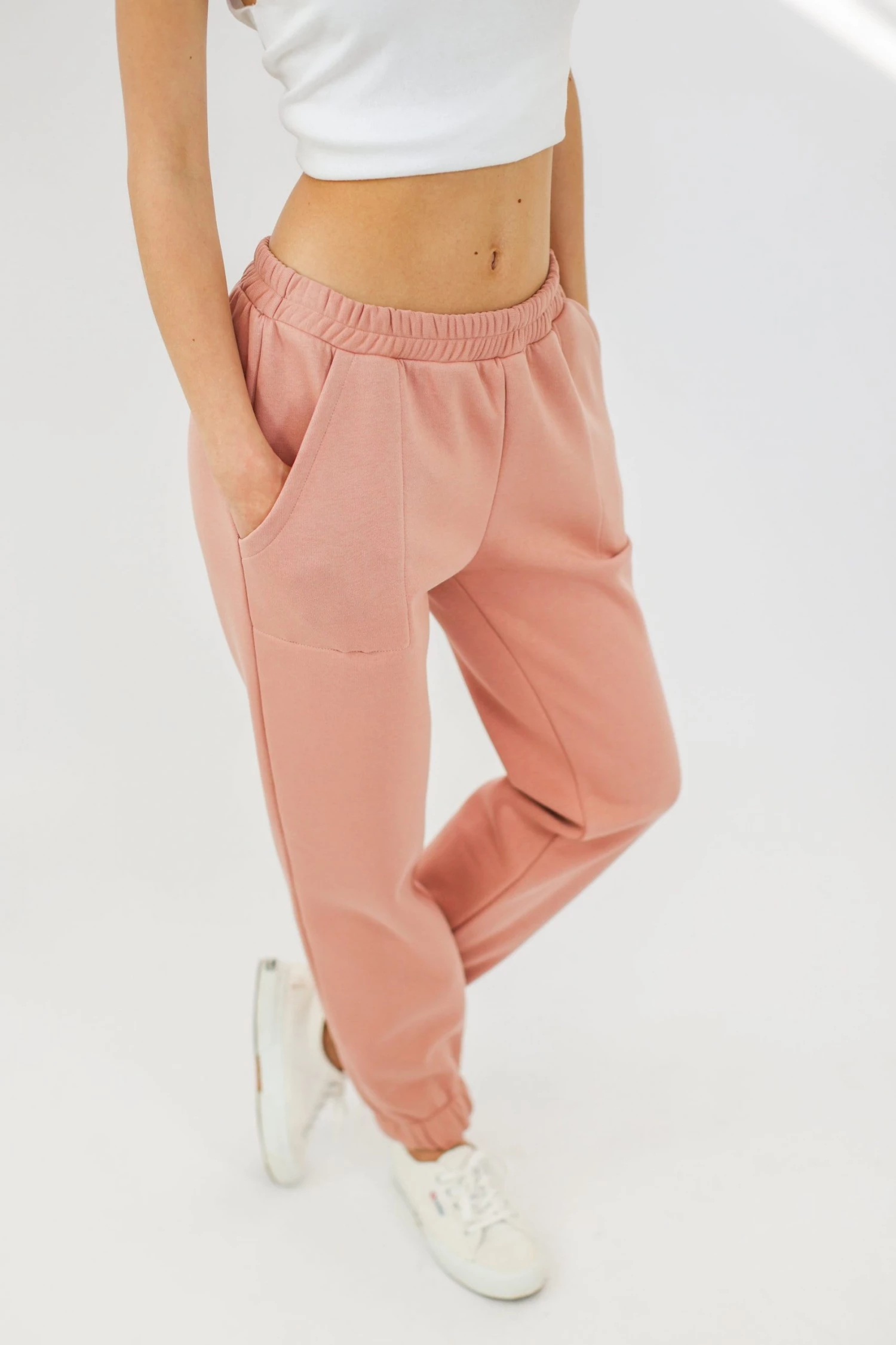 High- waisted joggers ‘Mamy’ in baby pink. Elasticated drawstring waist, side pockets, slim, tapered fit. A standard cut around the thigh with a narrow shape through the leg. Extremely comfortable, with side pockets and elasticated hems. Soft to touch, this one is a dreamlike item!