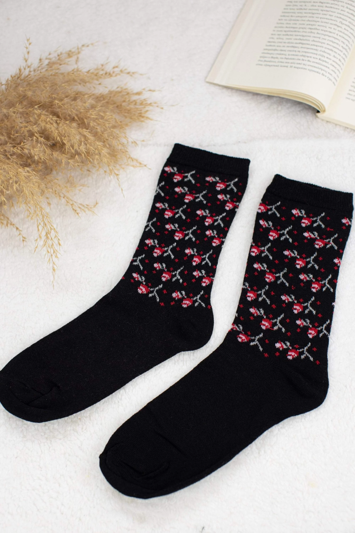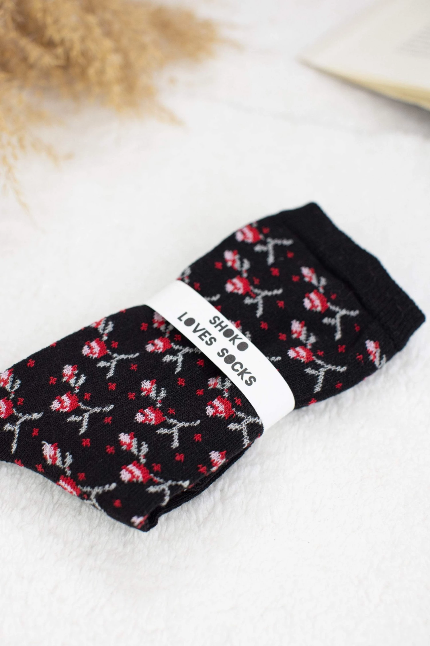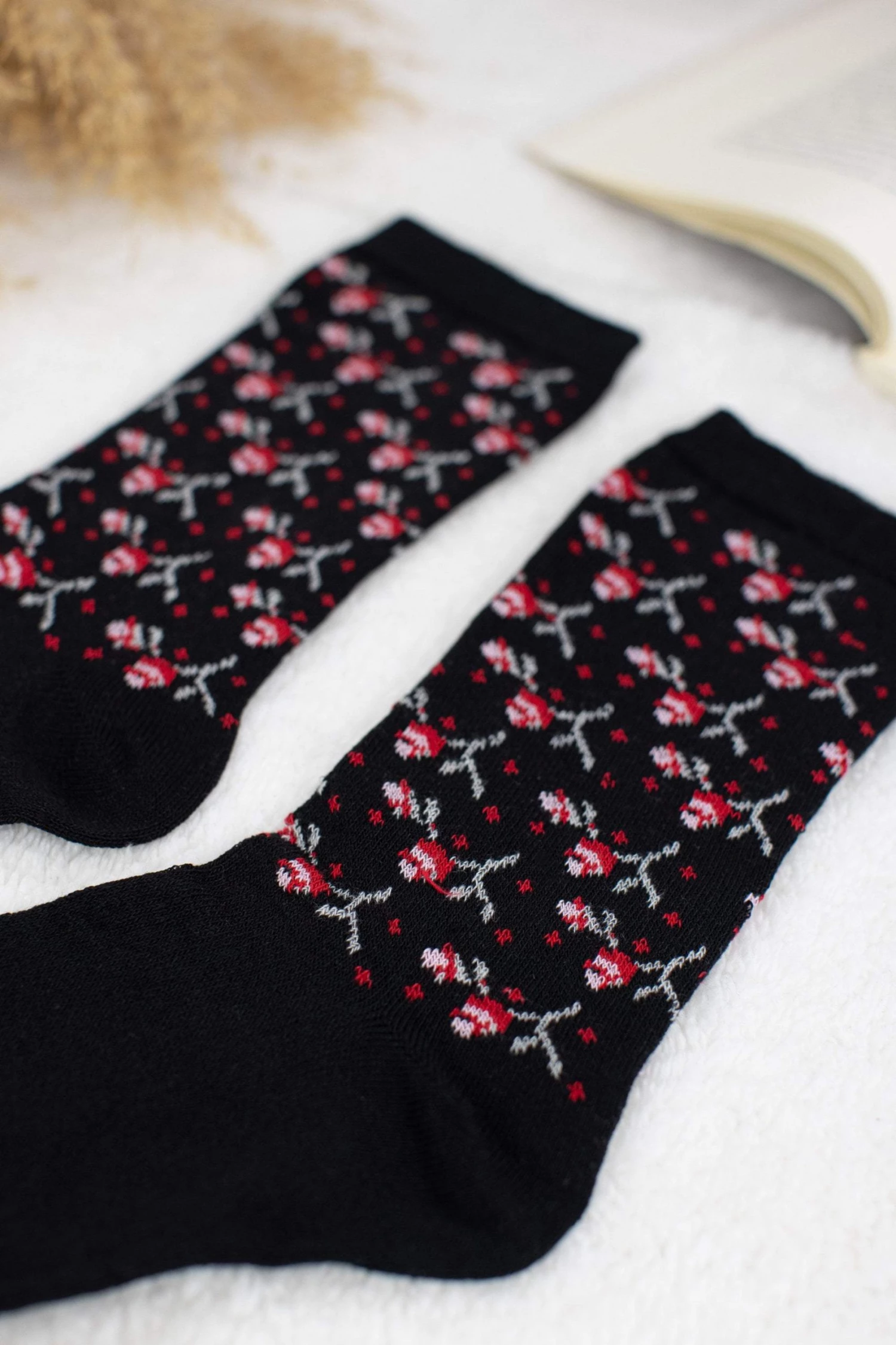 All time classic! Crafted from a black fabric with cute little red roses, these socks can rock any look! Wear with rolled up jeans and an oversized sweater! Cozy and romantic!