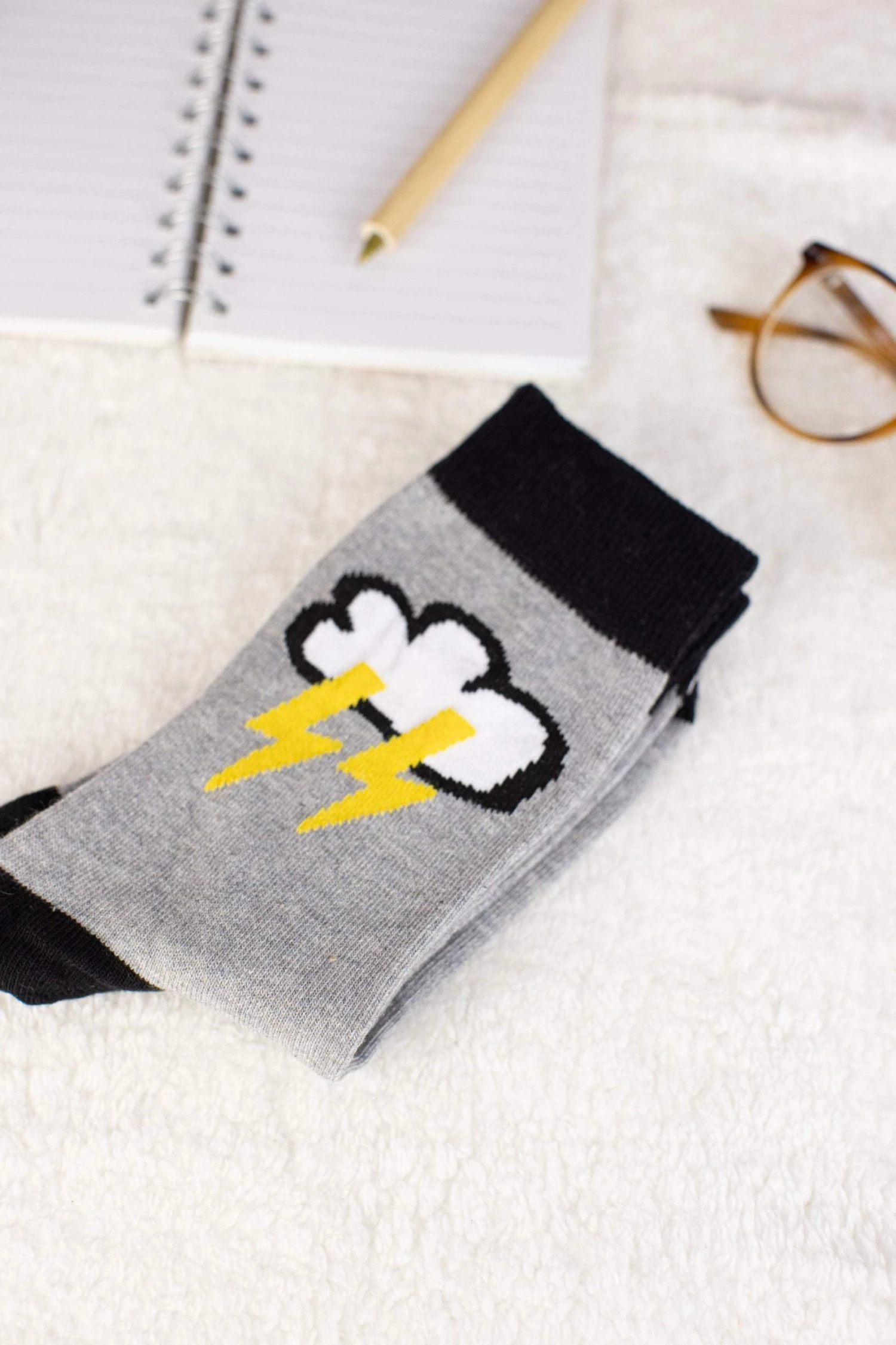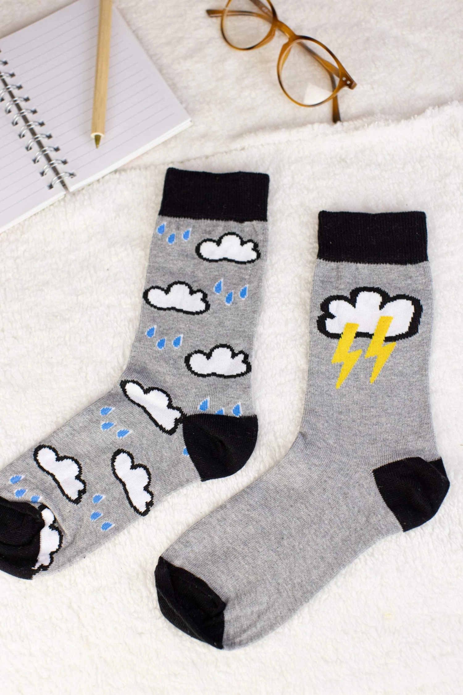 Socks “Thunderstorm” in grey color! A unique pair of socks because each sock has its own design! They’ll keep you warm yet stylish! Extra fun and cute, you can wear them with high waisted mom jeans and rolled up hems!Â