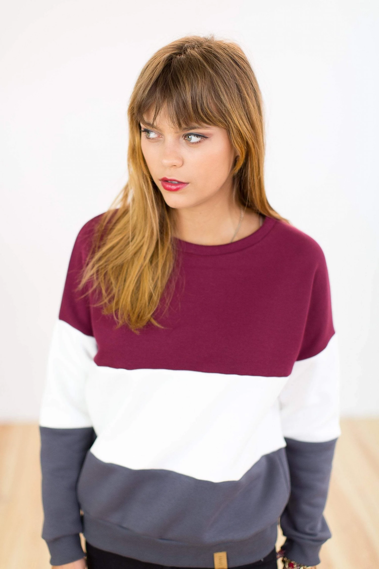 Our favourite Top Mia is now a sweater! Crafted from an old-school colour-blocking design. Dark red at the top, following a cozy cream coloured fabric in the middle and finishing with a beautiful grey fabric. A statement sweater, for a fun and cool outfit. Wear with a simple pair of denim and your fave sneakers!Â