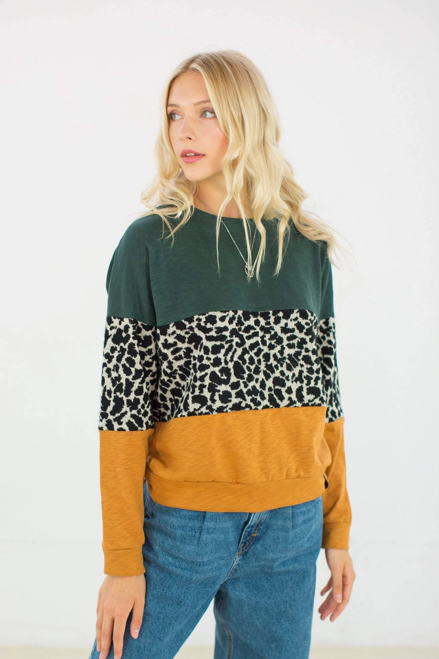The favourite ‘Mia’ Sweater in green, animal print and ocre colours. Crafted from an old-school colour-blocking design. Characteristic is the colour block striped design on the sleeves as well. A statement sweater, for a fun and cool outfit. Wear with a simple pair of denim and your fave sneakers!Â