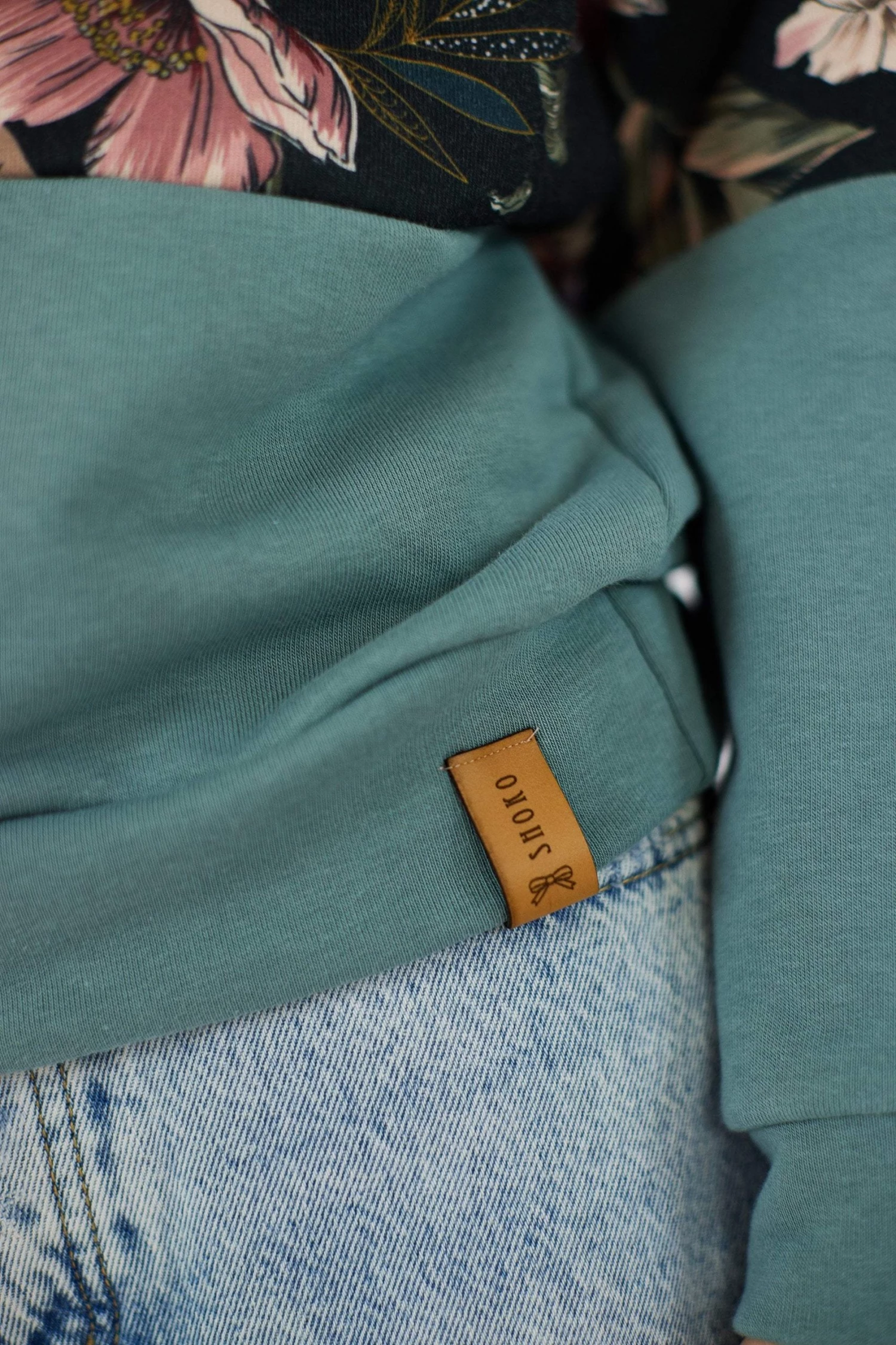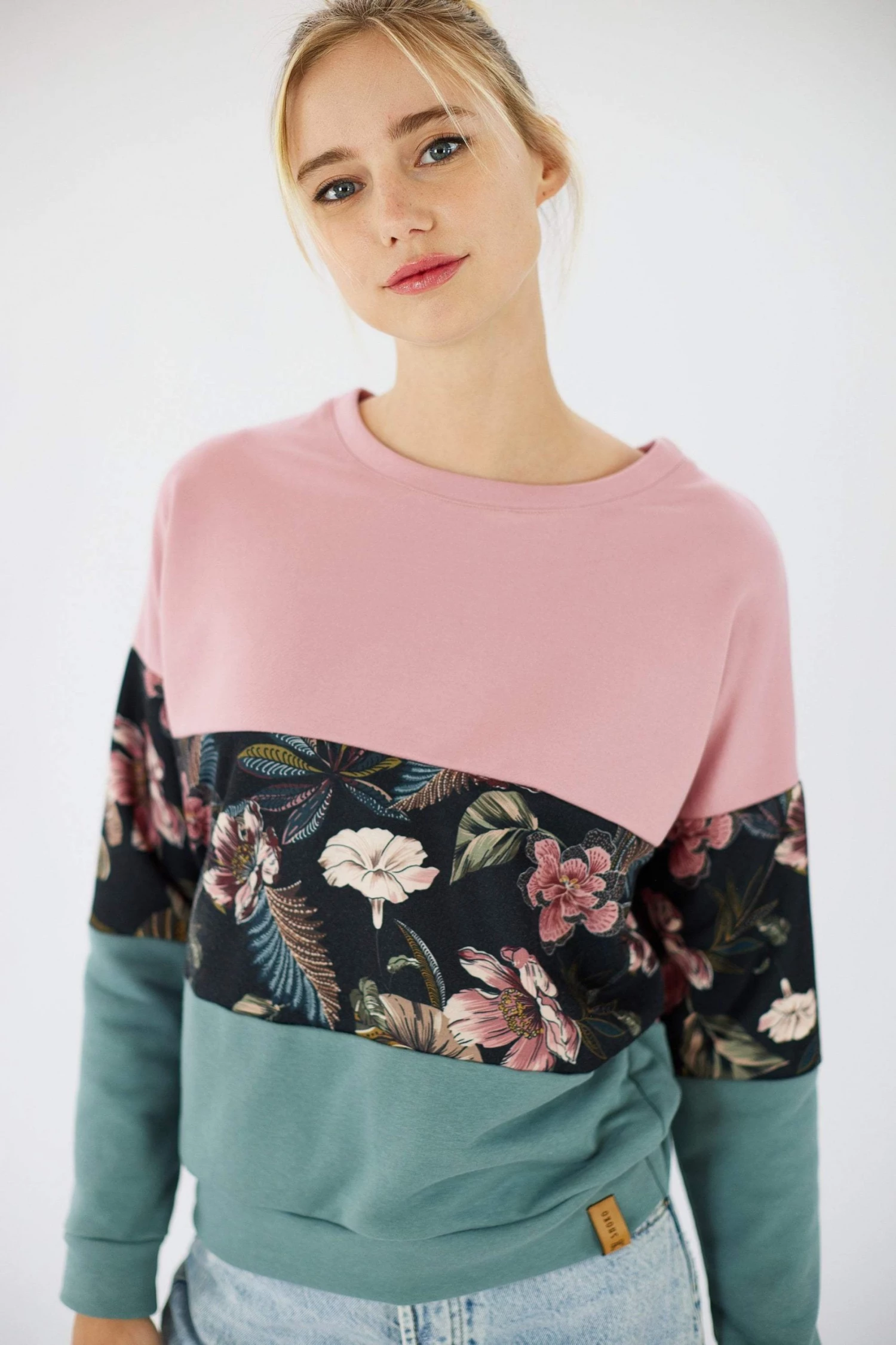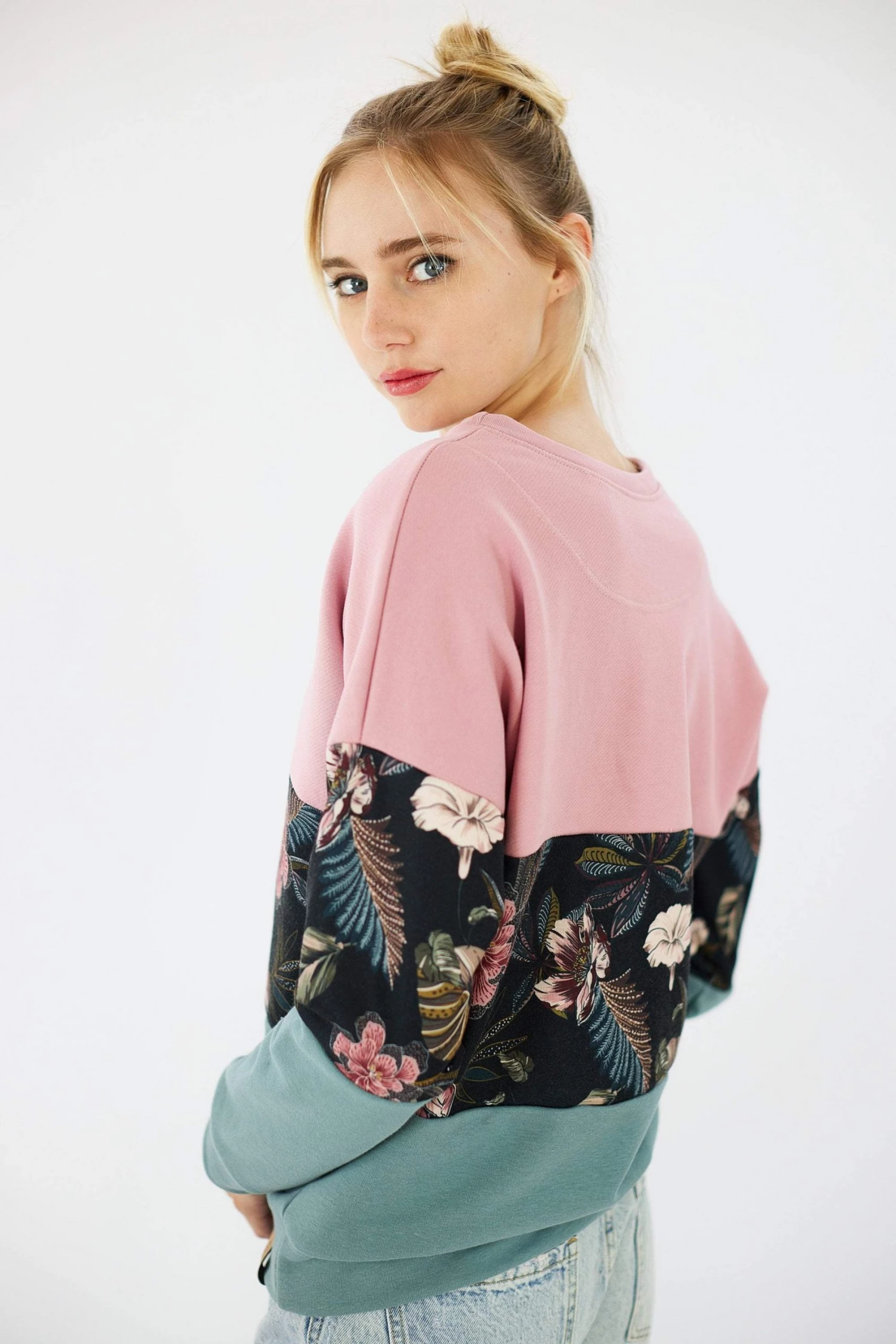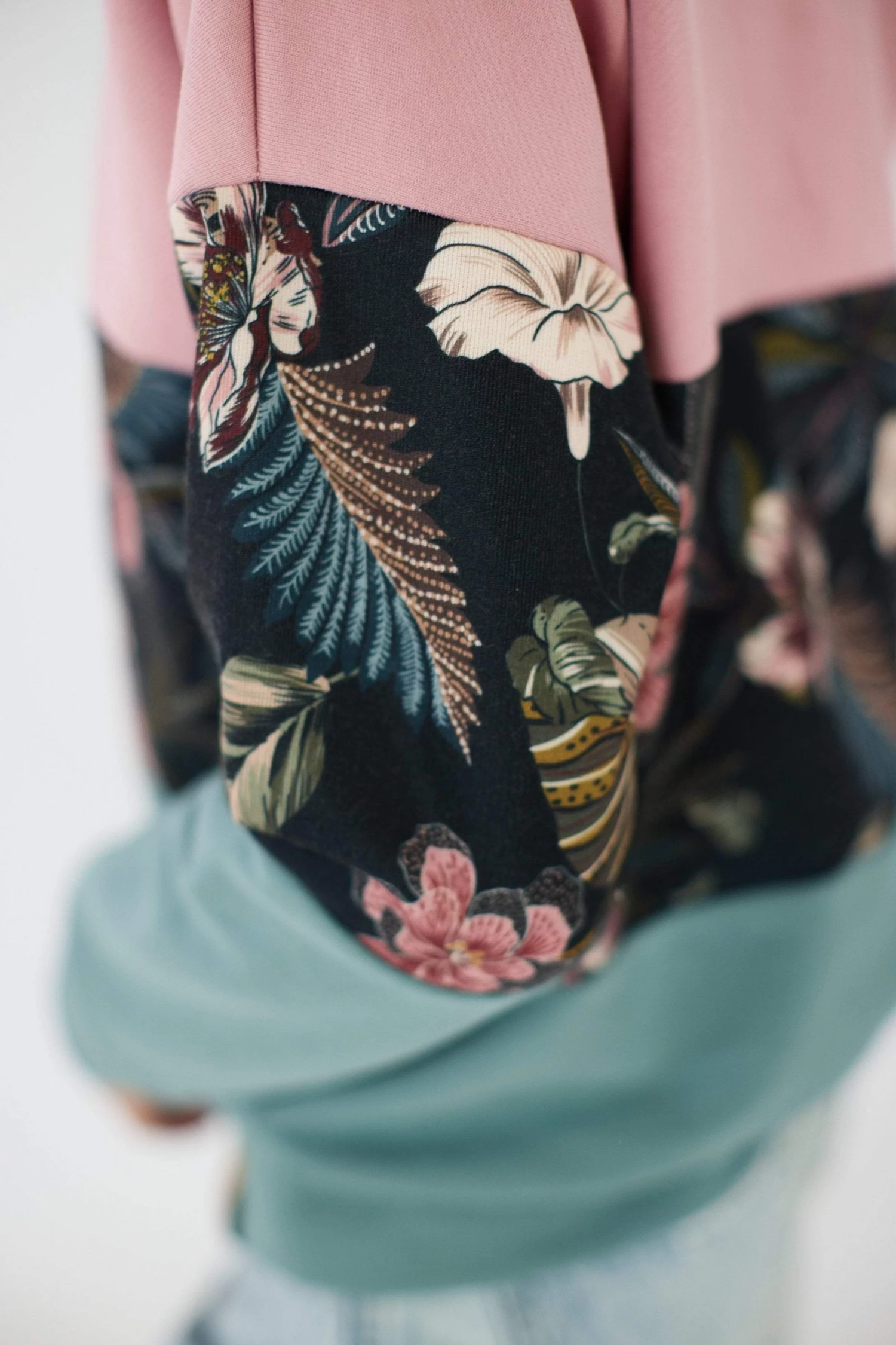 Our beloved sweater Mia is back! Crafted from the signature color block, the top is baby pink followed by a floral orchid print block and an astonishing mint block at the bottom. A statement sweater, for a fun and cool outfit. Wear it with your denims and your fave sneakers! A piece that shouts ‘autumn is here’!