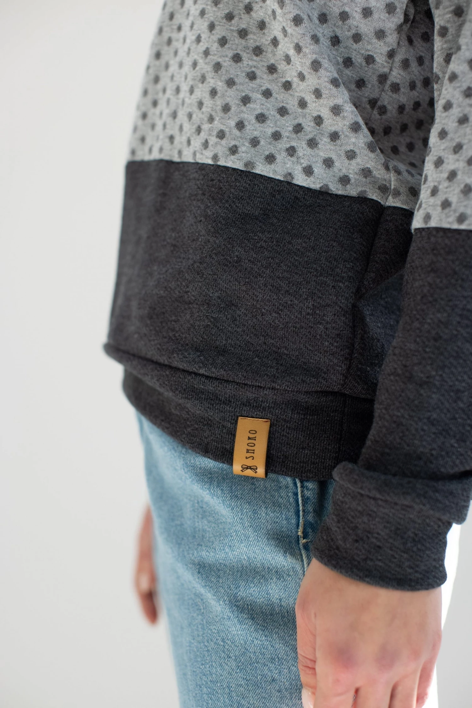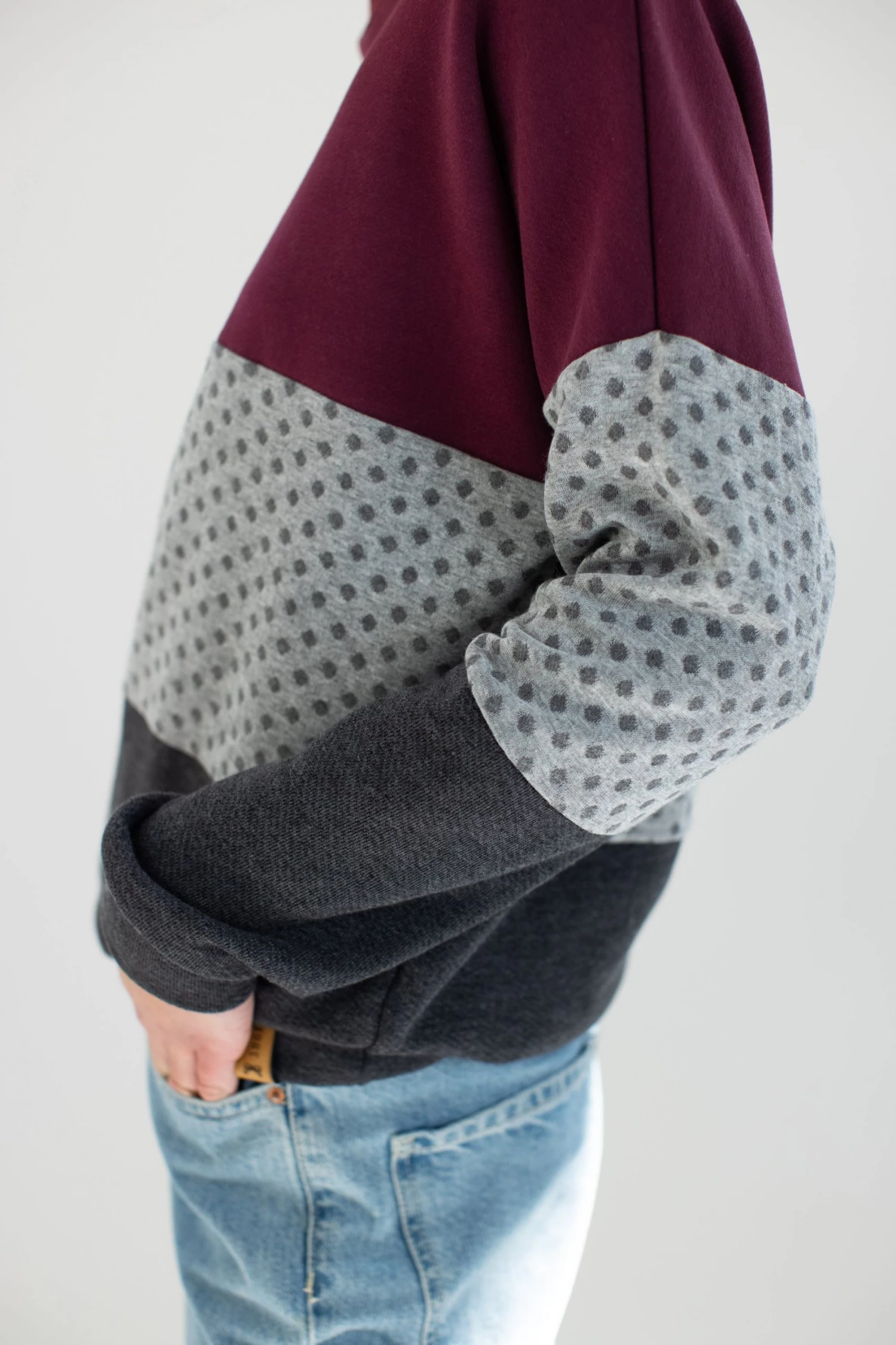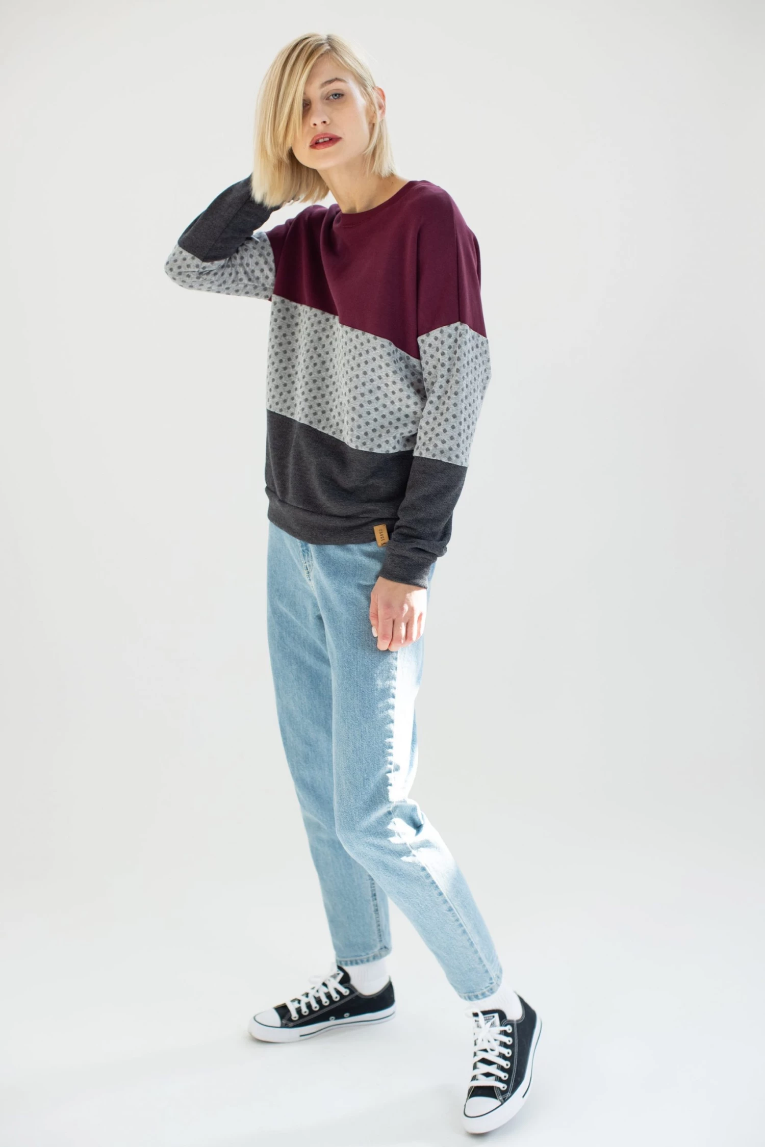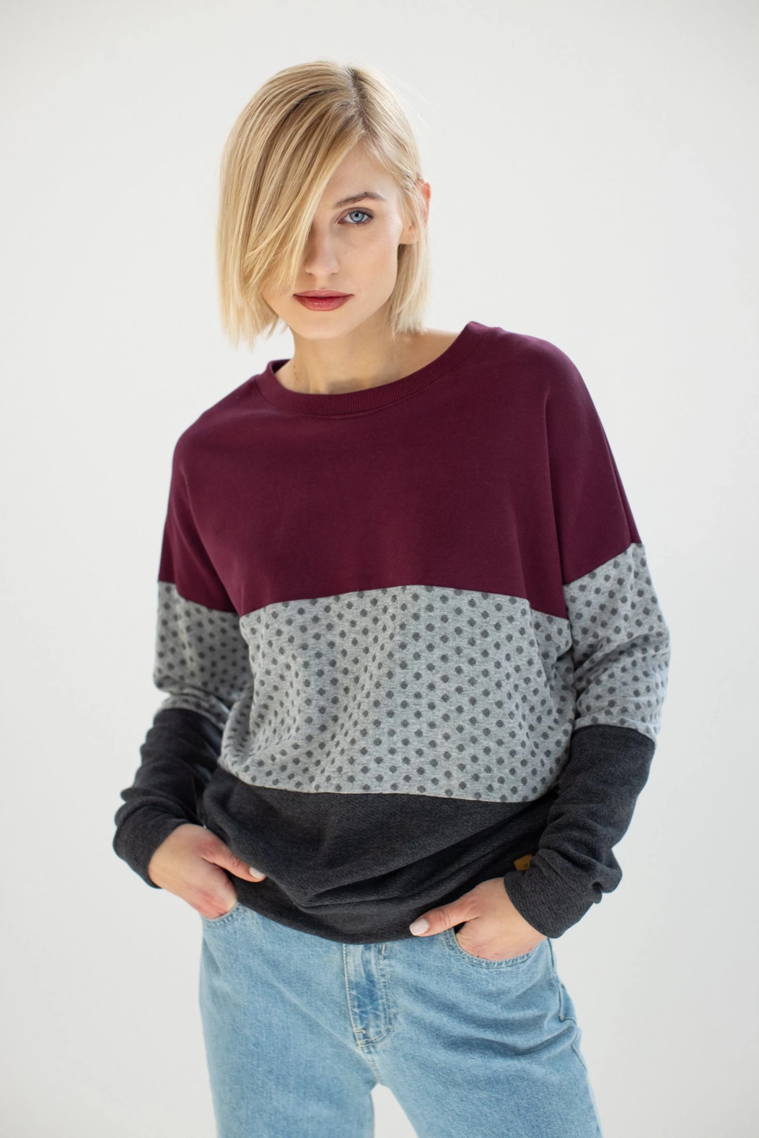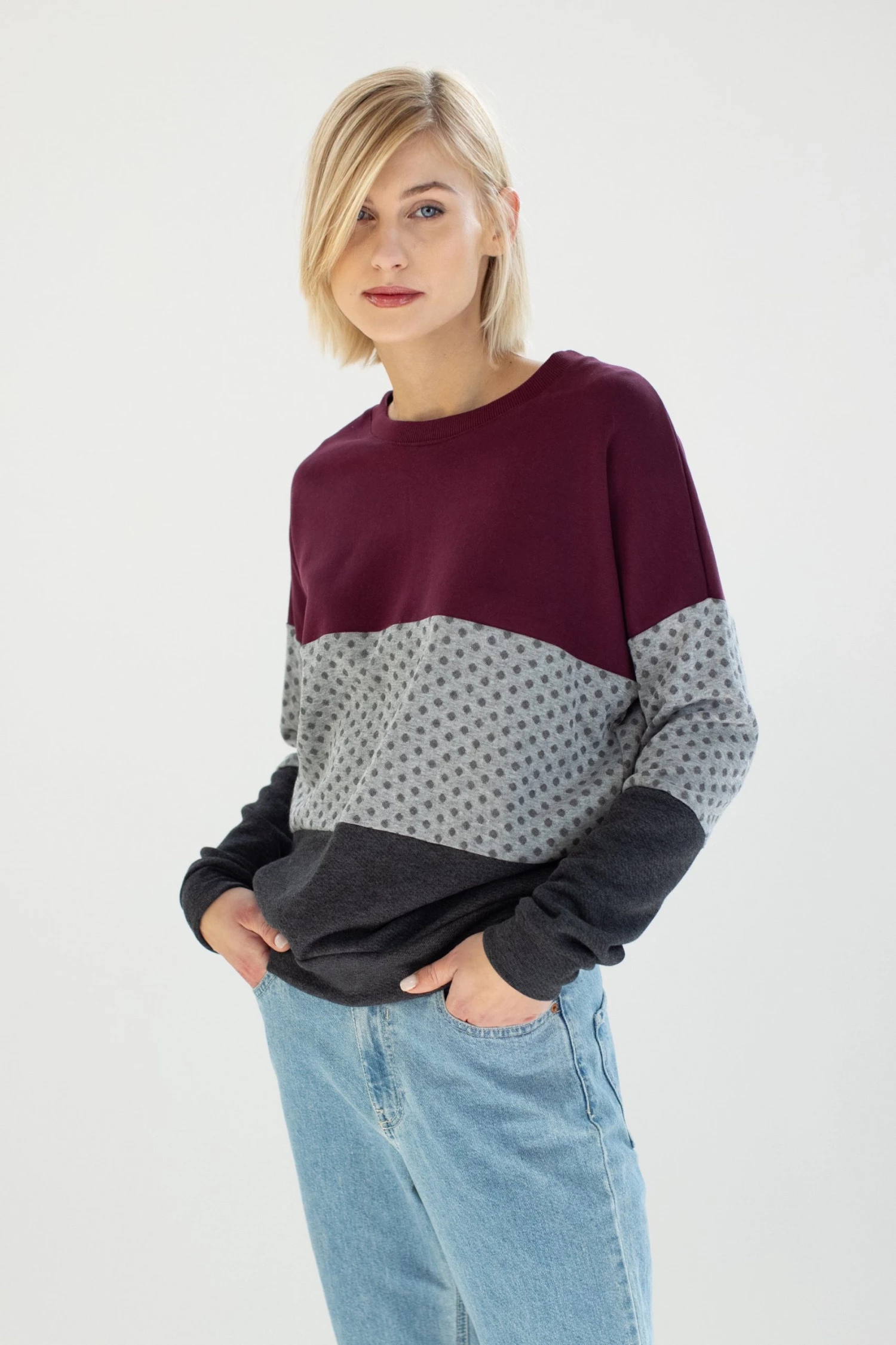 Our favourite sweater Mia crafted from an old-school colour-blocking design. Dark red at the top, following a cozy light grey coloured fabric with polka dots print in the middle and finishing with a beautiful dark grey colored fabric. A statement sweater, for a fun and cool outfit. Wear with a simple pair of denim and your fave sneakers!Â